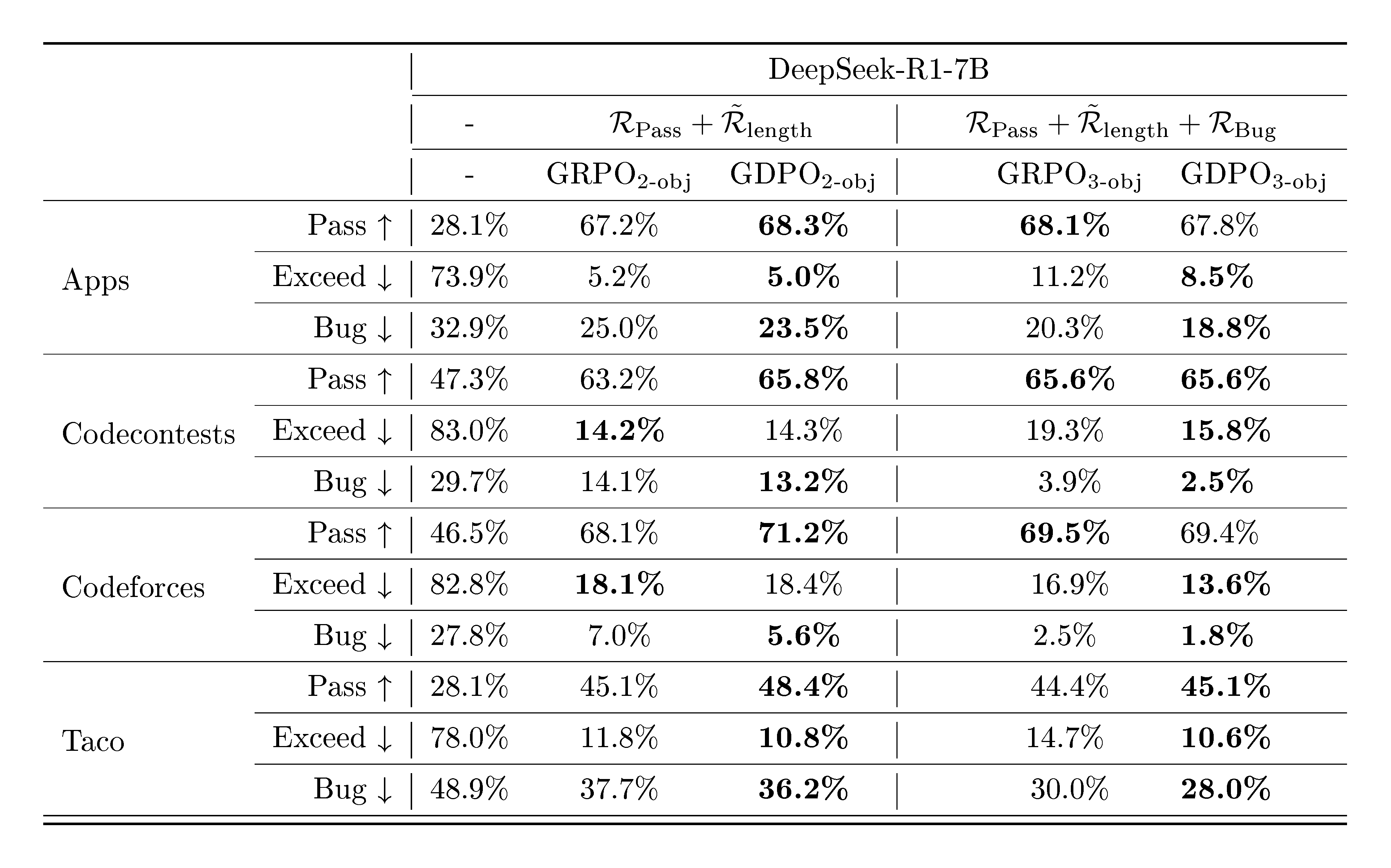 We compare GDPO and GRPO under two configurations: (1) a two-reward setting using $\mathcal{R}{\text{pass}}$ and $\tilde{\mathcal{R}}{\text{length}}$, and (2) a three-reward setting using $\mathcal{R}{\text{pass}}$, $\tilde{\mathcal{R}}{\text{length}}$, and $\mathcal{R}{\text{bug}}$. We denote the two-reward and three-reward versions of GRPO as $\text{GRPO}{\text{2-obj}}$ and $\text{GRPO}{\text{3-obj}}$, and use the same notation for GDPO. As shown in Table 5, $\text{GDPO}{\text{2-obj}}$ improves pass rates across all the tasks compared with $\text{GRPO}{\text{2-obj}}$, while maintaining a similar length-exceeding ratio. For example, $\text{GDPO}{\text{2-obj}}$ improves the Codecontests pass rate by 2.6% while increasing the length-exceeding ratio by only 0.1%, and achieves a 3.3% pass rate gain together with a 1% reduction in length violations compared with $\text{GRPO}{\text{2-obj}}$ on Taco. A similar pattern holds in the three-reward setting where $\text{GDPO}{\text{3-obj}}$ achieves a substantially better balance across all objectives, maintaining similar pass rate to $\text{GRPO}_{\text{3-obj}}$ while also markedly reducing both the length-exceeding ratio and the bug ratio.