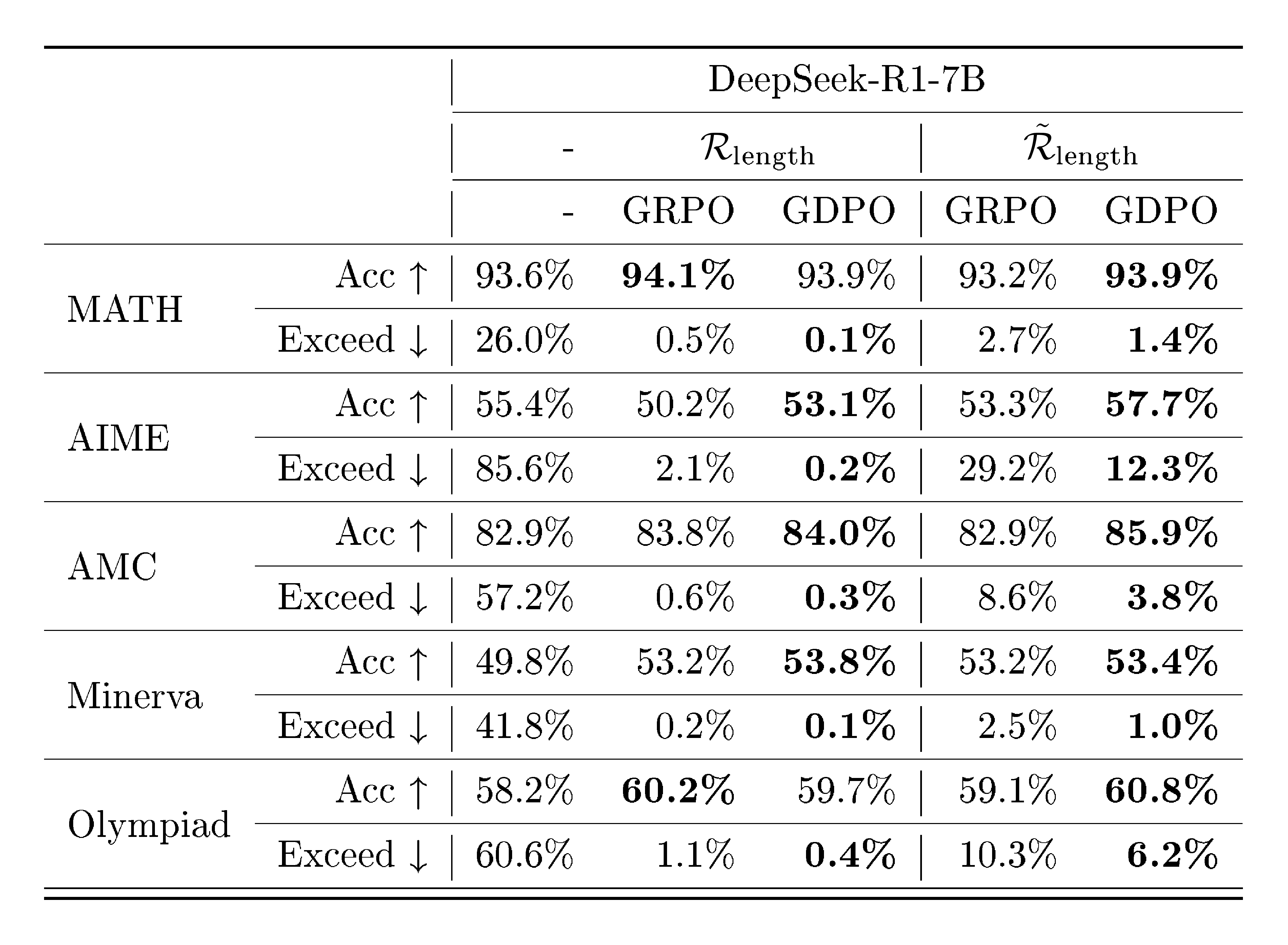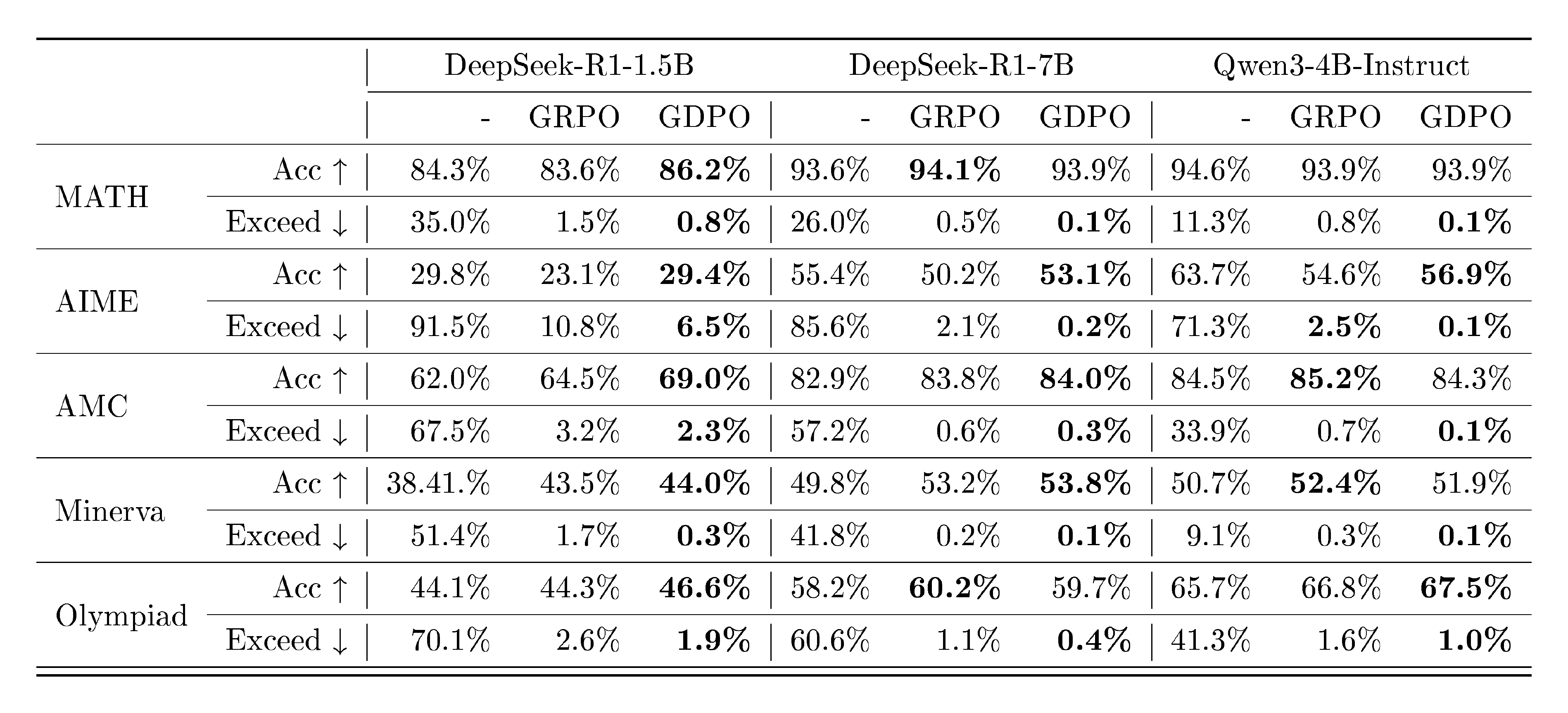 We compare the GRPO and GDPO-trained model on AIME-24 [23], AMC (AMC 2022 and AMC 2023) [24], MATH [25], Minerva [26] and Olympiad Bench [27]. All evaluations are conducted using vLLM as the inference backend with a sampling temperature of 0.6, $top_p$ = 0.95, and a maximum response length of 32k tokens. For each evaluation question, we generate 16 samples and report the average pass@1 score and the average length-exceeding ratio, denoted Exceed, which measures the percentage of model responses that exceed the predefined length limit of 4000 tokens.