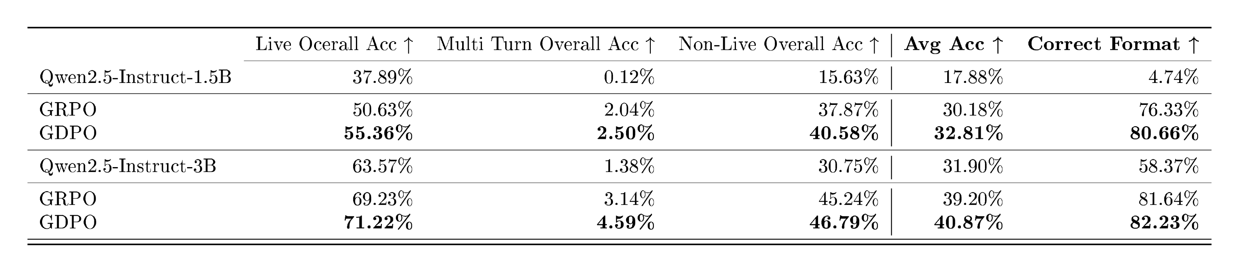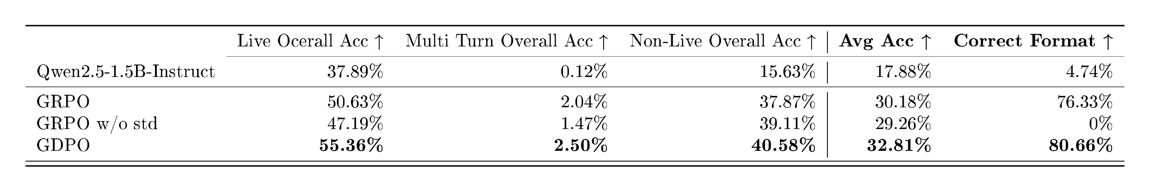 ::: {caption="Table 2: Comparison of GRPO, GRPO w/o std, and GDPO-trained Qwen2.5-Instruct-1.5B/3B models on tool-calling accuracy and format correctness.The reported results are the average across five runs."}
