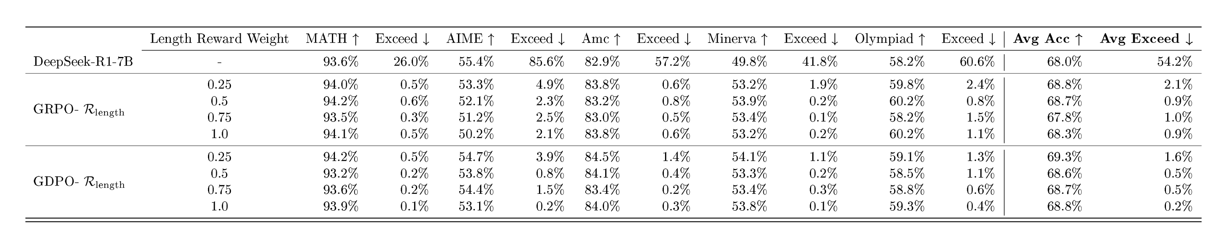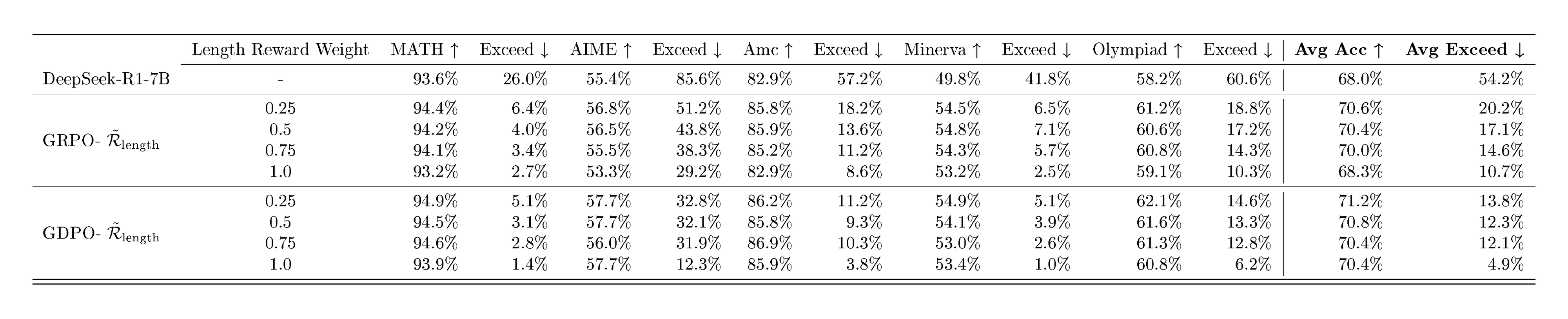From Table 4, we also observe that using $\tilde{\mathcal{R}}{\text{length}}$ leads to a larger increase in the average length-exceeding ratio for both GRPO and GDPO compared with merely adjusting the weight $w{\text{length}}$ of $\mathcal{R}{\text{length}}$, indicating a more effective relaxation of the length constraint. However, GRPO fails to convert this relaxed constraint into meaningful accuracy improvements. In contrast, GDPO prioritizes the correctness reward more effectively and achieves more consistent accuracy improvement over training without $\tilde{\mathcal{R}}{\text{length}}$, while introducing substantially smaller increases in length violations. For instance, using $\tilde{\mathcal{R}}{\text{length}}$ with GDPO yields a 4.4% accuracy improvement on AIME with a 16.9% reduction in length-exceeding ratio, and a 3% accuracy gain on AMC with a 4.8% reduction in length violations compared with using GRPO with the same reward.