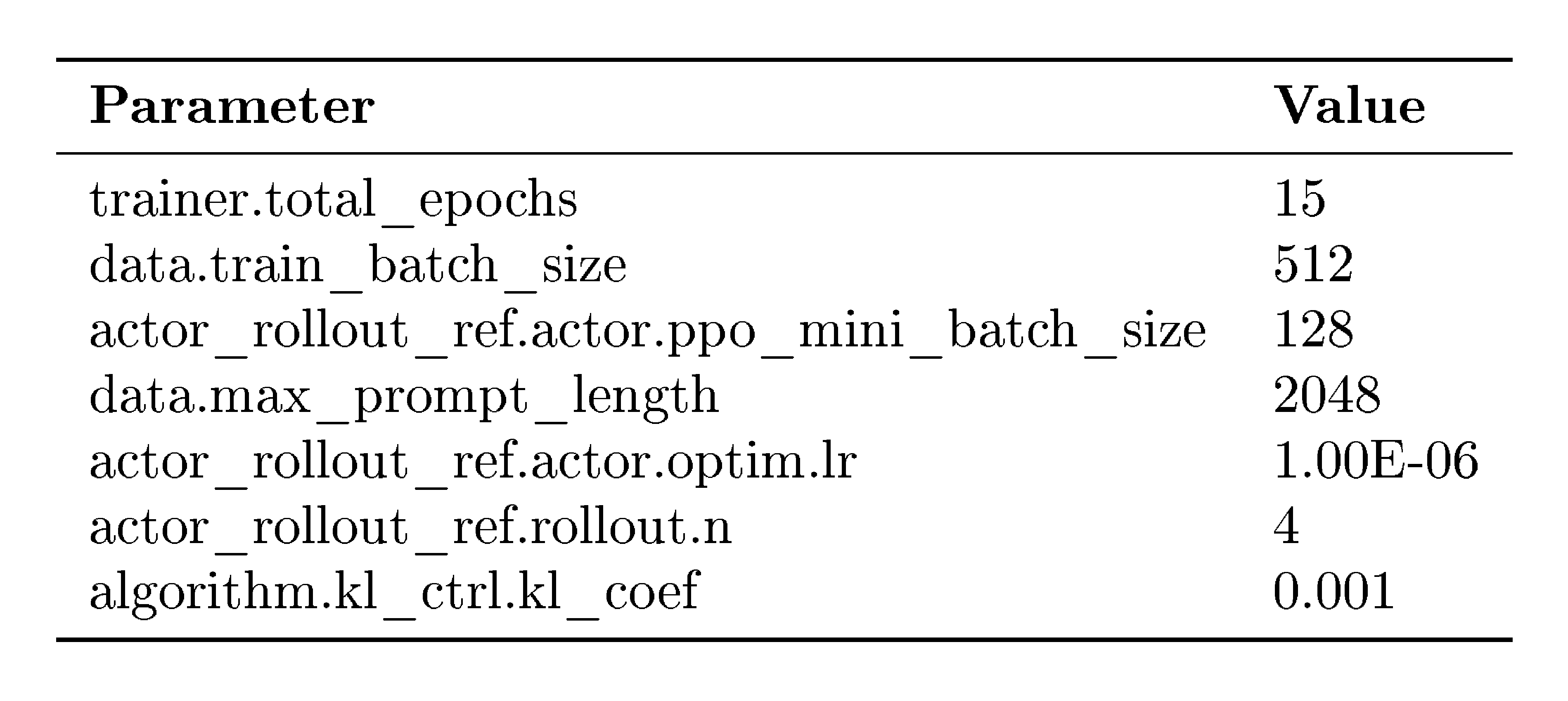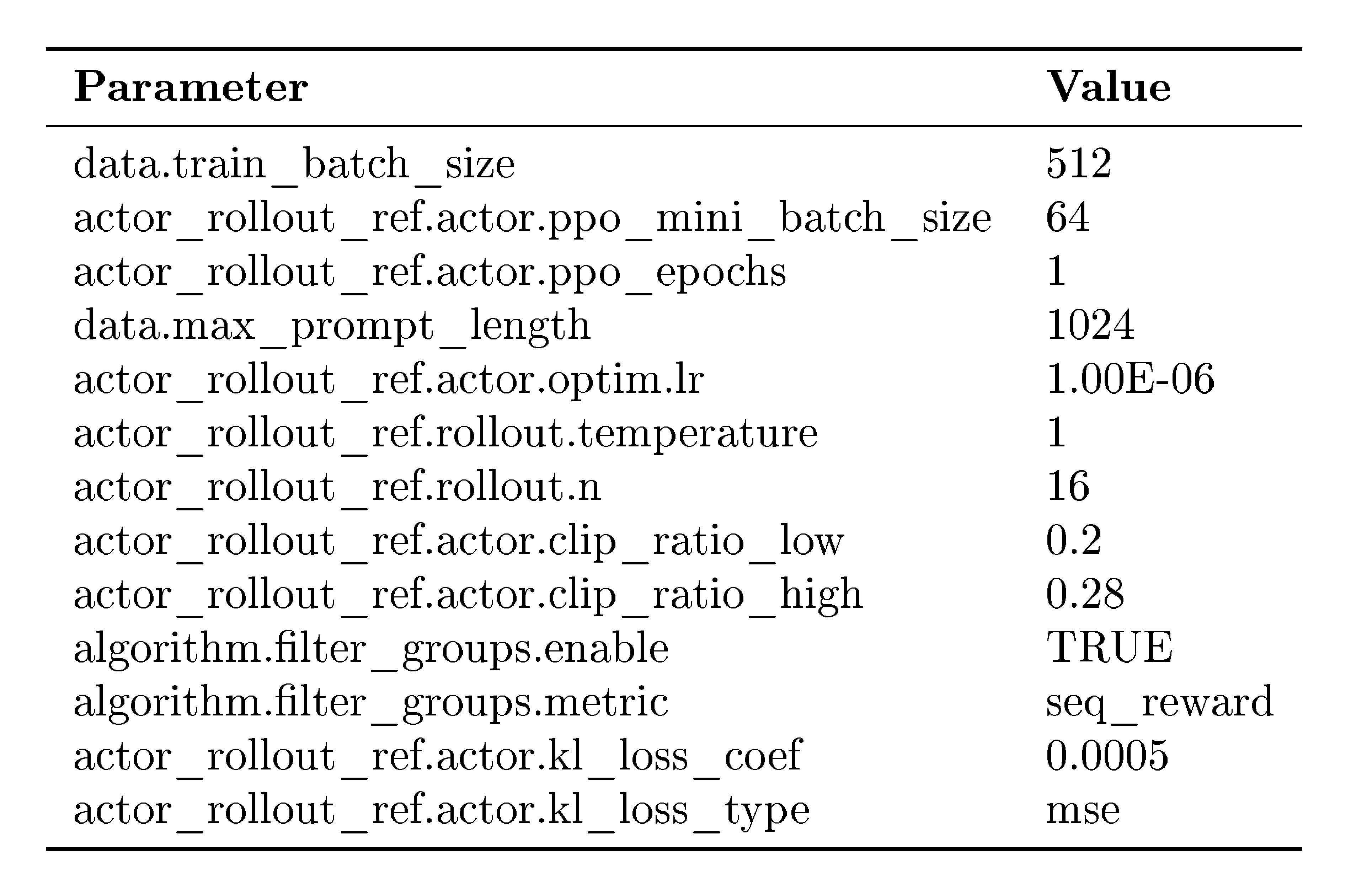 ::: {caption="Table 6: GDPO verl training configuration. All hyperparameter settings are kept identical to those used in ToolRL [12]."}