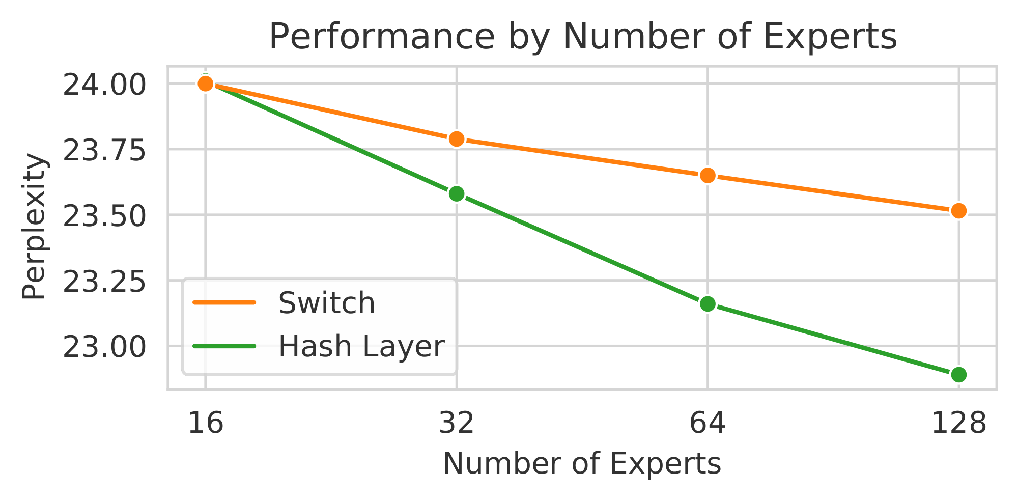Hash layer module size We conduct the same pushshift.io Reddit experiments as above, but altering the number of expert modules in both Hash and Switch. Increasing from 64 to 128 modules (1.28B parameters total) sees an even larger improvement of Hash over Switch (about 0.6 perplexity), see Table 1 (rows 6 and 7), and Figure 2 (left). Trying smaller numbers of modules, 16 and 32, and plotting all the results in Figure 3 (left) we see that for small numbers of modules Hash and Switch perform similarly, but the gap grows larger as the number of modules increases. For small numbers of modules, we hypothesize that learning to route, as Switch does, would be more important to be performant with those choices, but with larger numbers of modules many routing choices could work. Hence, Hash layers can work well in that setting, and learning to route becomes less important.