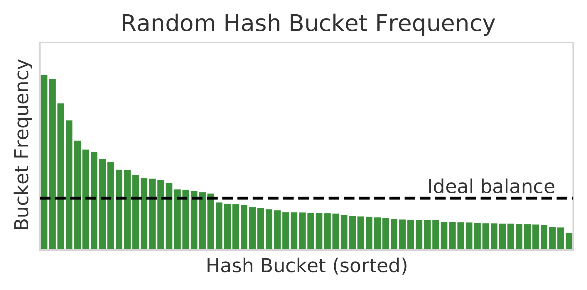 Random and Balanced Hash Functions We find that fixed random assignment (row 3) and balanced assignment (row 2) perform similarly well in terms of perplexity (23.22 vs. 23.16 valid perplexity). However, balanced assignment, as its name suggests, is more balanced, see Figure 4, which may render it more efficient in terms of distributed training schemes.
