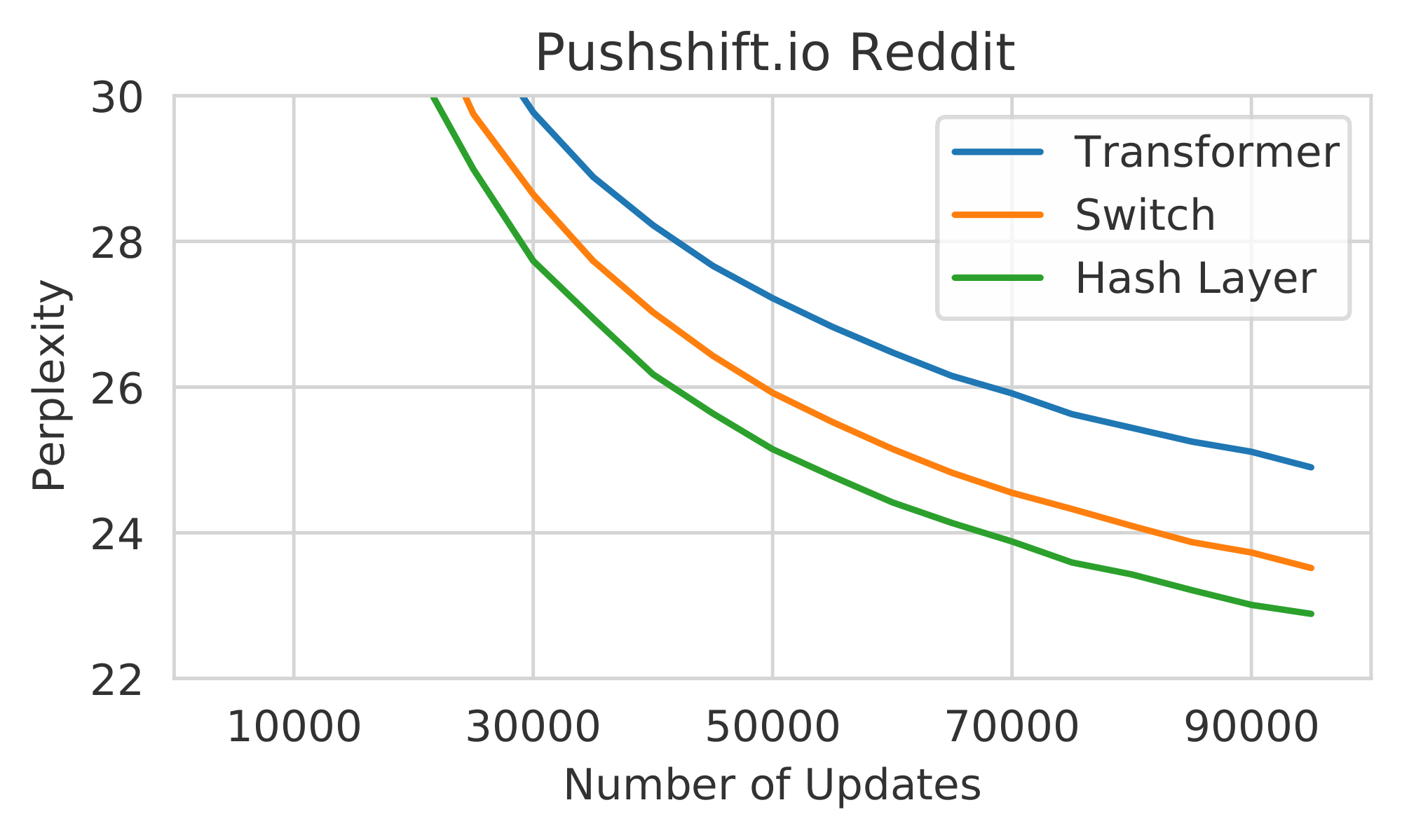 Hash vs. Switch routing on a single layer We first compare a Hash layer (with balanced hash) to a Switch layer, on an otherwise dense Transformer, where sparse routing is performed on layer 7 of the decoder. Both methods use 64 expert FFNs with 751M total parameters. Results on pushshift.io Reddit are given in Table 1 (rows 4 and 5) and on the RoBERTa+cc100en data in Table 2 (rows 2 and 3). We find Hash Layers outperforming Switch on both datasets by about 0.4-0.5 perplexity.