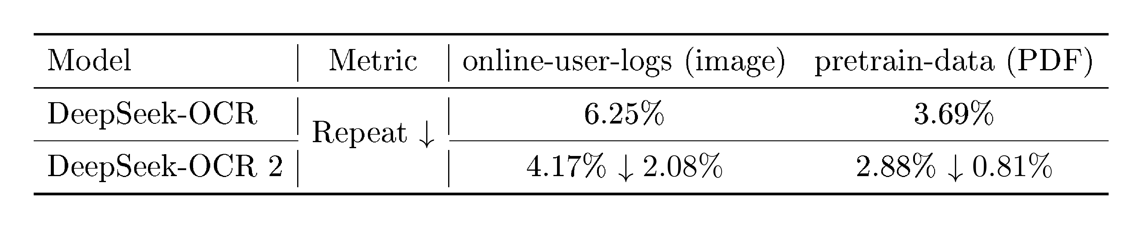 ::: {caption="Table 4: Production performance comparison between DeepSeek-OCR and DeepSeek-OCR 2. For OCR models serving LLM pipelines, ground truth is not accessible in production environments. Therefore, Repetition rate constitutes the primary observable quality metric."}