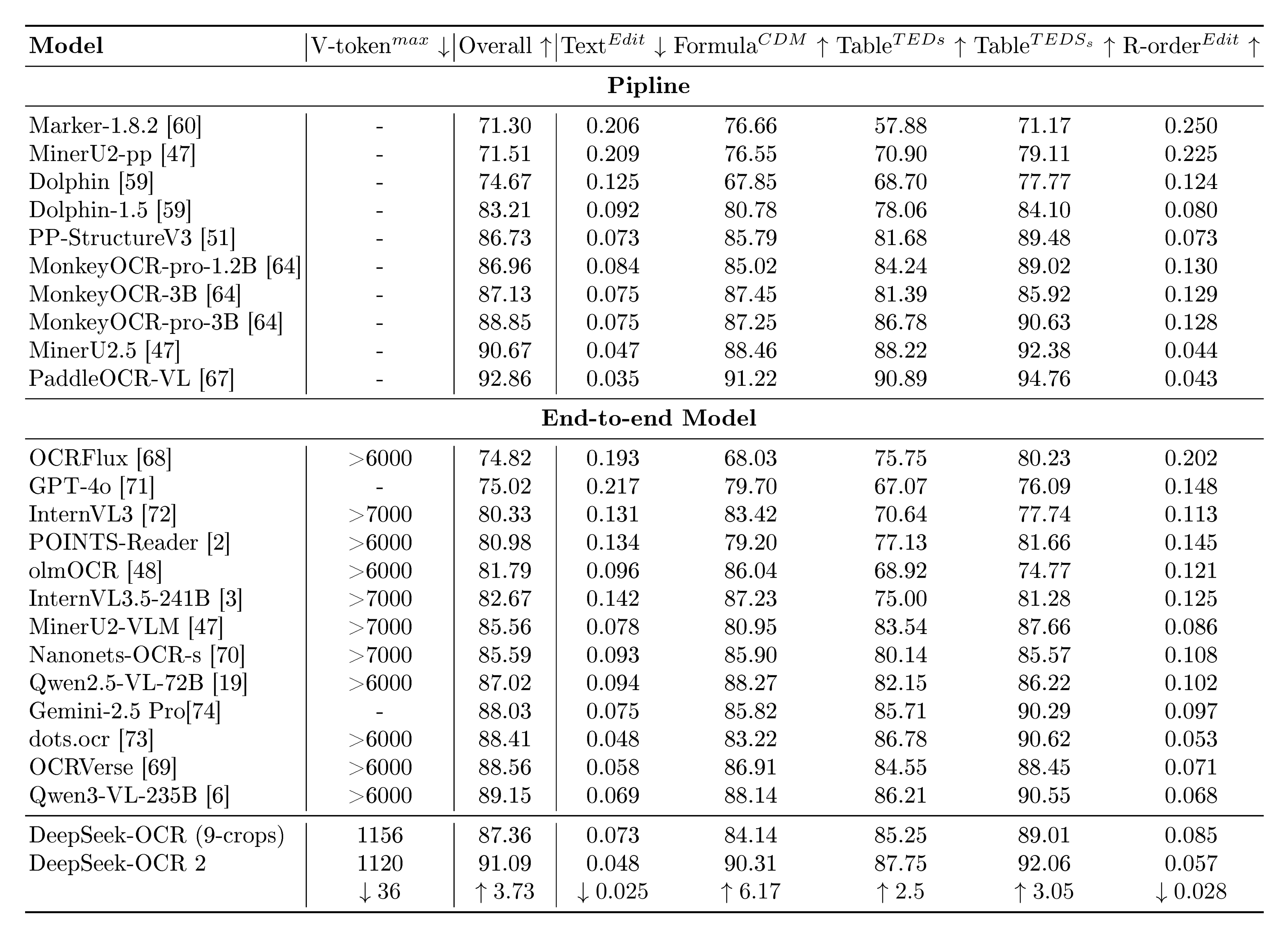 As shown in Table 1, DeepSeek-OCR 2 achieves advanced performance of 91.09% while using the smallest upper limit of visual tokens (V-token$^{max}$). Compared to the DeepSeek-OCR baseline, it demonstrates a 3.73% improvement under similar train data sources, validating the effectiveness of our newly designed architecture. Beyond the overall improvement, the Edit Distance (ED) for reading order (R-order) has also significantly decreased (from 0.085 to 0.057), indicating that the new DeepEncoder V2 can effectively select and arrange initial visual tokens based on image information. As illustrated in Table 2, DeepSeek-OCR 2 (0.100) achieves lower ED in document parsing compared to Gemini-3 Pro (0.115) under a similar visual token budget (1120), further demonstrating that our new model maintains high compression rates of visual tokens while ensuring superior performance, with exceptionally high potential.