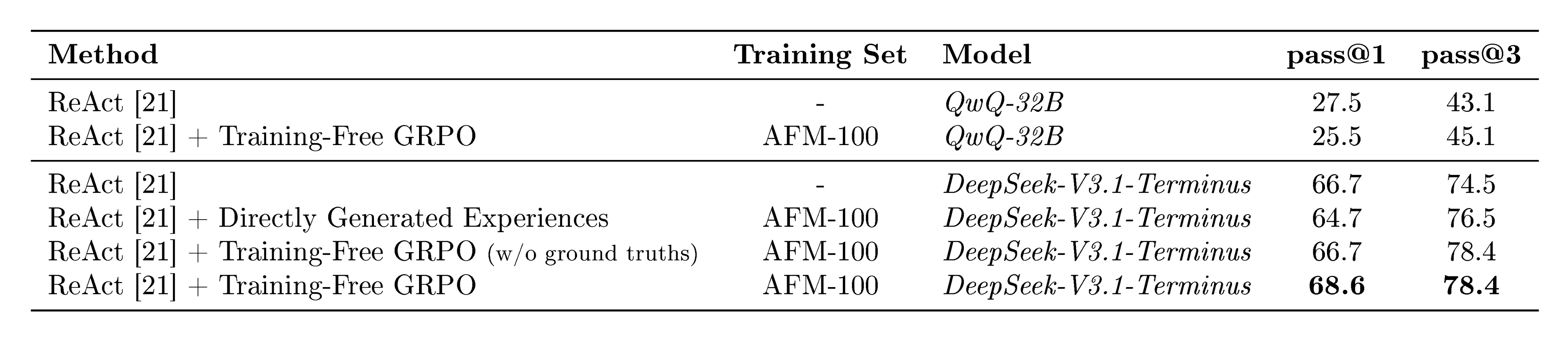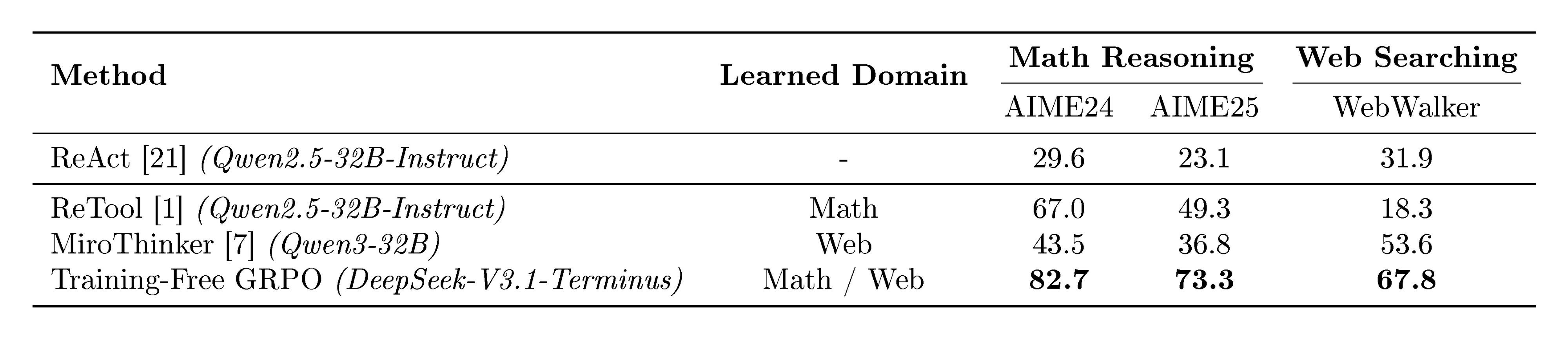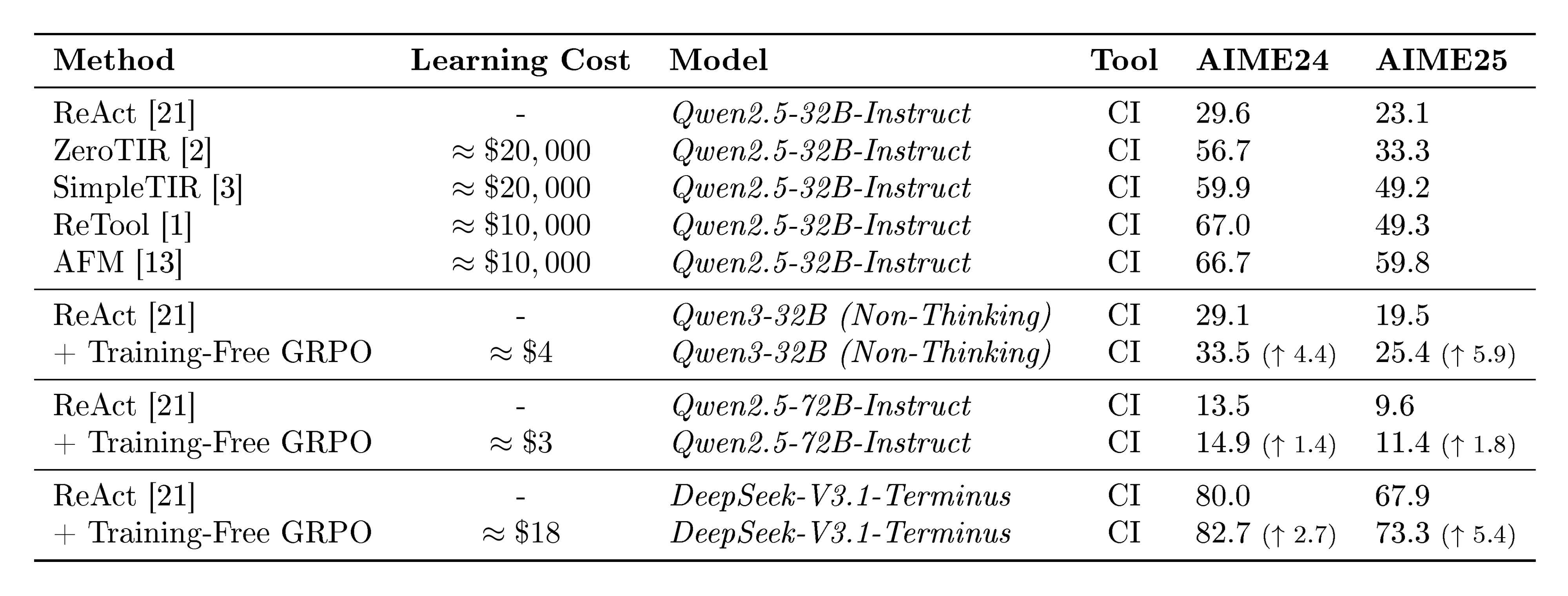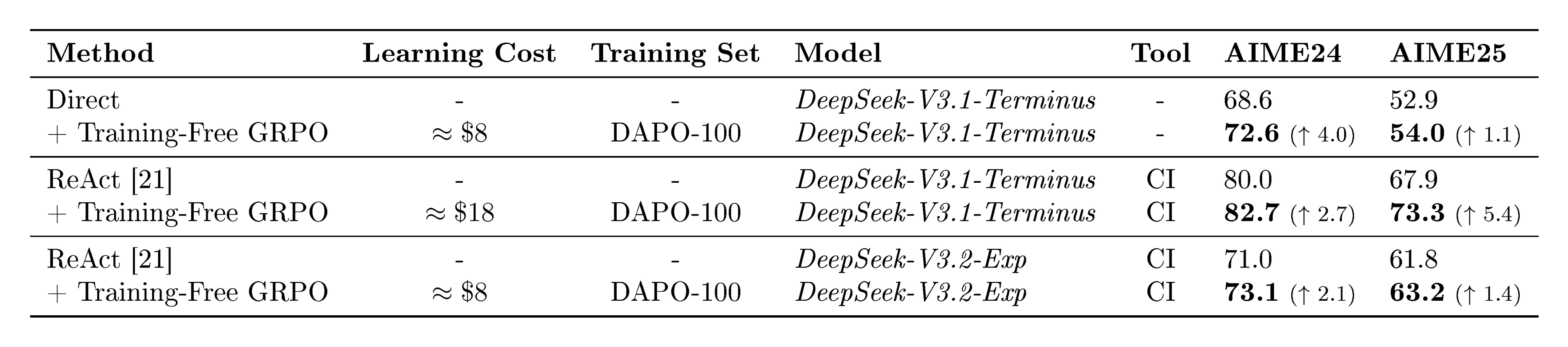 Main Results. As illustrated in Table 3, Training-Free GRPO achieves substantial gains in mathematical reasoning, showing a clear advantage in performance across both the tool-use and non-tool-use scenarios. The strong baseline established by DeepSeek-V3.1-Terminus with ReAct ([21]) yields scores of $80.0%$ on AIME24 and $67.9%$ on AIME25. Critically, applying Training-Free GRPO to the frozen DeepSeek-V3.1-Terminus elevates its performance significantly, reaching $82.7%$ on AIME24 and $73.3%$ on AIME25. This represents a substantial absolute gain of $+2.7%$ and $+5.4%$, respectively, which is achieved with only $100$ out-of-domain training examples and zero gradient updates. This performance surpasses various state-of-the-art RL methods like ReTool ([1]) and AFM ([13]) trained on 32B LLMs (see Table 3), which typically require thousands of training examples and incur costs exceeding $10, 000$. In contrast, Training-Free GRPO utilizes only $100$ data points with an approximate cost of $18$. Such outcome suggests that in real-world applications, guiding a powerful but frozen model through context-space optimization is more effective and efficient than exhaustively fine-tuning a less capable model in parameter space. For quantitative evaluation and learned experiences of Training-Free GRPO, please refer to Appendix A and Appendix C, respectively.