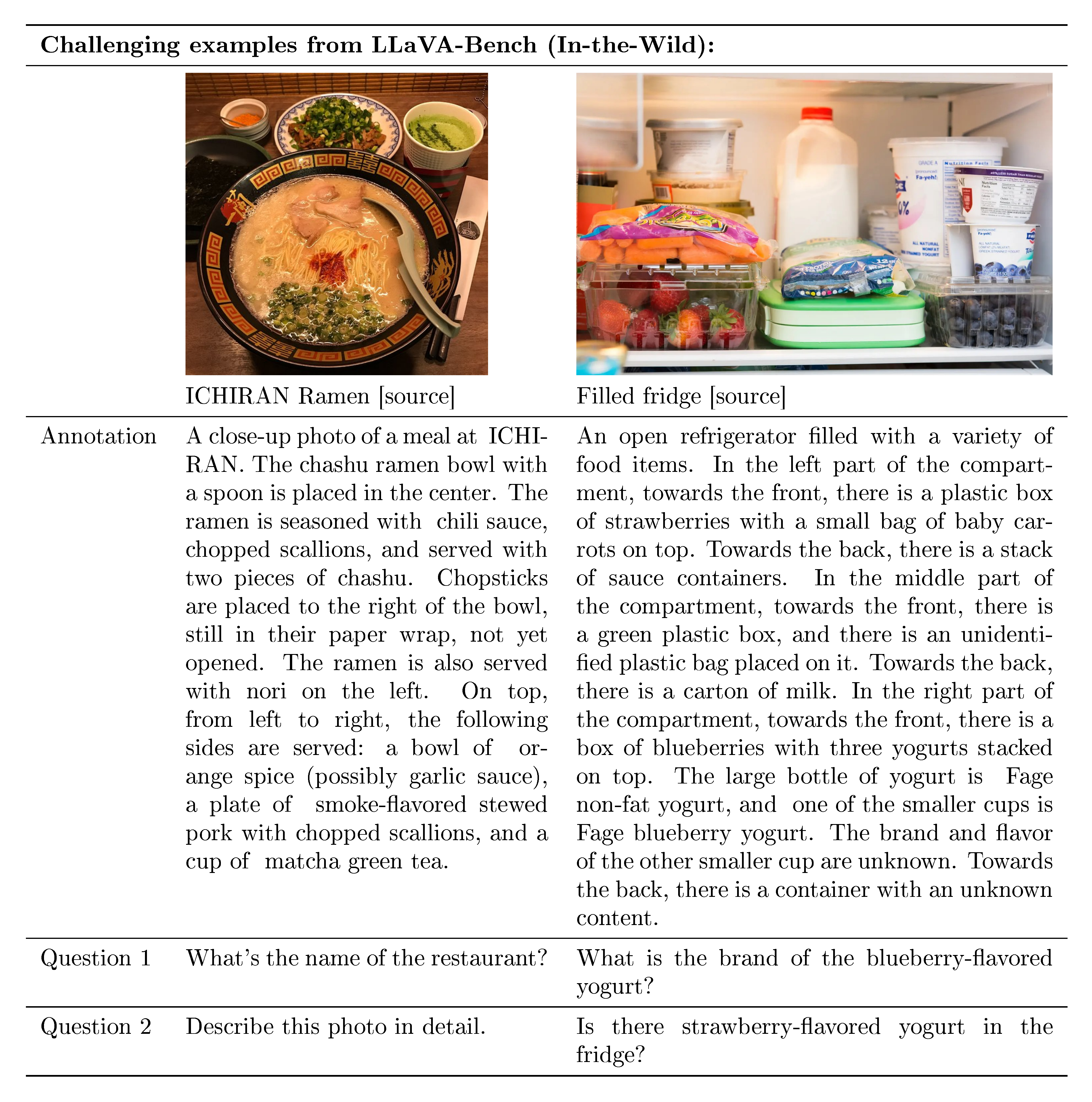 - Multimodal instruction-following benchmark. We present LLaVA-Bench with two challenging benchmarks, with a diverse selection of paired images, instructions and detailed annotations.