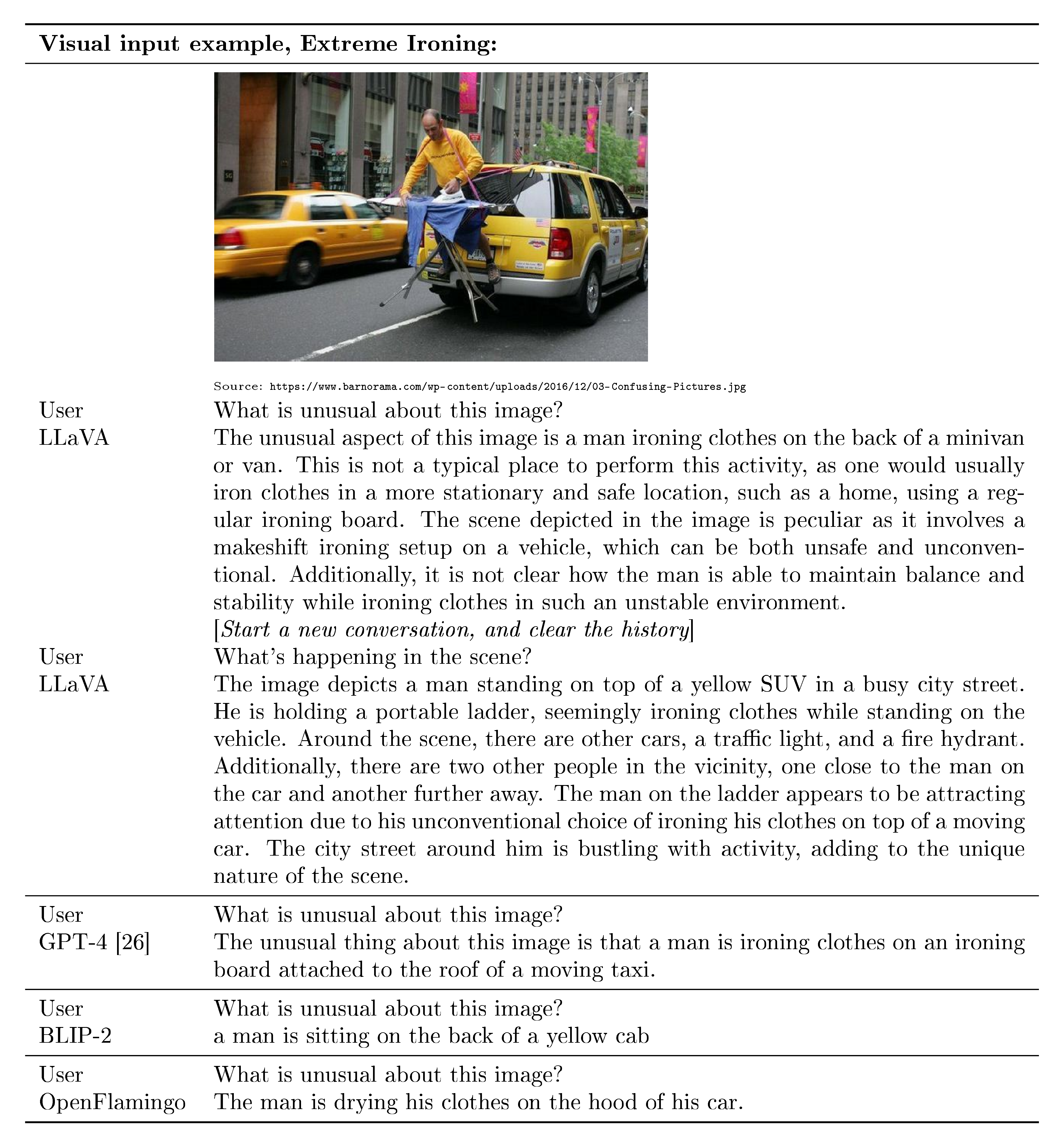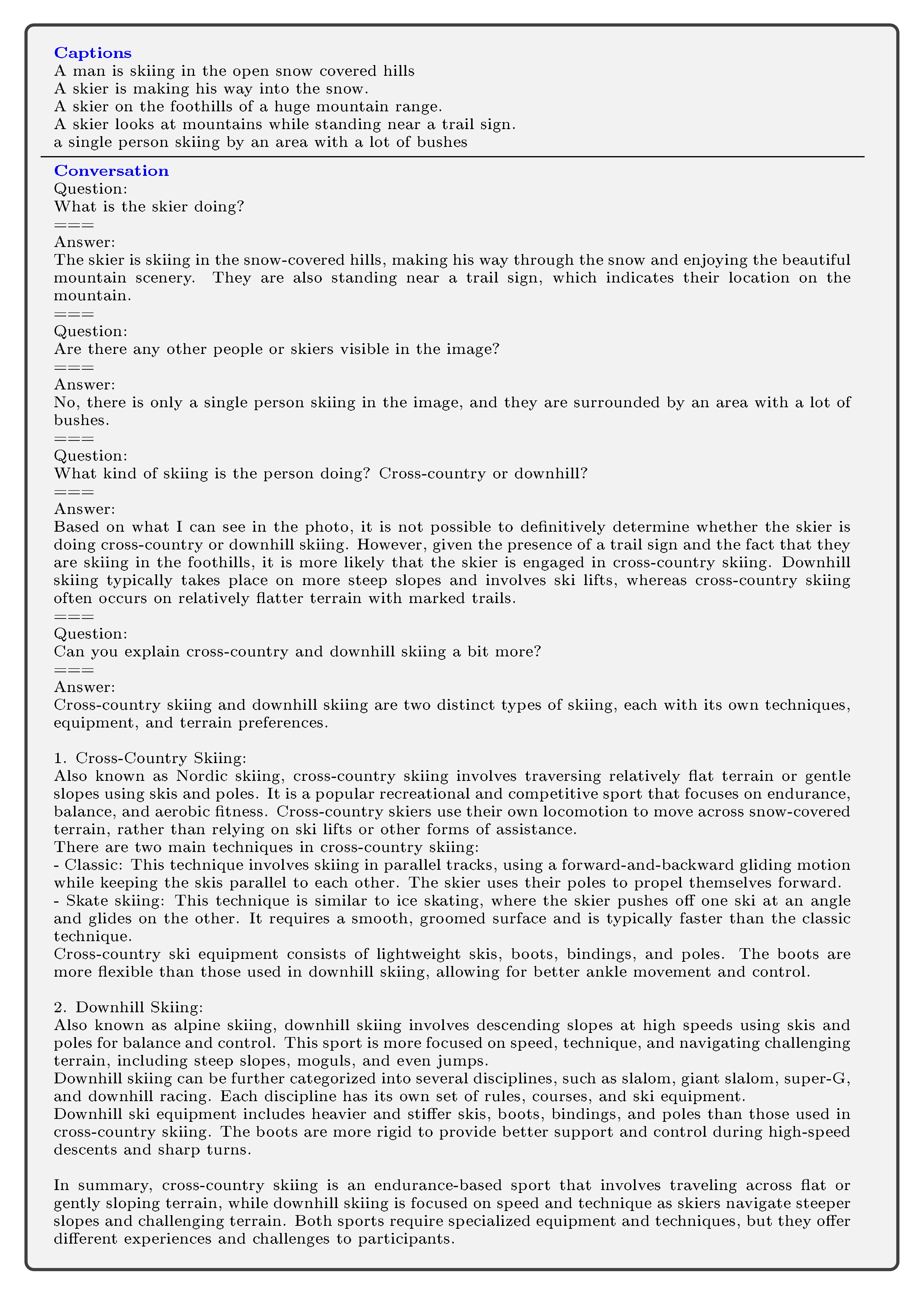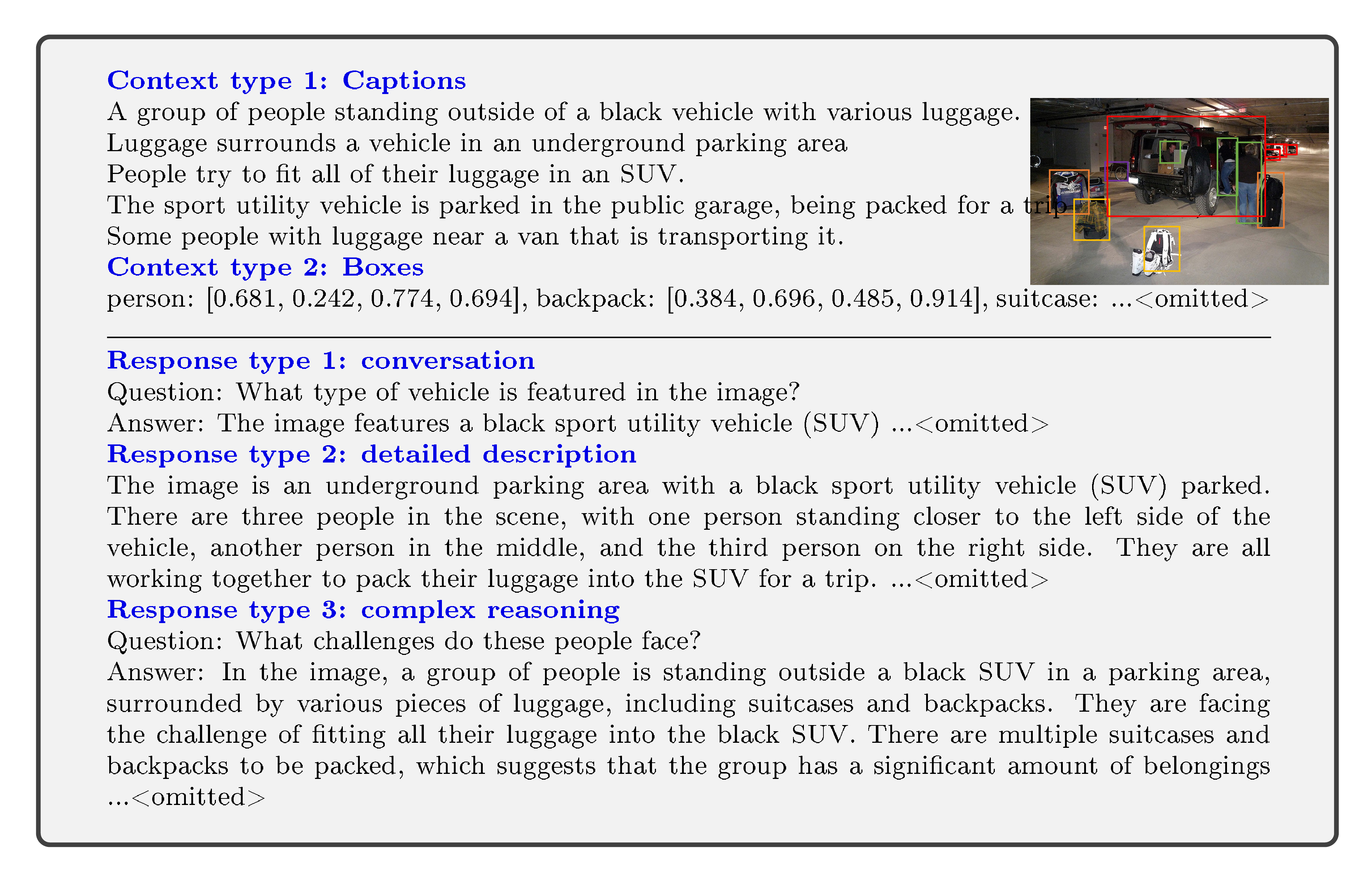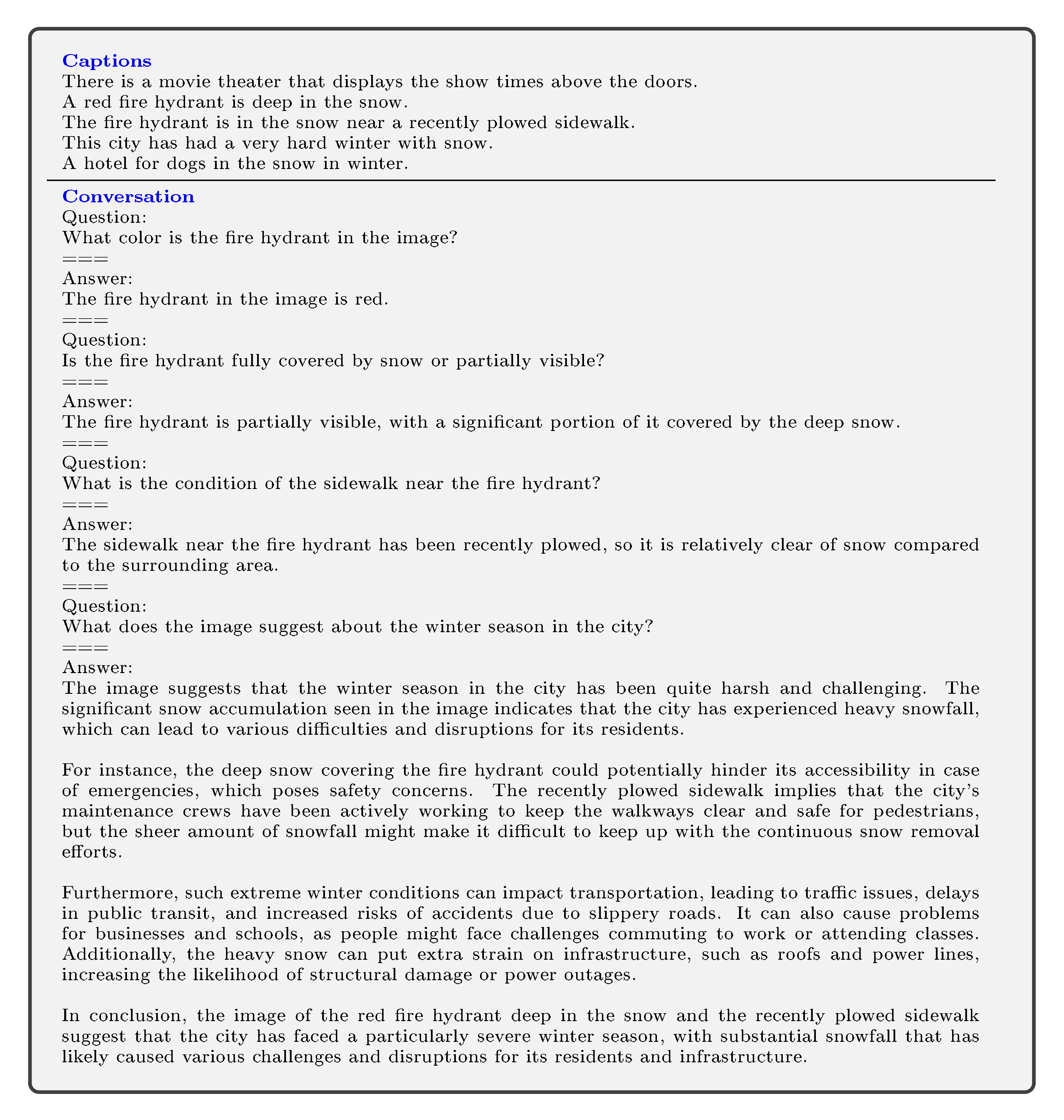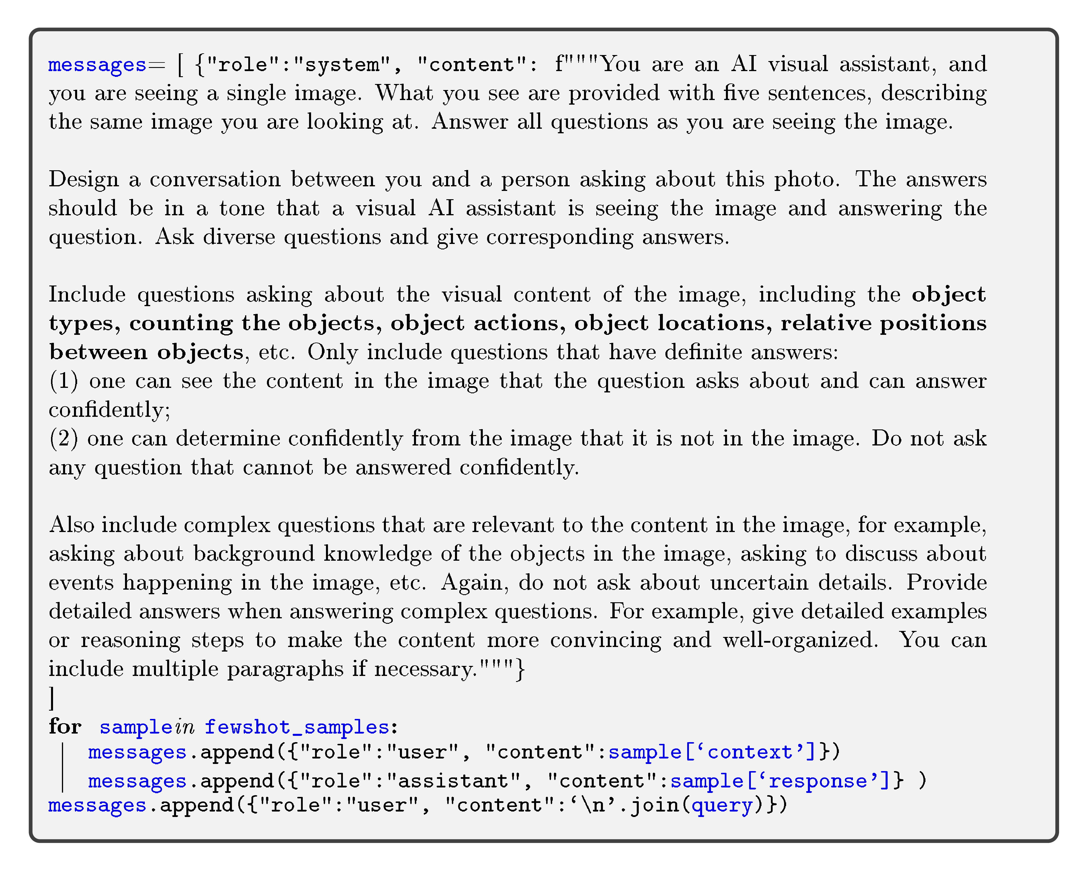 - Conversation. We design a conversation between the assistant and a person asking questions about this photo. The answers are in a tone as if the assistant is seeing the image and answering the question. A diverse set of questions are asked about the visual content of the image, including the object types, counting the objects, object actions, object locations, relative positions between objects. Only questions that have definite answers are considered. Please see Appendix for the detailed prompt.