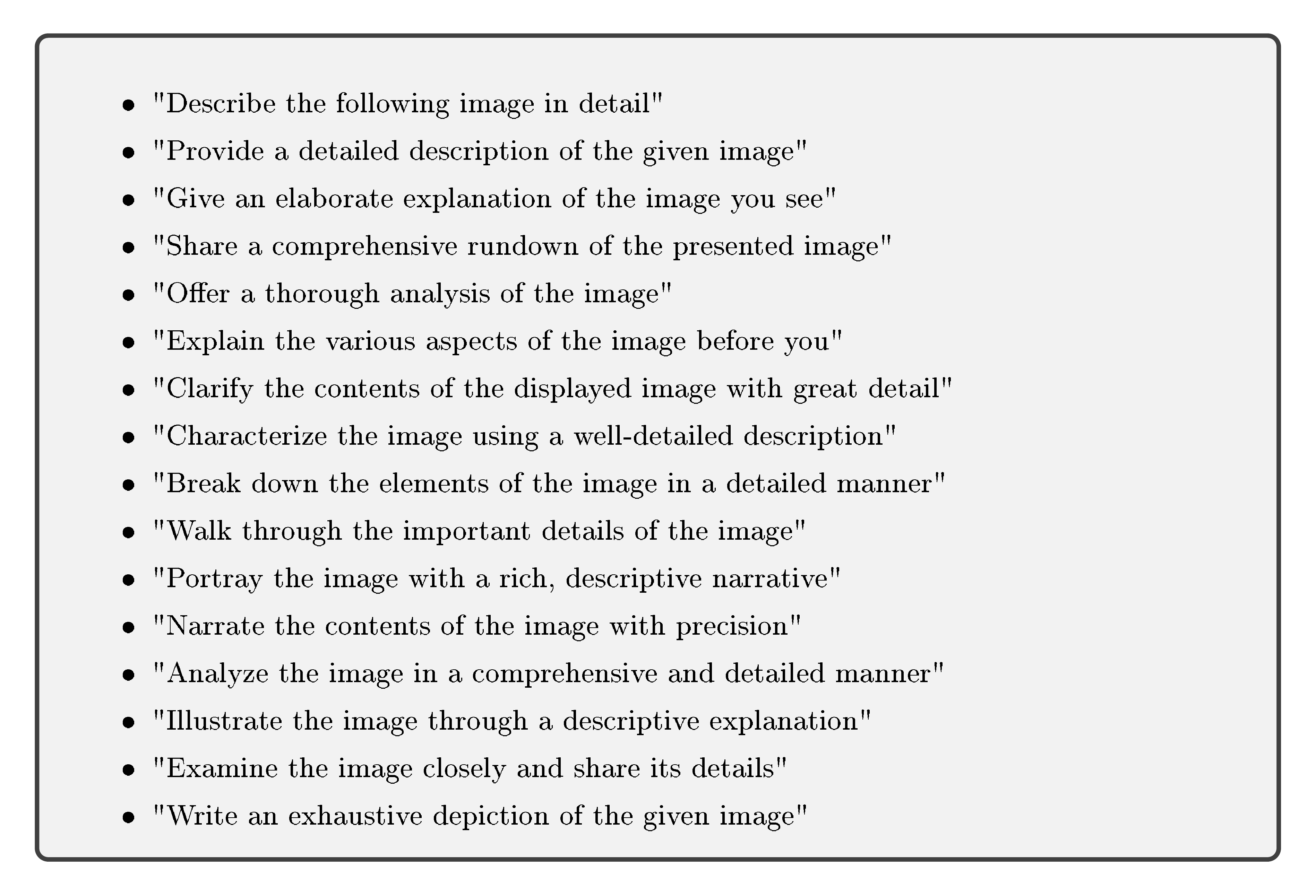 - Detailed description. To include a rich and comprehensive description for an image, we create a list of questions with such an intent. We prompt GPT-4 then curate the list (see detailed prompts and curation process in Appendix). For each image, we randomly sample one question from the list to ask GPT-4 to generate the detailed description.
