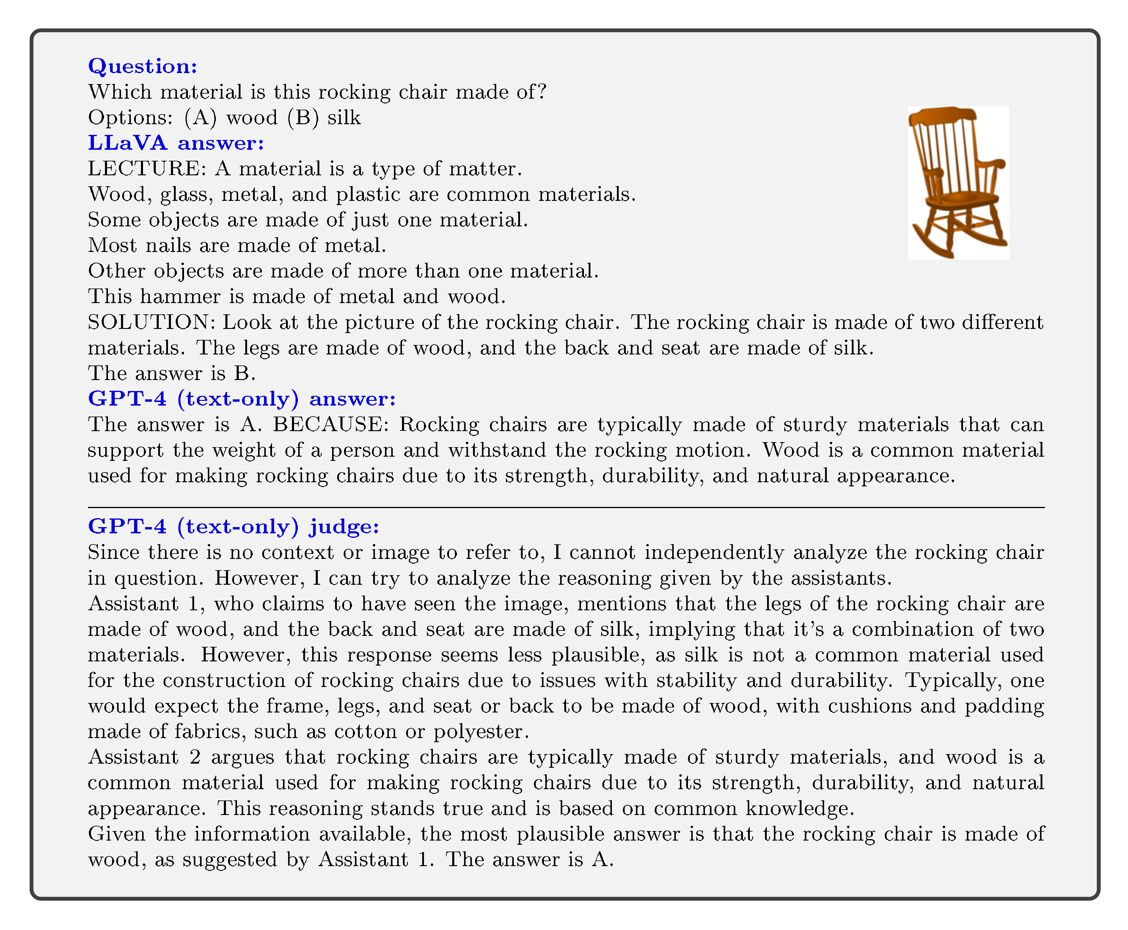 - Science QA. We study our method on the ScienceQA benchmark [31], the first large-scale multimodal science question dataset that annotates the answers with detailed lectures and explanations. Each question is provided a context in the form of natural language or an image. The assistant provides the reasoning process in natural language and selects the answer among multiple choices. For training in Equation 2, we organize the data as a single turn conversation, the question & context as Xinstruct\mathbf{X}_{\text{instruct}}Xinstruct, and reasoning & answer as Xa\mathbf{X}_{\text{a}}Xa.