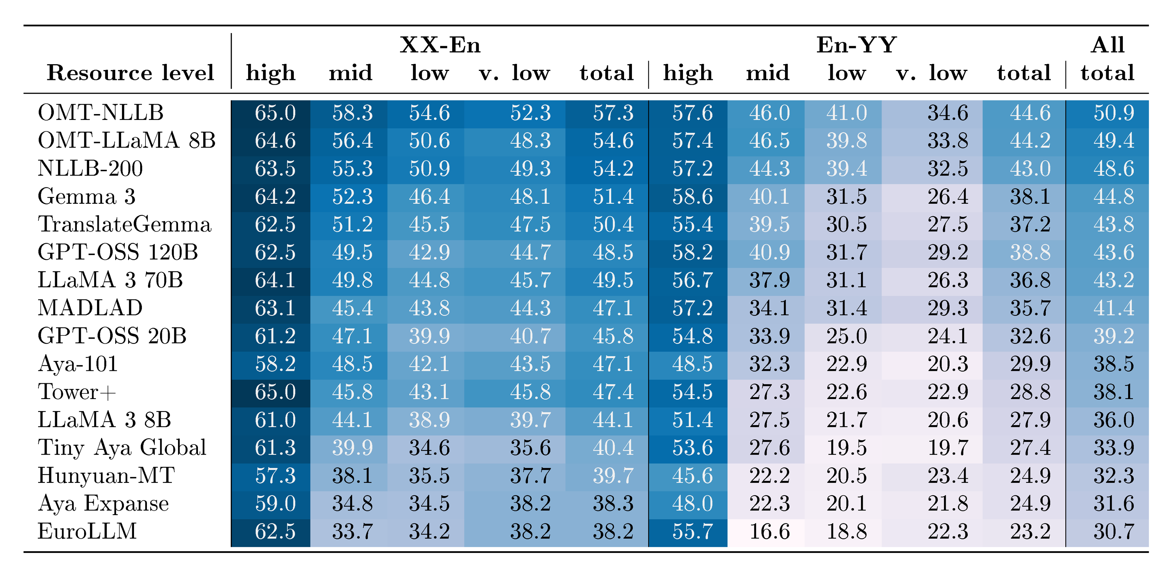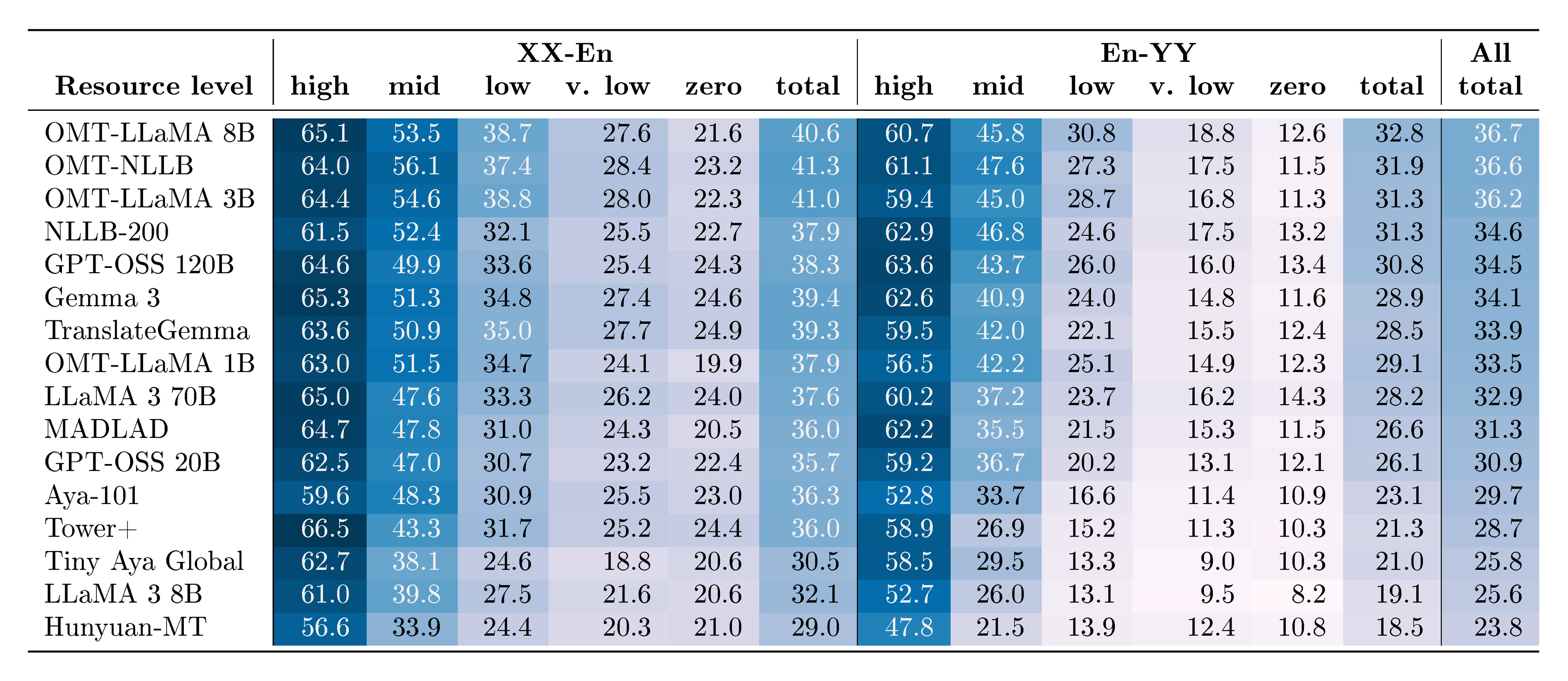 That said, several projects have started to explore scaling MT beyond the 200-language ceiling. Google’s Massively Multilingual Translation work investigated models covering up to 1, 000 languages, offering an early proof of concept that extreme multilingual scaling was technically possible ([2]). These efforts demonstrated that multilingual transfer can be leveraged even in very low-resource conditions. However, they did not yield sustained, or extensible systems, and none produced a practical path for continual expansion. Subsequent multilingual MT systems, including large decoder-only LLMs, mostly reporting MT quality improvements on top priority languages, have also increased language coverage indirectly. Their big-scale pretraining exposes them to a broader, if uneven, range of languages than purpose-built MT systems, allowing them to exhibit surprising zero-shot and few-shot translation abilities. Improvements in reasoning, instruction-following, and cross-lingual representations have also provided new avenues for multilingual transfer. Yet these gains remain dominated by high-resource languages, and large LLMs remain inefficient MT systems—often requiring tens of billions of parameters to match the MT performance of much smaller specialized models (see Section 9).