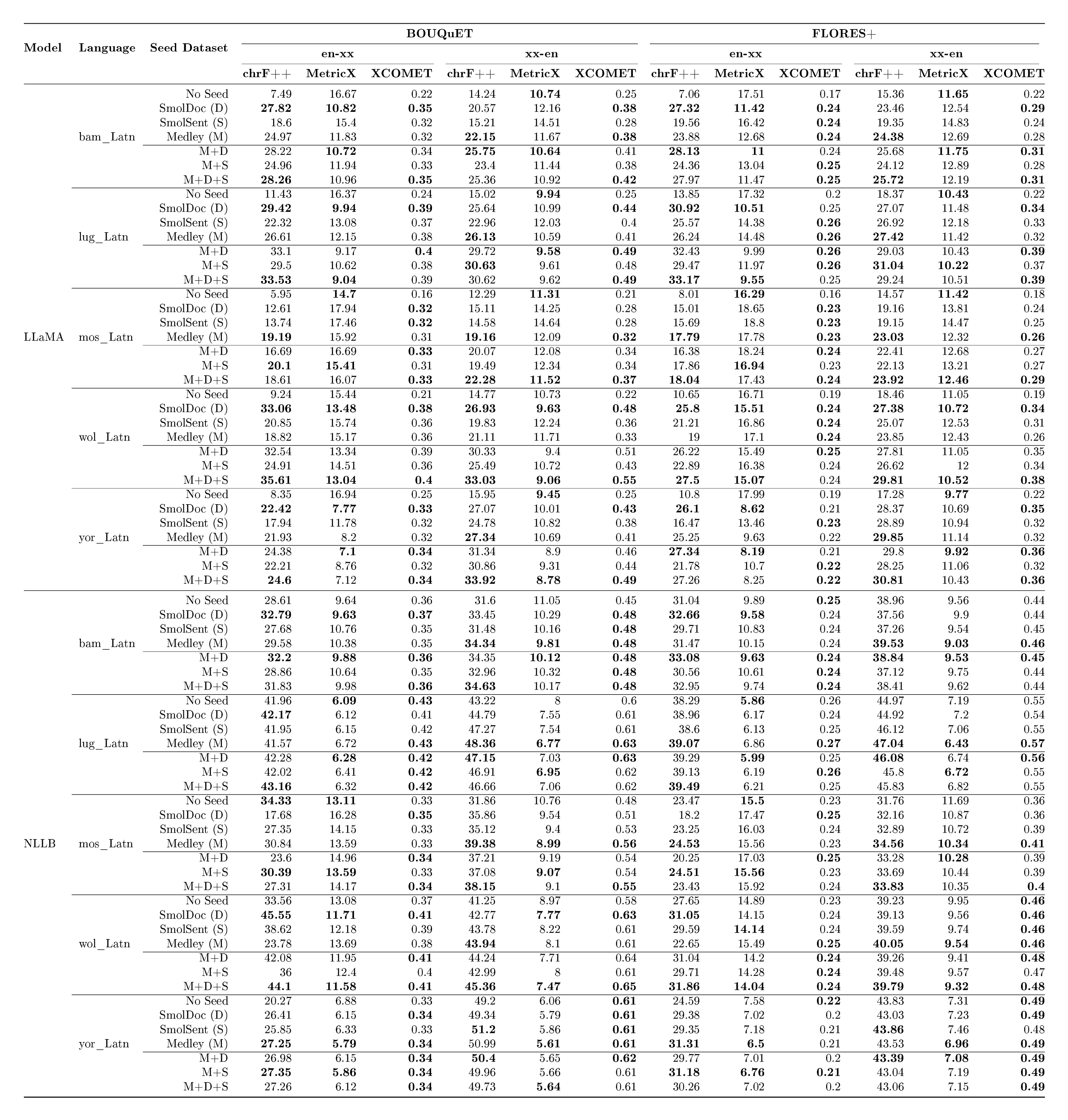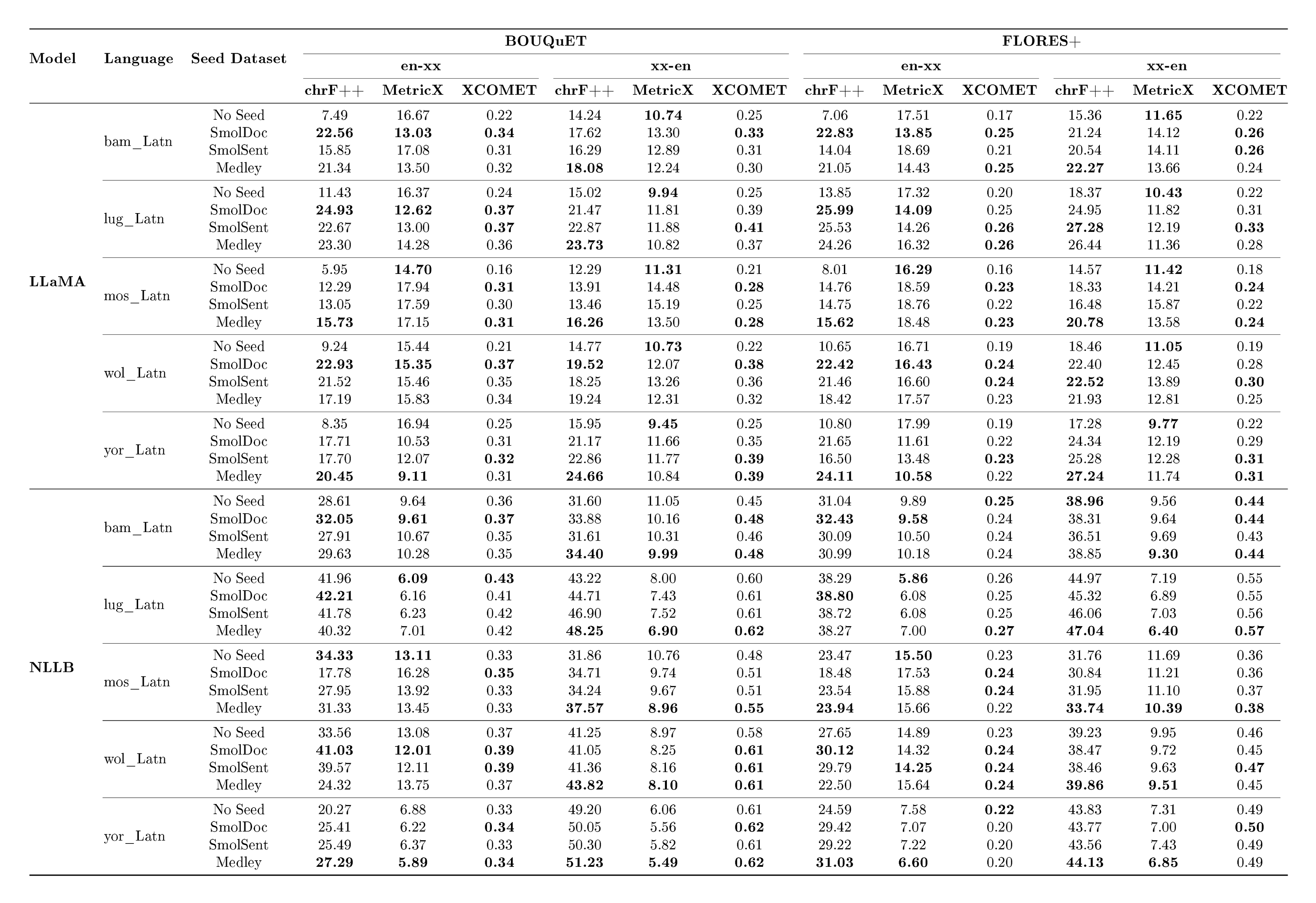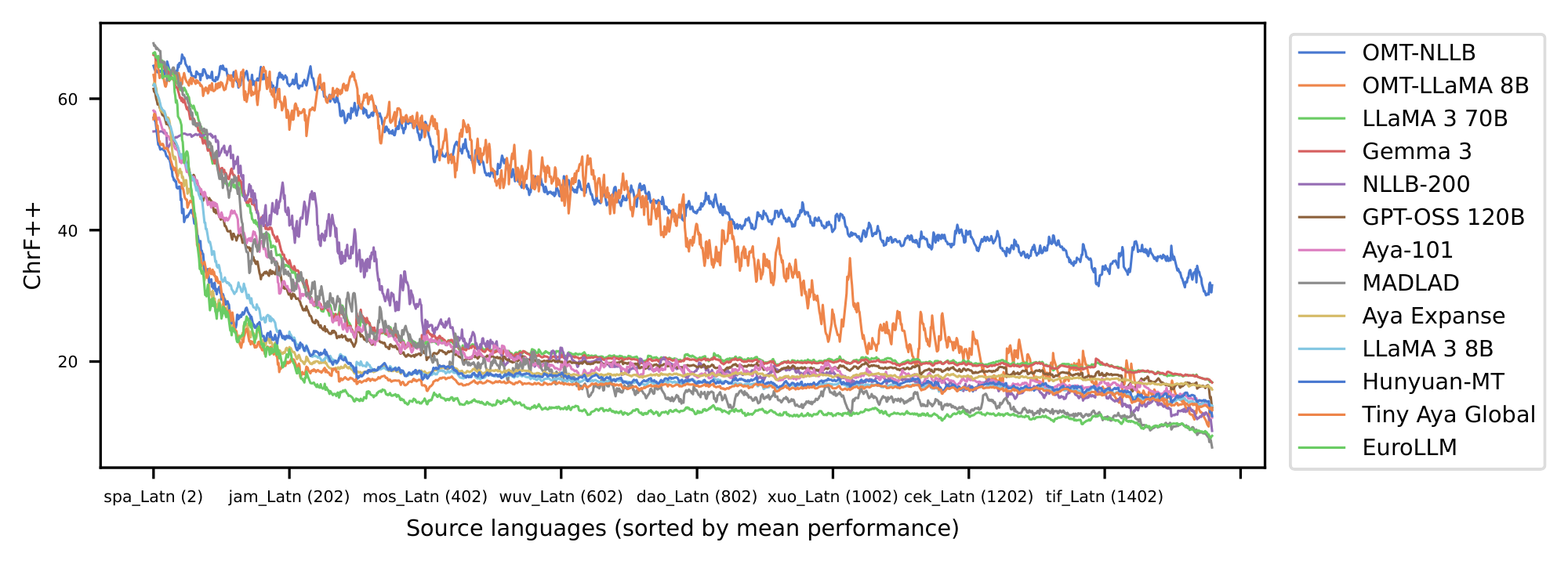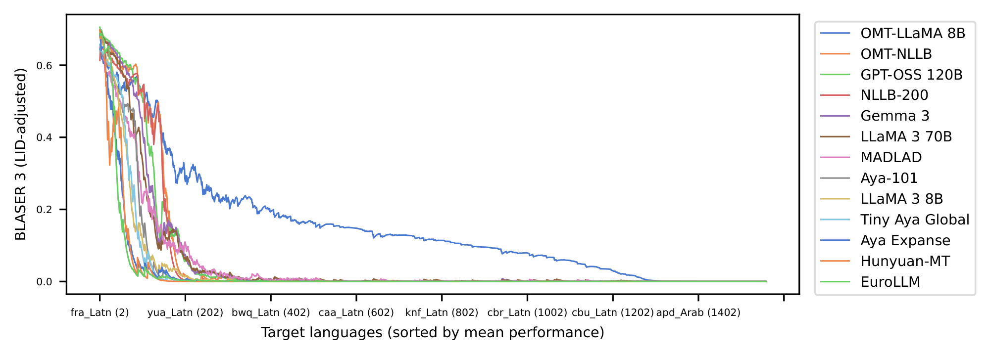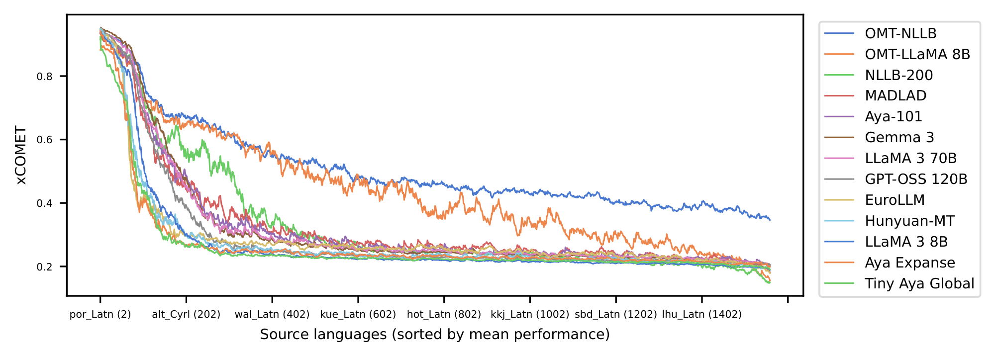 In addition, large-scale evaluation remains a major bottleneck for multilingual MT. FLoRes+ ([14]), and the Aya benchmark ([15]) provide high-quality evaluation for hundreds of languages, but none provide coverage beyond 200–300 languages (there are few recent exceptions to this ([16])) . Reference-based metrics also struggle at scale: BLEU and ChrF++ fail to capture meaning adequacy, while reference-free metrics such as COMET, BLASER 3 and MetricX require careful calibration and validation in typologically diverse languages (see metric cards in Appendix C). Without reliable evaluation for long-tail languages, progress becomes difficult to measure and even harder to compare across systems. This problem becomes acute when scaling to 1, 000+ languages, where many systems can produce outputs that appear fluent yet remain unintelligible or unrelated to the target language, making generation accuracy particularly challenging to assess. The field requires multilingual quality-estimation frameworks that scale to thousands of languages while preserving metric fidelity.