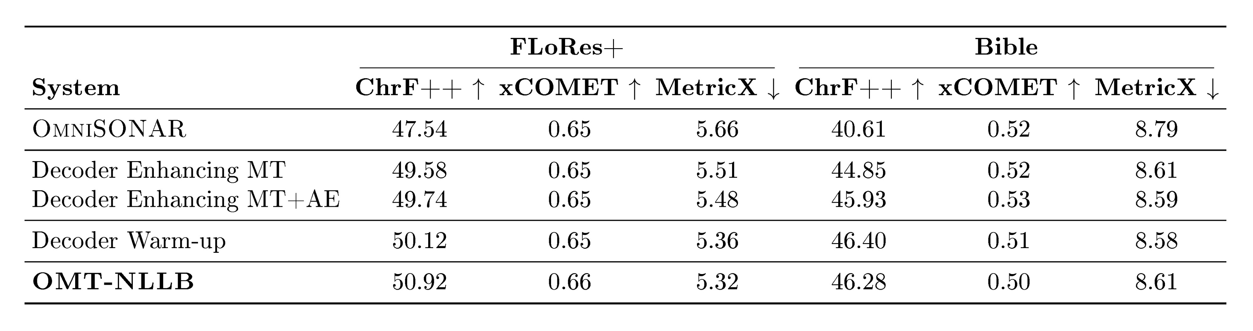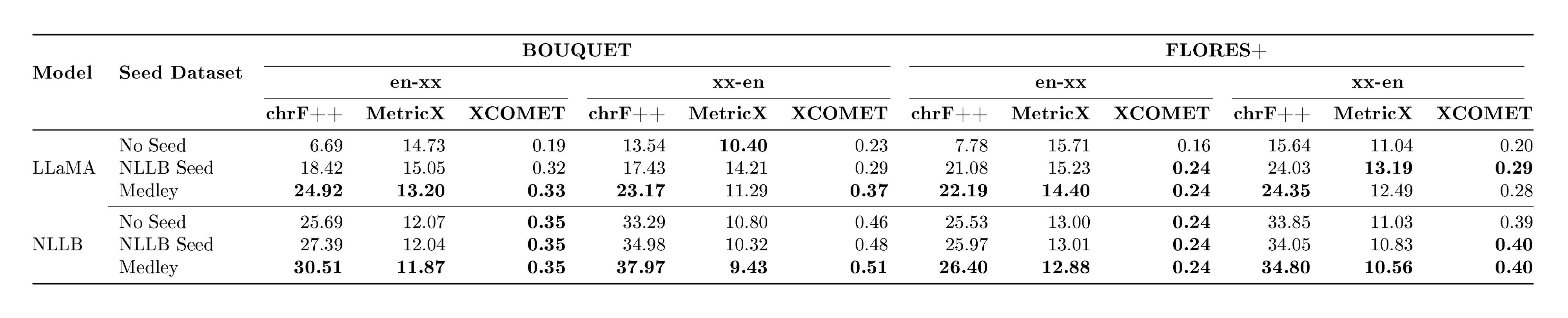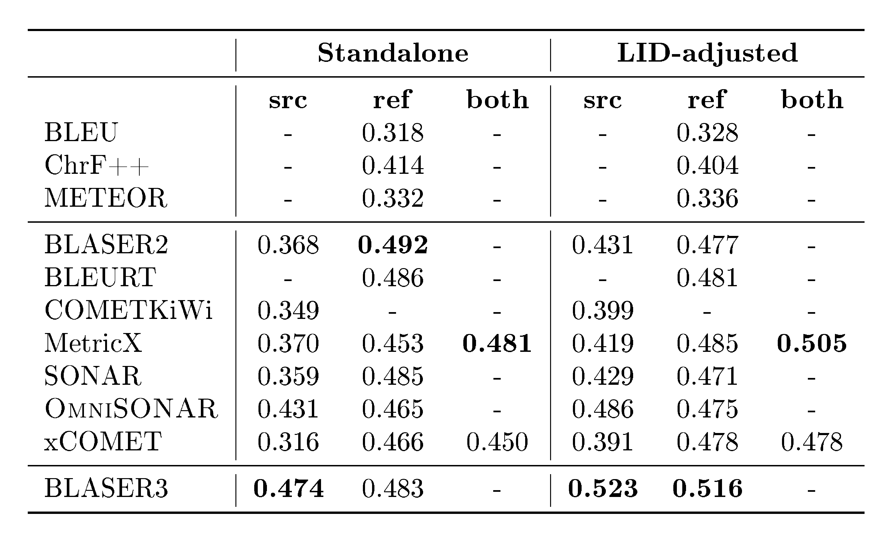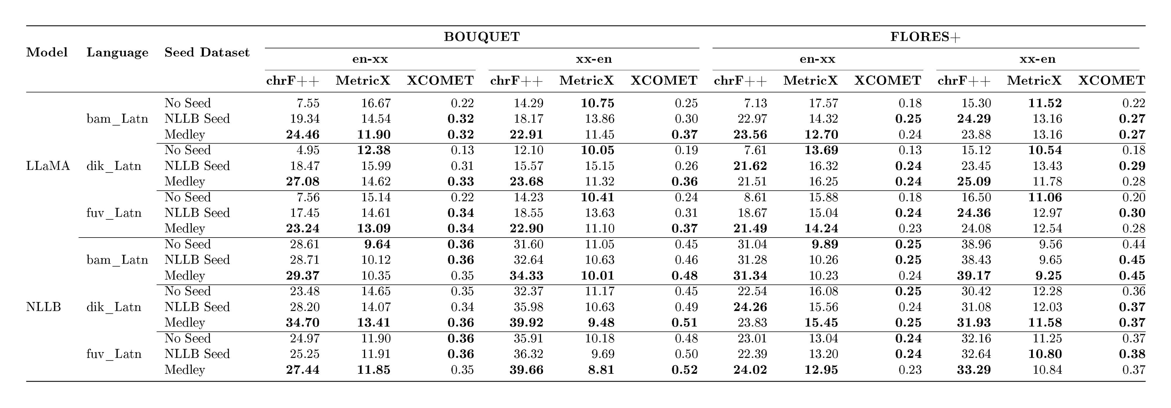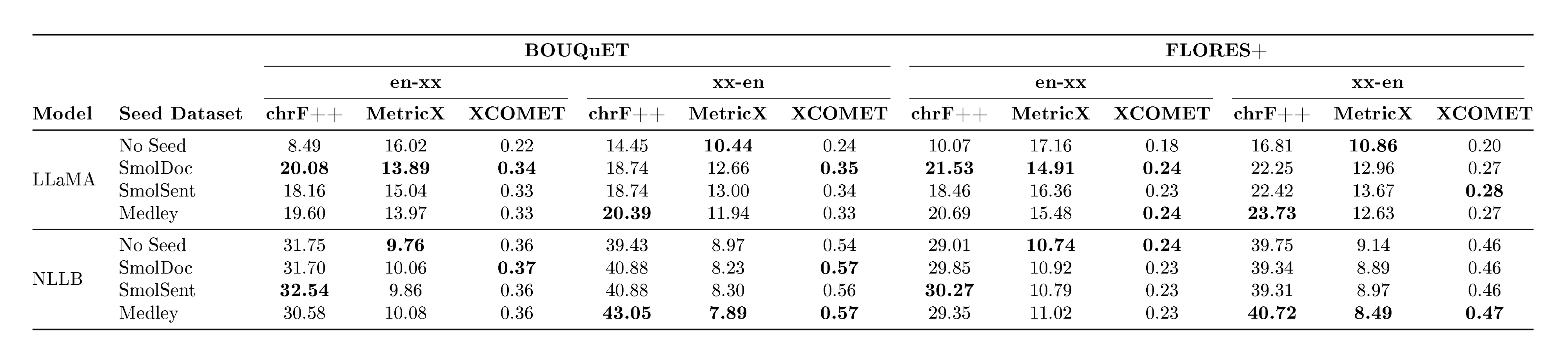 In addition, large-scale evaluation remains a major bottleneck for multilingual MT. FLoRes+ ([14]), and the Aya benchmark ([15]) provide high-quality evaluation for hundreds of languages, but none provide coverage beyond 200–300 languages (there are few recent exceptions to this ([16])) . Reference-based metrics also struggle at scale: BLEU and ChrF++ fail to capture meaning adequacy, while reference-free metrics such as COMET, BLASER 3 and MetricX require careful calibration and validation in typologically diverse languages (see metric cards in Appendix C). Without reliable evaluation for long-tail languages, progress becomes difficult to measure and even harder to compare across systems. This problem becomes acute when scaling to 1, 000+ languages, where many systems can produce outputs that appear fluent yet remain unintelligible or unrelated to the target language, making generation accuracy particularly challenging to assess. The field requires multilingual quality-estimation frameworks that scale to thousands of languages while preserving metric fidelity.