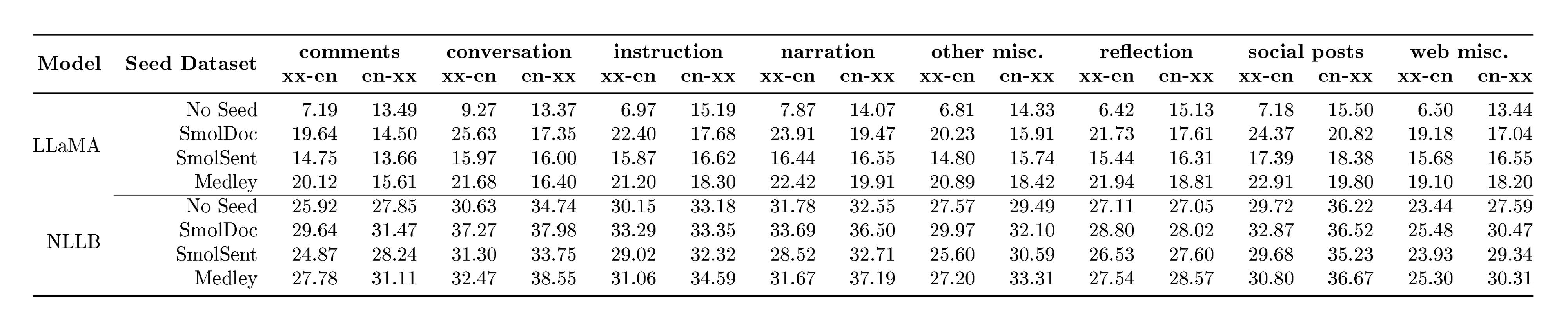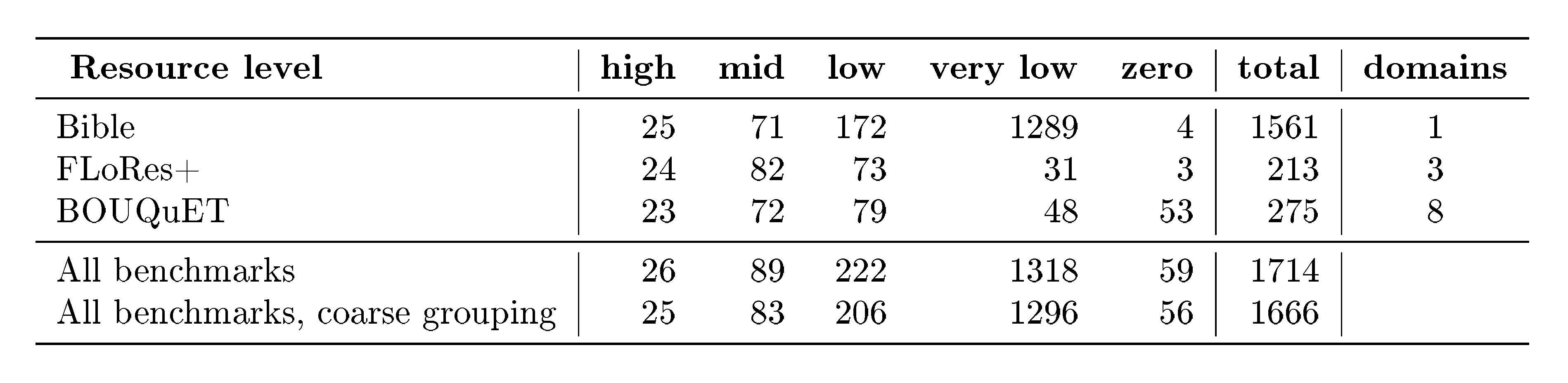 are used as one of the main parallel dataset for language analysis, for training and evaluation of MT systems. The Bible has the large language coverage (over 2000 languages) and many Bible translations are publicly available under permissive licenses. Finally, the Bible books are explicitly segmented into chapters and verses which are always preserved during translation, so aligning the translated text across the languages is trivial. Due to these reasons, Bible has already been used as the primary training set in several research works ([26, 7, 27, 28]). Additionally, we use the Bible to do part of our evaluation in order to have a reference-based benchmarking with large language coverage. We suggest using the Gospel by John as the test set, because the Gospels are the most translated from the Bible books, and John is considered to be the most different from the other Gospels. Training the Bible data has its caveats: its domain coverage is very limited, and language is often very old and formal. While training a model to understand such language might be alright, generating it would result in very unnatural style and various translation errors. Evaluating with the Bible shares the caviat of narrow domain and adds the contamination issue. We accept these risks and still use Bible both for training and evaluating, but we mitigate them using other sources (as explained in this section). We compile our Bible dataset from multiple sources[^7]