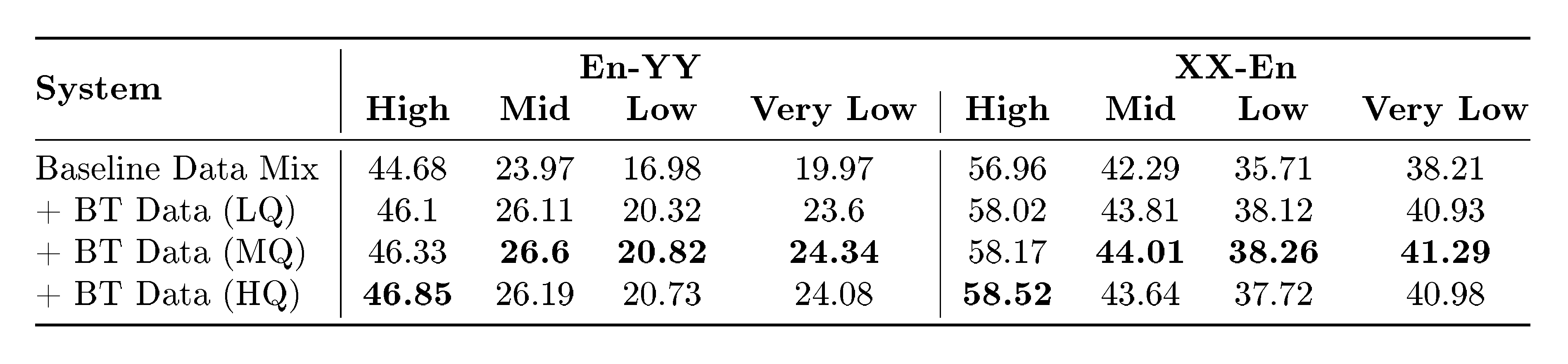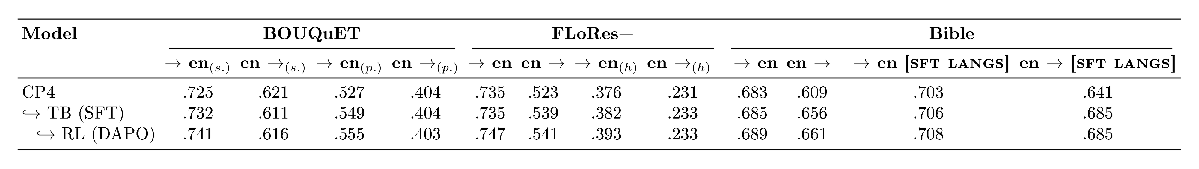 Access to high quality data is crucial to develop a high quality translation system. We give special focus to creating, selecting, and curating high-quality data for thousands of languages both for training and evaluation. In this section, regarding training, we mainly discuss continual pretraining (CPT) data, while main data for postraining is directly discussed in the corresponding section (Section 6.3). For CPT, we leverage mainly datasets in Table 2 and presented in Section 4.1. For evaluation, we rely on a subset of the Bible (Section 4.4.2) and several standard ones—e.g., FLoRes+ ([1]).