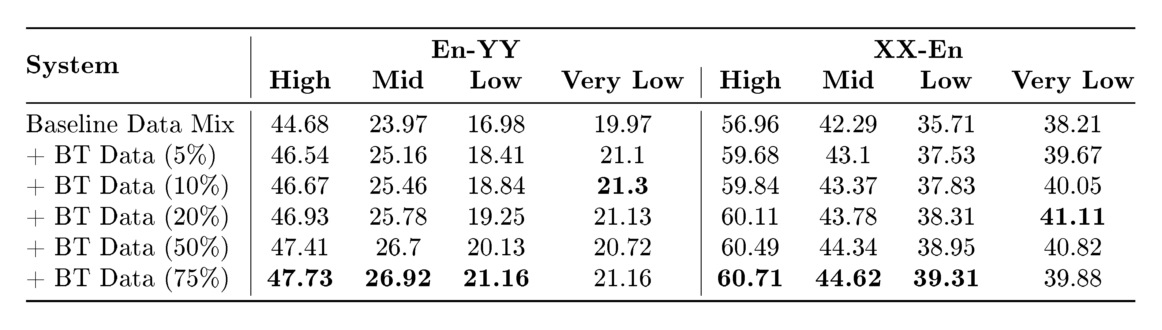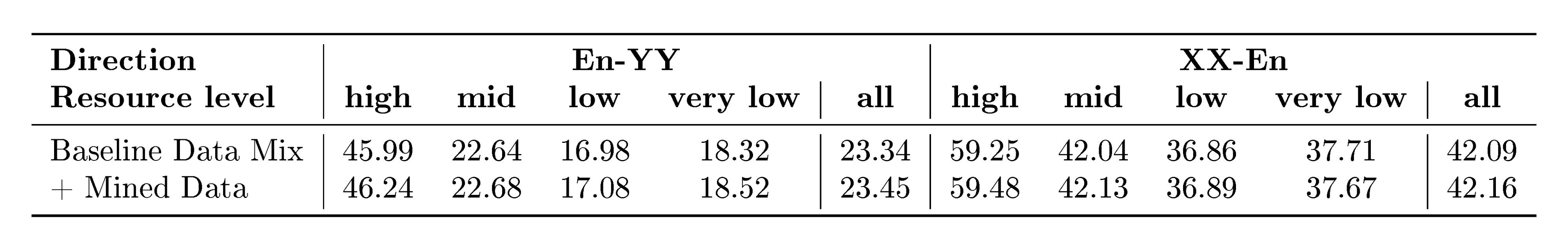 We want to revisit this definition because we are dealing with a much larger amount of languages than NLLB; and works with similar amount of languages ([23]) do not provide an explicit definition; we want to optimize for this definition to correlate with MT quality; and given the large amount of languages that we are covering, we want to further fine-grain our language resource classification by splitting low resource languages into low and extremely low resource, and by distinguishing high- and medium-resourced languages.