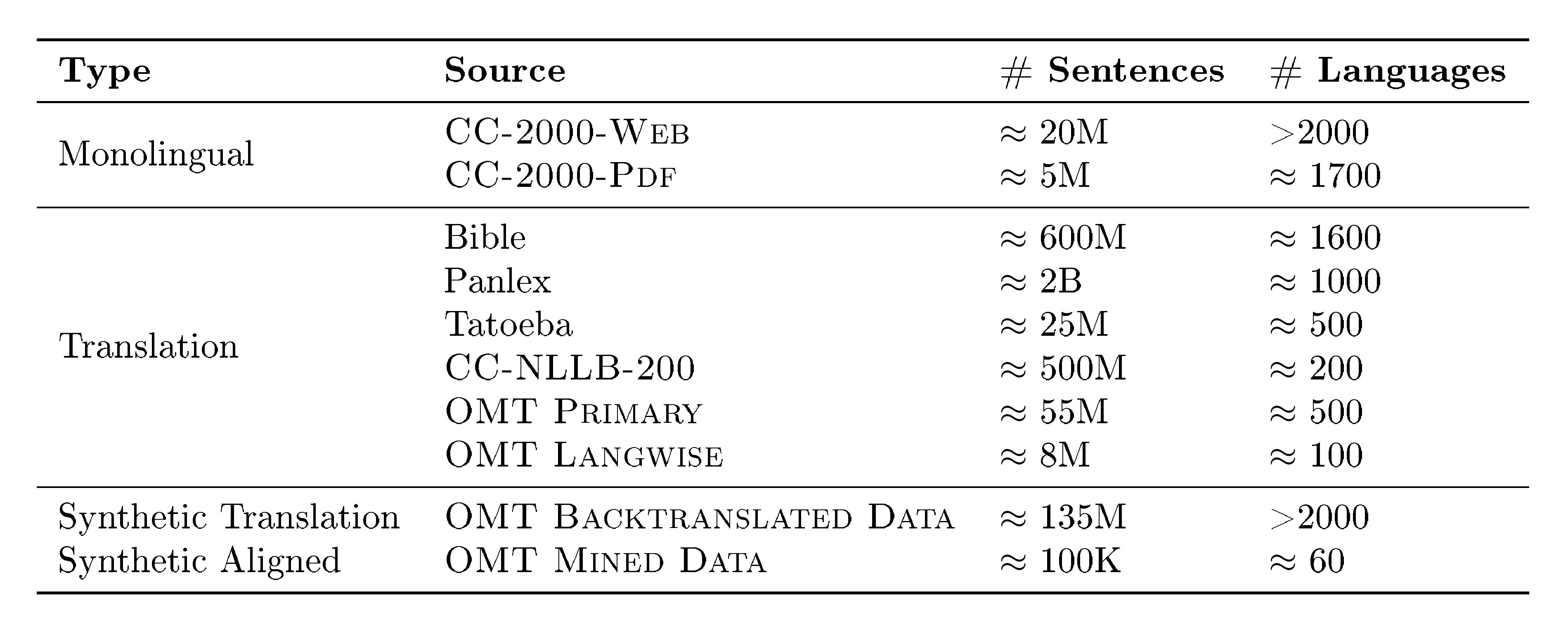 ::: {caption="Table 2: A summary of the main sources and volumes (in number of sentences) used for CPT as detailed in Section 6.2."}