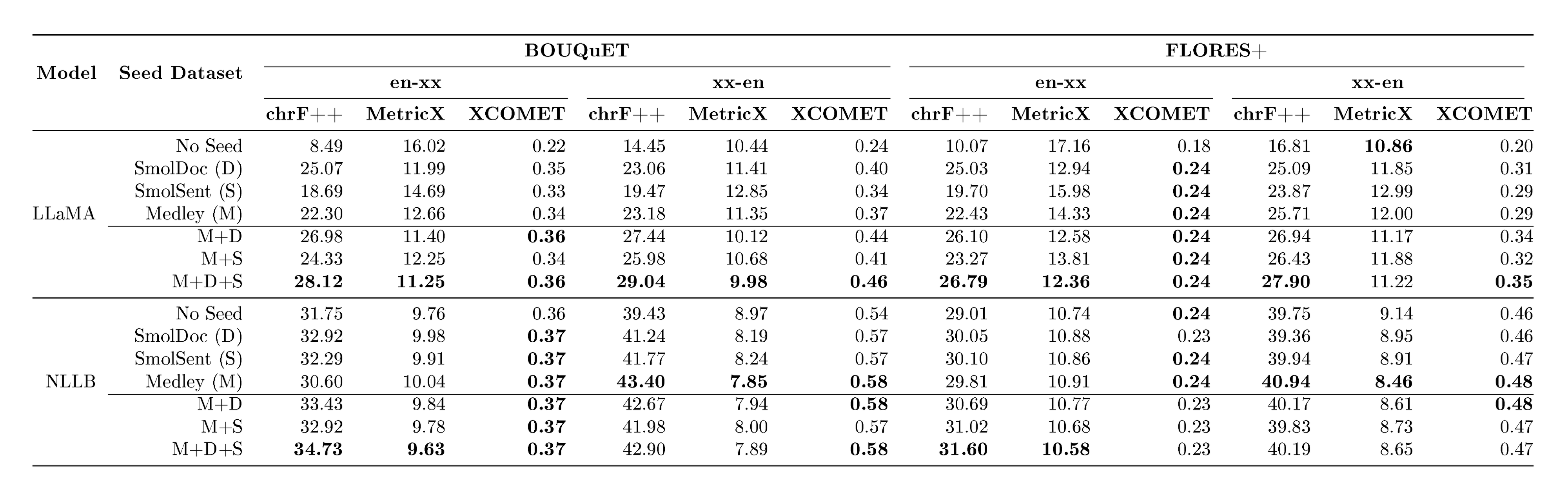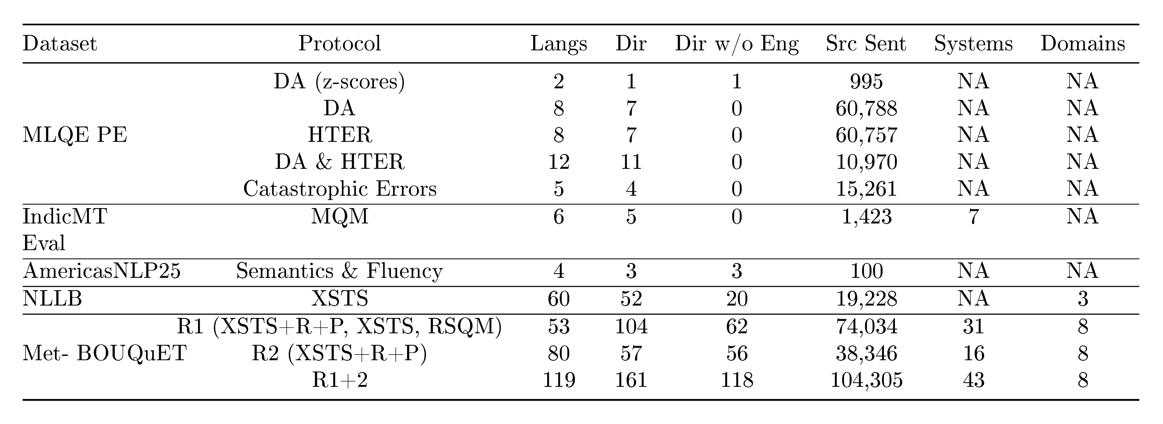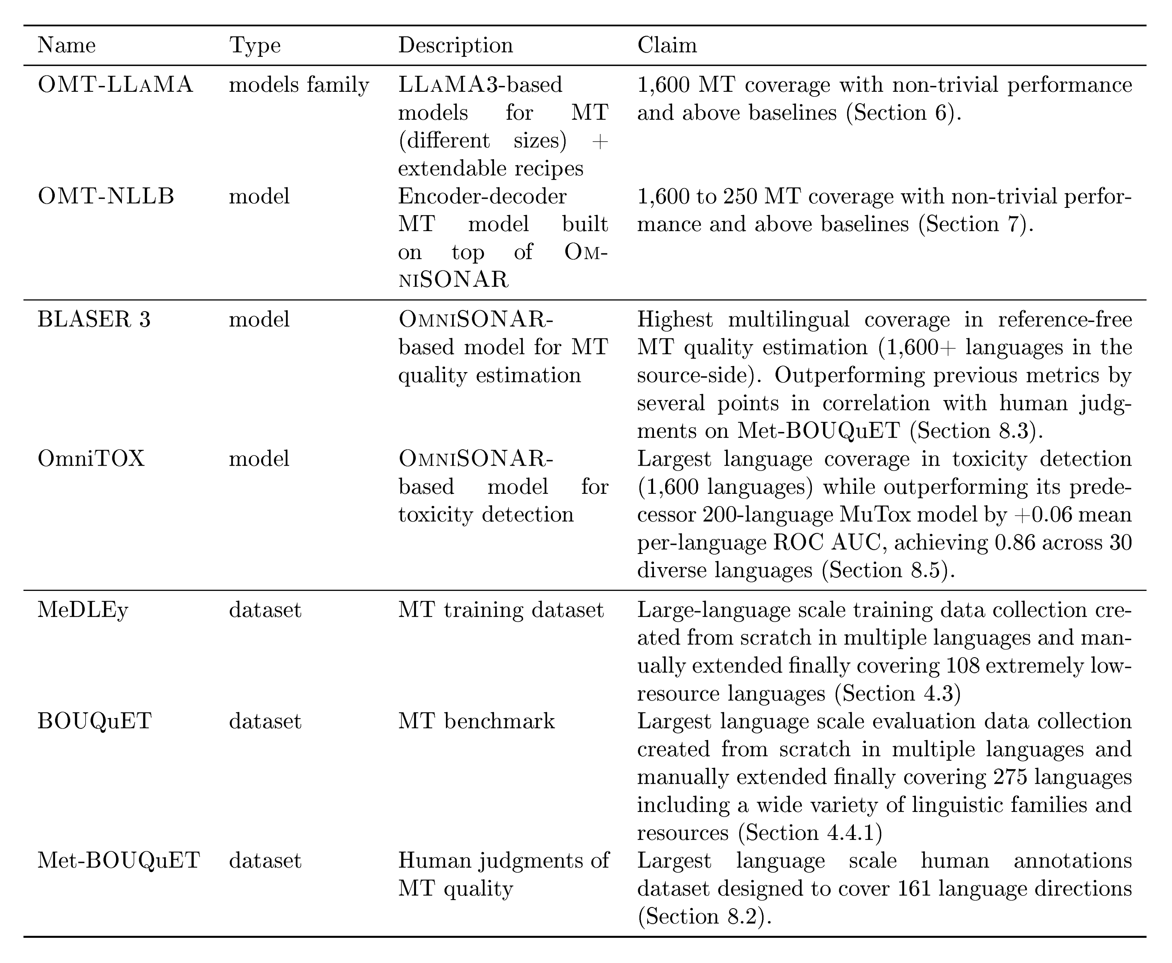 The main claims of our line of work are outlined in Table 1. Our translation models are built on top of freely available models. BOUQuET and Met-BOUQuET and the adjacent leaderboard are freely available^1.