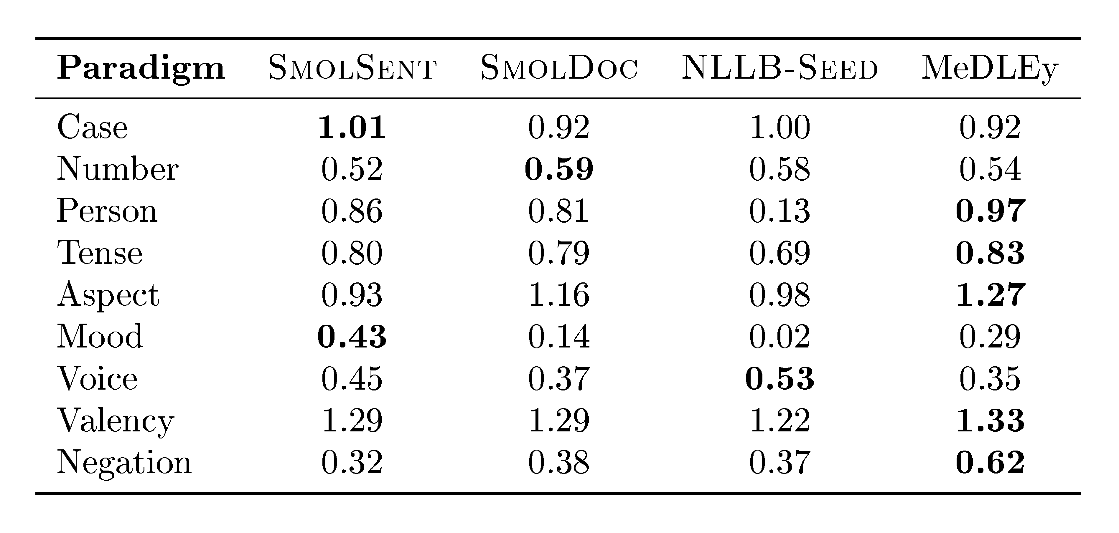 Based on our experiments (see Figure 1), we confirm a correlation between translation quality and the amount of parallel documents available. A clear shift in translation quality is observed for languages with more than 1 million parallel documents, which, following the NLLB convention, we establish as the threshold for the "low-resource" designation. An additional qualitative change is observed at approximately 40K parallel documents: this corresponds to a corpus size comparable to that of the Bible, supplemented by at least one additional source of parallel training data.