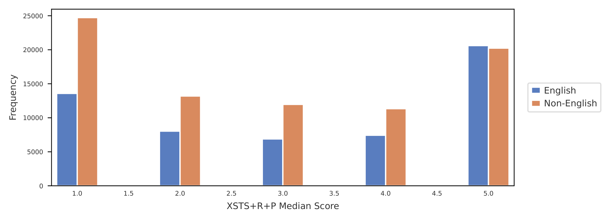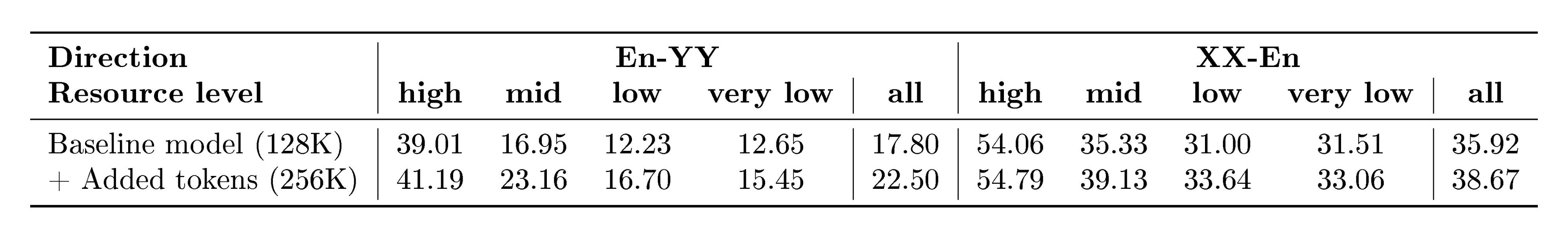 This definition comes with some limitations. Most anomalies come from languages with less than 1k parallel documents on which we observe equally high translation quality. By doing a manual inspection on those languages, we could hypothesize that this bucket contains languages which are highly similar to other high resource languages and benefit from positive knowledge transfer. Another anomaly, but much more rare, is low-performing languages in the bucket of languages with more than 1M documents. In this case, again, by manual analysis we could hypothesize that there are languages for which we have extremely low quality data or very narrow domain distribution of it. Or, complimentary, rare scripts that are not well represented by the tokenizer and as a consequence low quality MT performance. Finally, sometimes we misattribute the available training data to other languages, due to loosely defined language boundaries (e.g. some data for a dialectal Arabic language could be identified simply with the ara_Arab code, pointing to the Arabic macro-language without specifying the language).