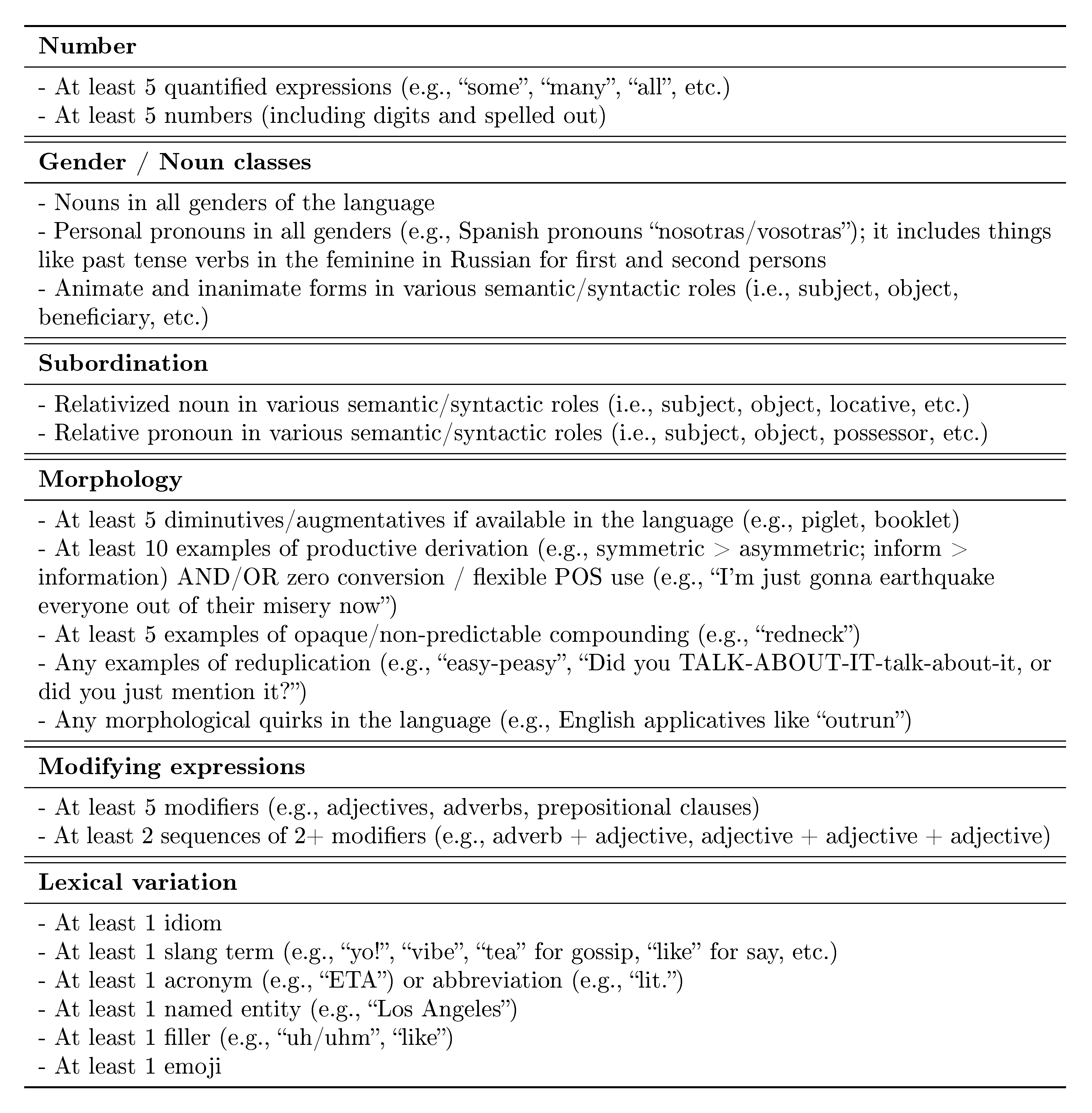 Even when English is a possible—or the only available—pivot option, its lack of explicit grammatical markings is a constant reminder that sentences rarely speak for themselves, and that translators need a good amount of contextual information to produce quality translations, especially when moving away from the formal textual domain and closer to the conversational domain. For example, one of the many differences between those two domains is a shift from a predominance of unspecified third grammatical persons to first and second grammatical persons (often in the singular). In English, the pronouns I and you do not provide any intrinsic information about grammatical gender; in fact, you does not even provide any distinctive information about grammatical number, which is not complemented either by any form of verbal or adjectival inflection. This causes ambiguities that translators cannot resolve on their own, which in turn may lead to mistranslations that are not due to lack of proficiency but rather lack of relevant information. The same is true of information about language register and formality. In the conversational domain, English provides very few formality markers, and identifying language register markers may require a very high level of proficiency, which is only accessible to translators with extensive cultural experience. To mitigate these problems, we first ensured that all sentences to be translated be included in a paragraph (or what would be the equivalent of a paragraph in speech). We also provided translators with additional information about the following: the overall domain in which the paragraphs are most likely to be found, the protagonists depicted or referred to in the paragraphs, the language register most likely to be used in such situations, and the overall tone of the paragraphs (if any specific tones were to be conveyed).