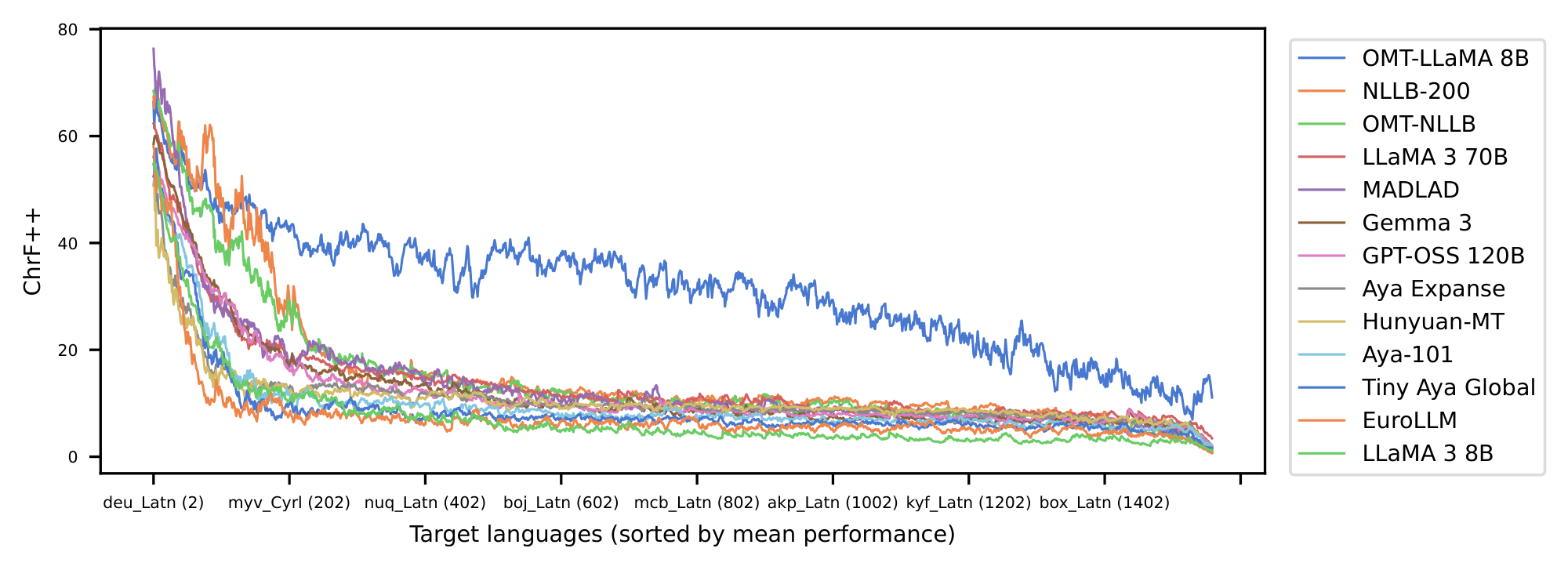 Taken together, these limitations highlight that progress in massively multilingual MT now depends less on marginal model improvements than on rethinking how systems can grow, adapt, and represent the world’s linguistic diversity. What is needed is not only broader coverage but deeper support—models that can generate underserved languages robustly, operate efficiently at smaller scales, and provide reliable evaluation mechanisms for long-tail settings. Our goal is to operationalize this shift. Rather than building another large model centered on high-resource performance, we design Omnilingual MT to address the structural challenges of extreme coverage: data scarcity, typological diversity, long-tailed language generation, efficiency–performance tradeoffs, and the absence of evaluation frameworks for 1, 600+ languages.