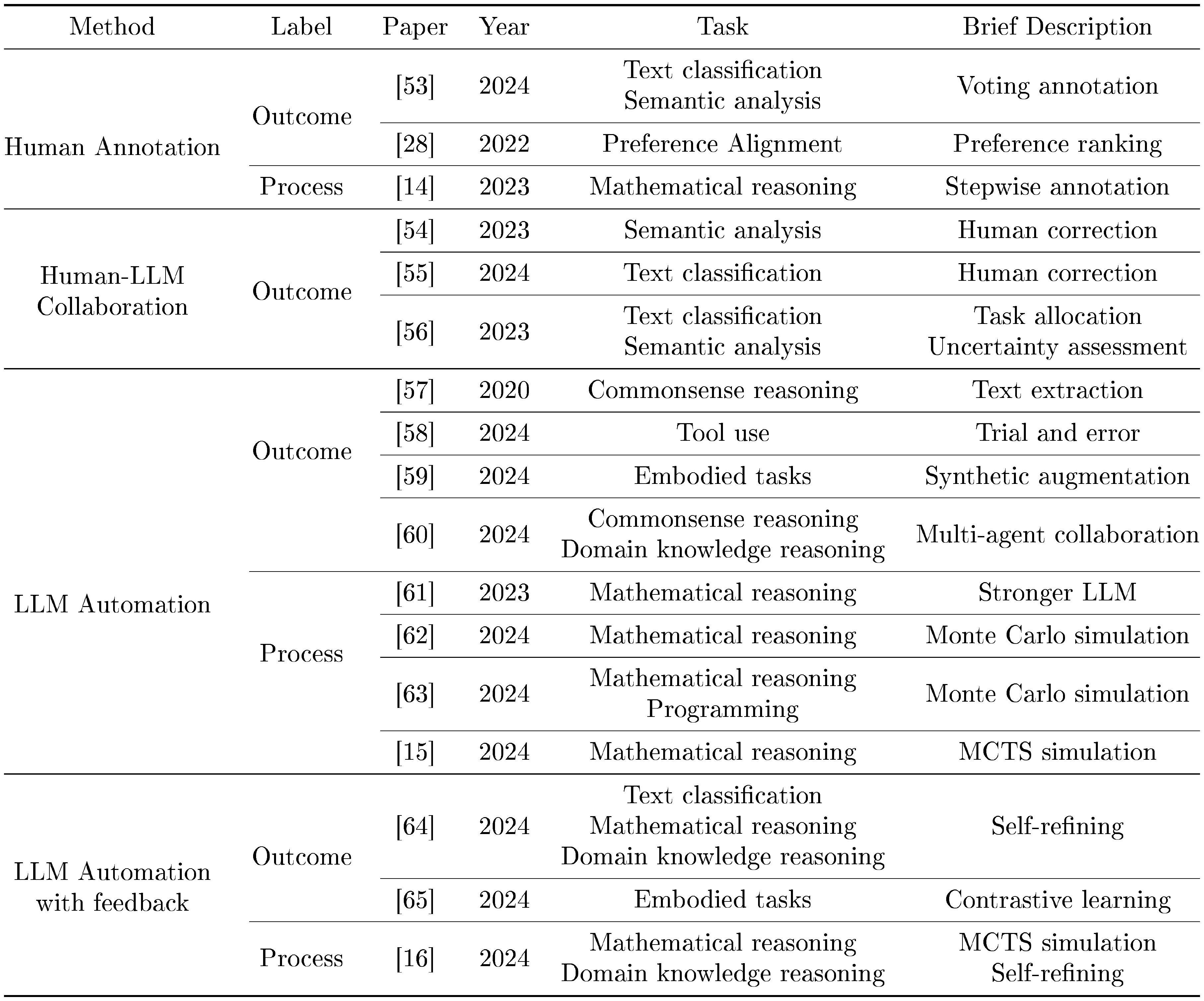 Annotation with stronger LLM: As a straightforward automated labeling method, Luo et al. [61] design to utilize a more powerful external model to annotate the intermediate results of a generative model’s inference process. Rather than relying on manual annotation, the method employs a pre-trained, high-performance model, like GPT series, to evaluate each generated step. By leveraging the capabilities of a stronger external model, this approach enhances both the accuracy and scalability of the labeling process, making it more feasible for large-scale tasks. However, the major limitation of this approach is its reliance on the highly capable external model, which means the performance of the labeling process is ultimately constrained by the capabilities of the external model used.