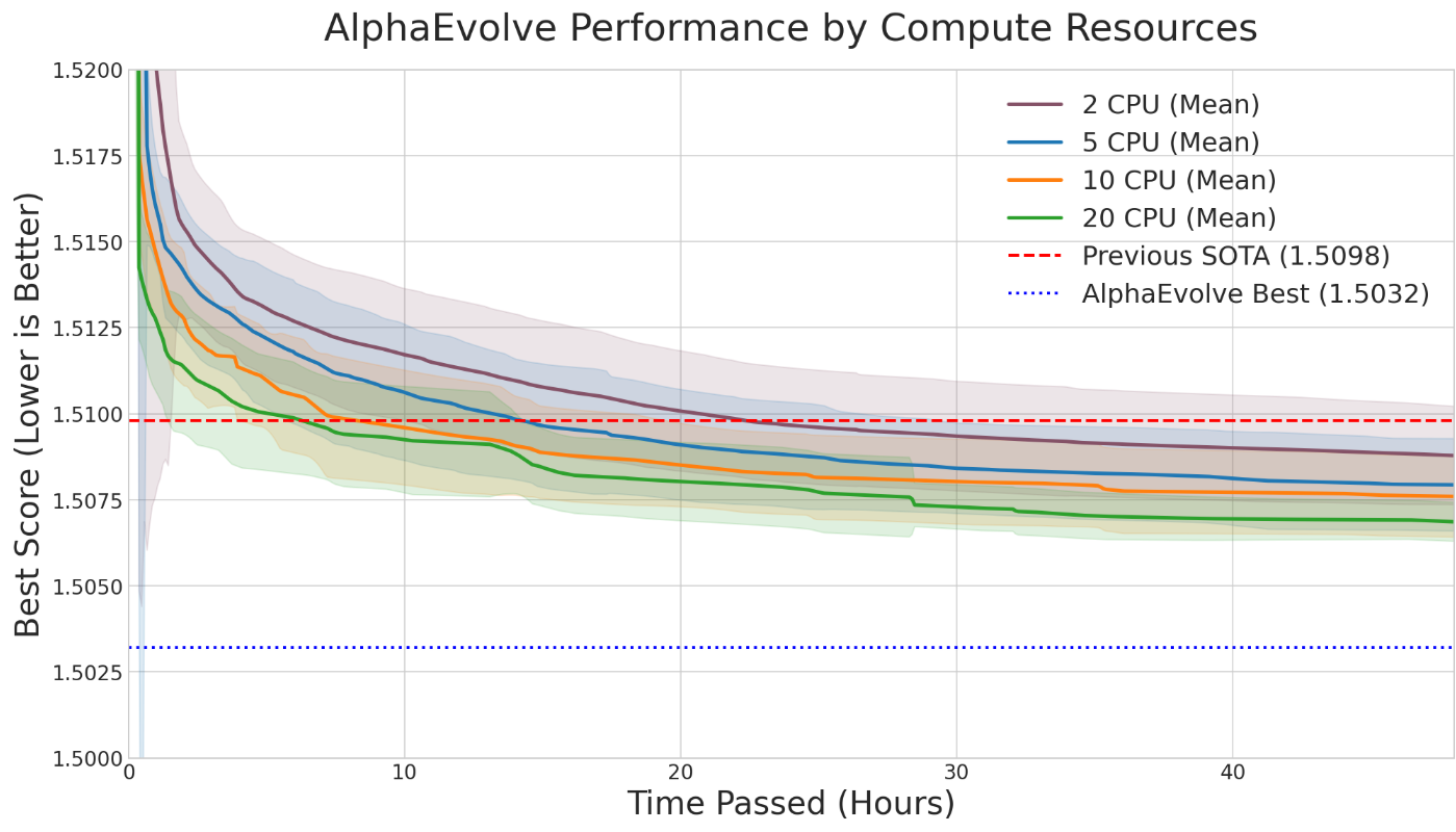 AlphaEvolve run is the amount of parallel computation used (e.g., the number of CPU threads). Intuitively, more parallelism should lead to faster discoveries. We investigated this by running Problem 2 with varying numbers of parallel threads (from 2 up to 20).Our findings (see Figure 2), while noisy, seem to align with this expected trade-off. Increasing the number of parallel threads significantly accelerated the time-to-discovery. Runs with 20 threads consistently surpassed the state-of-the-art bound much faster than those with 2 threads. However, this speed comes at a higher total cost. Since each thread operates semi-independently and makes its own calls to the LLM to generate new heuristics, doubling the threads roughly doubles the rate of LLM queries. Even though the threads communicate with each other and build upon each other's best constructions, achieving the result faster requires a greater total number of LLM calls. The optimal strategy depends on the researcher's priority: for rapid exploration, high parallelism is effective; for minimizing direct costs, fewer threads over a longer period is the more economical choice.
