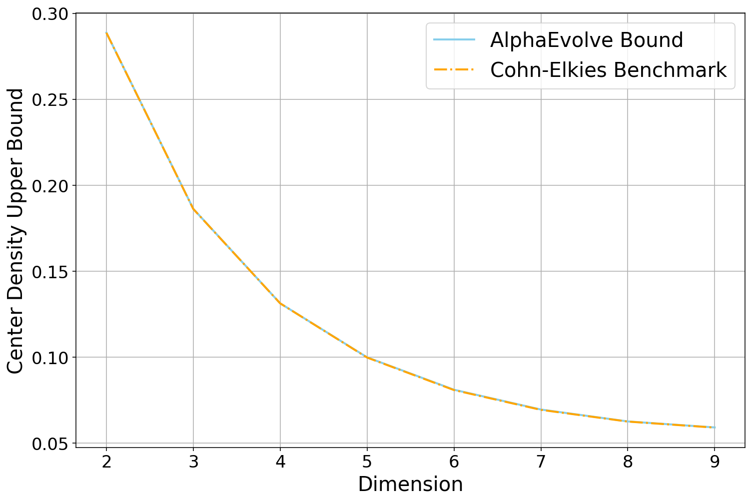 AlphaEvolve. For lower bounds, we refer to [38]. For upper bounds, one needs to produce specific counterexamples . The explicit choicealready gives the upper bound , which at one point was conjectured to be optimal. The improvement comes from a numerical search involving functions that are piecewise constant on a fixed partition of into some finite number of intervals ( is already enough to improve the bound), and optimizing. There are some tricks to speed up the optimization, in particular there is a Newton type method in which one selects an intelligent direction in which to perturb a candidate , and then moves optimally in that direction. See [39] for details. After we told