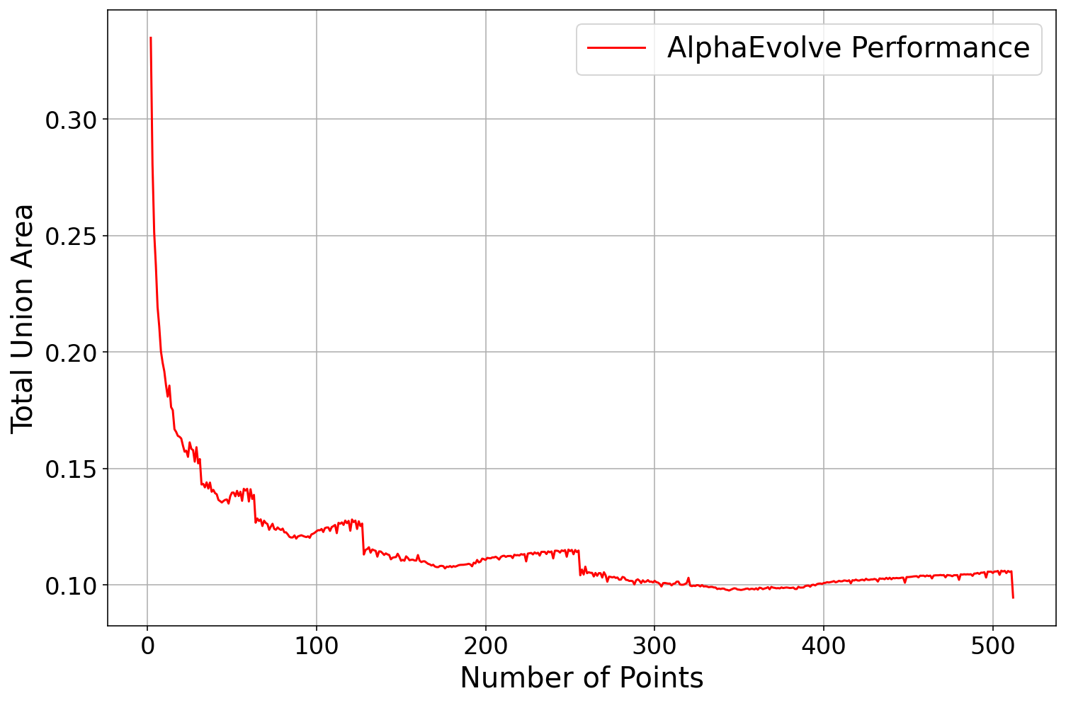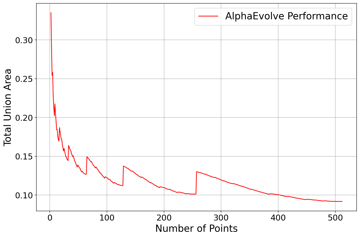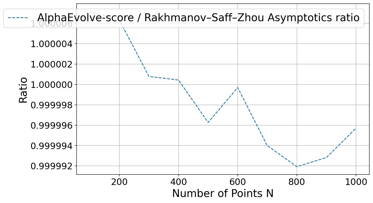 AlphaEvolve about this Newton type method, it found heuristic search methods using "cubic backtracking" that produced constructions reducing the upper bound to . See Repository of Problems for several constructions and some of the search functions that got evolved.After our results, Damek Davis performed a very thorough meta-analysis [40] using different optimization methods and was not able to improve on the results, perhaps due to the highly irregular nature of the numerical optimizers (see Figure 4). This is an example of how much