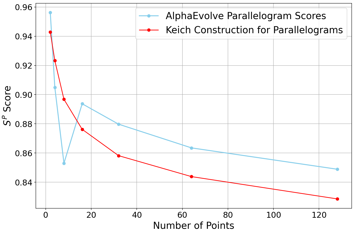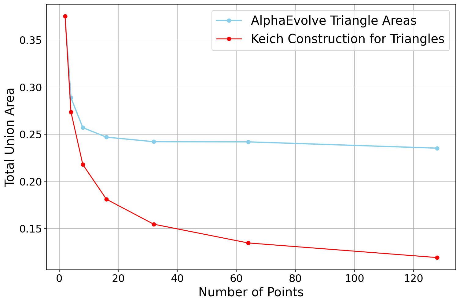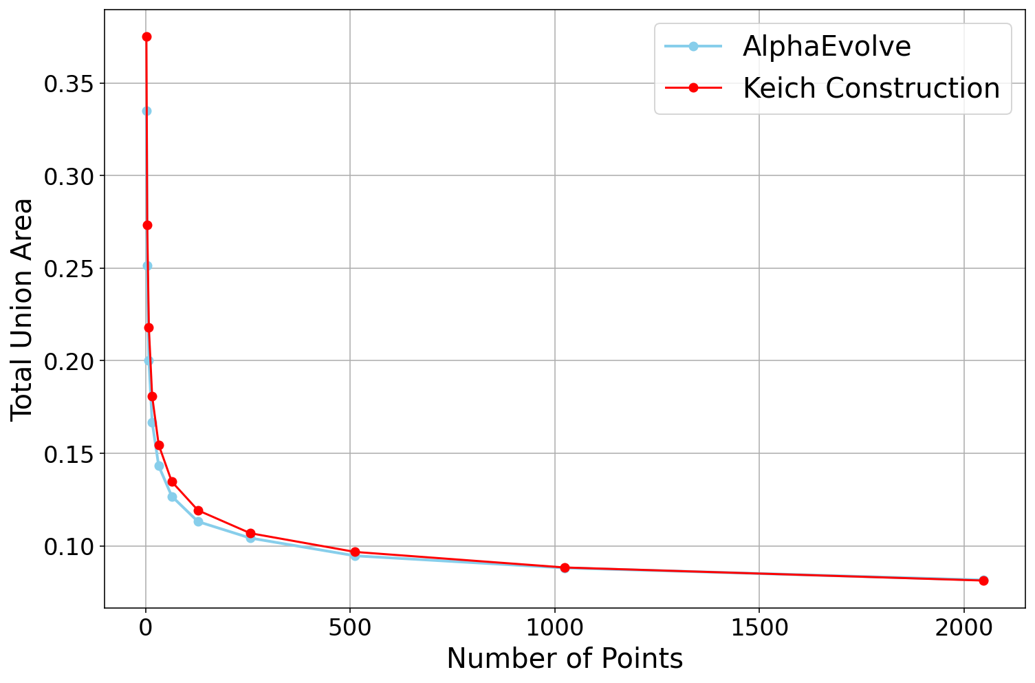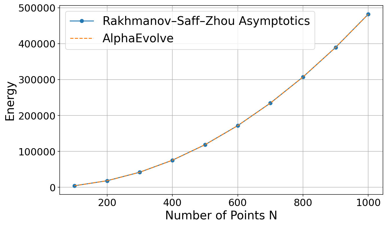 AlphaEvolve to solve this problem without any hints, and it only managed to find constructions of size . Next, we ran the same experiment again, but this time telling AlphaEvolve that a construction of size was possible. Curiously, this small bit of extra information had a huge impact on the performance: AlphaEvolve now immediately found constructions of size for a small constant , and eventually it discovered various different constructions of size .We also experimented with giving