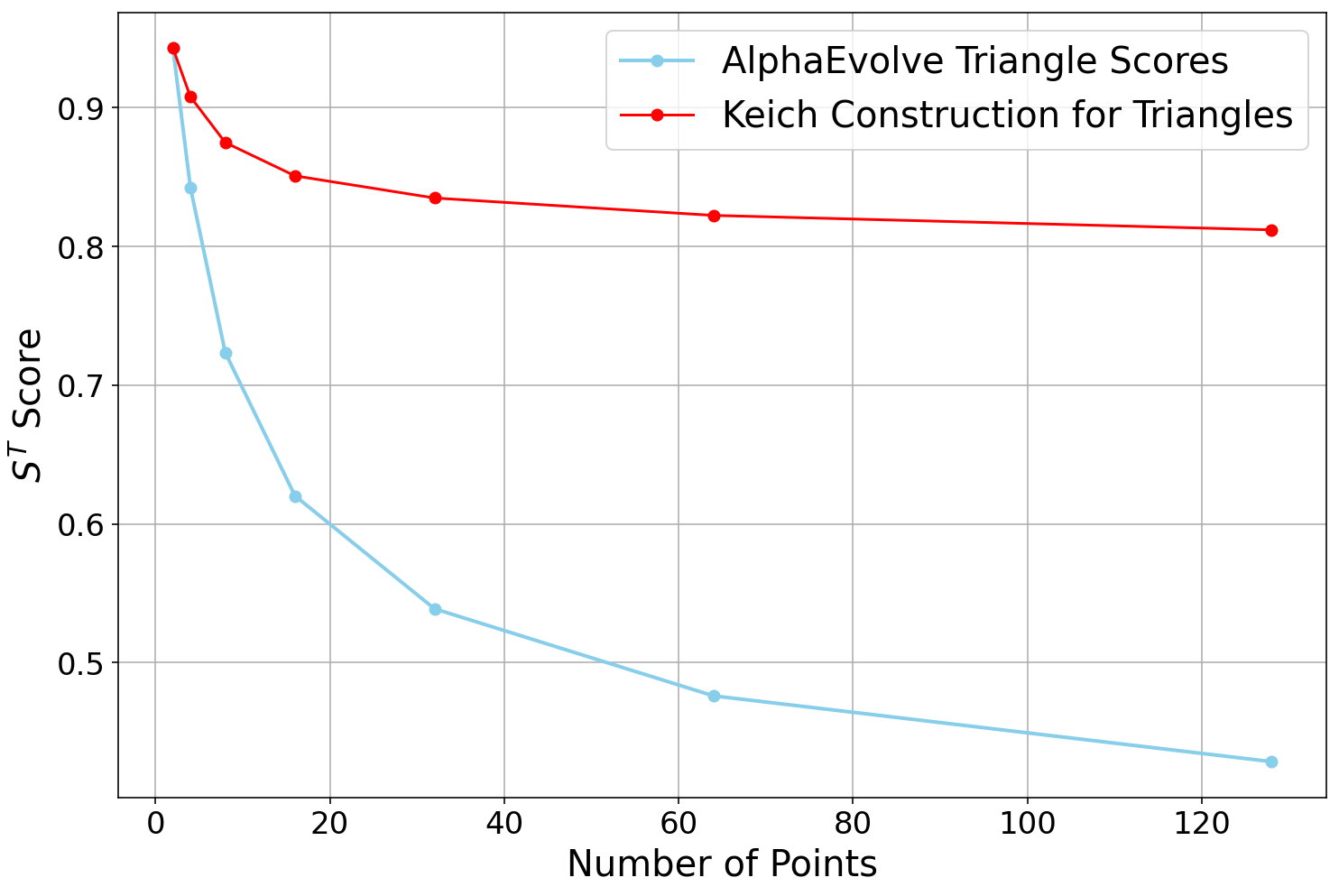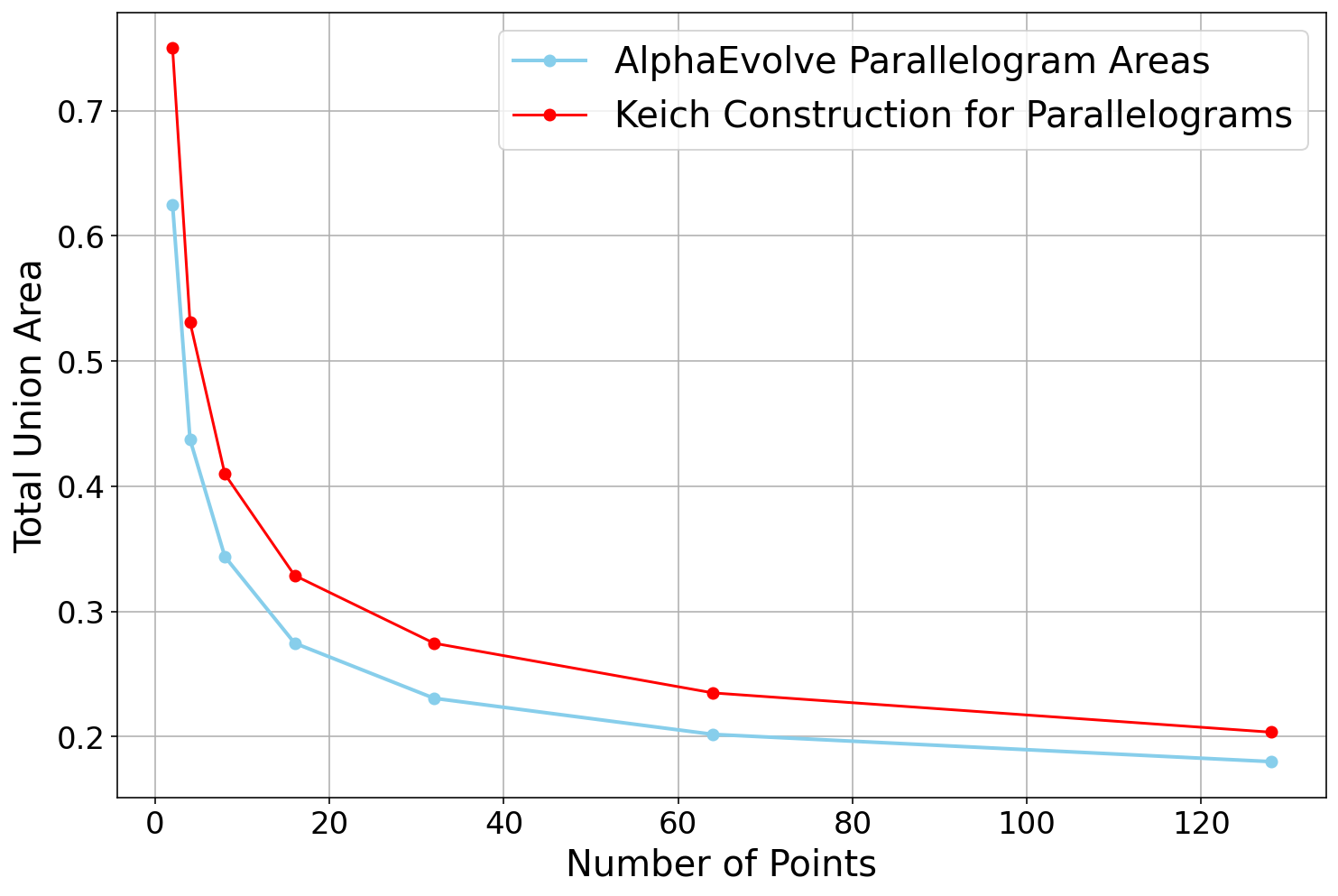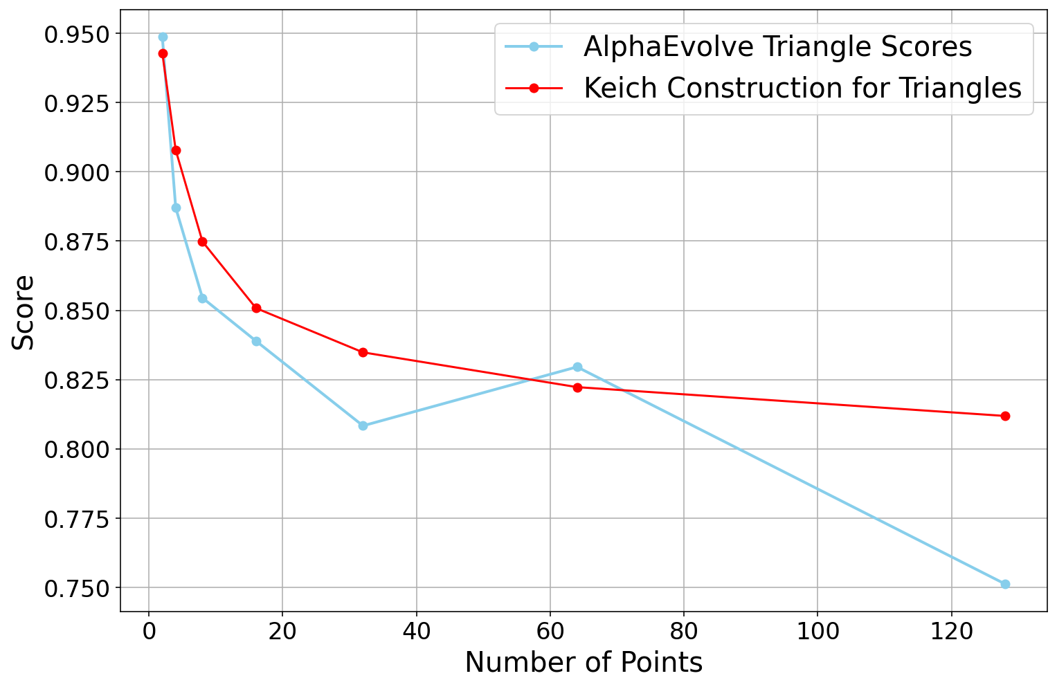 AlphaEvolve to solve this problem without any hints, and it only managed to find constructions of size . Next, we ran the same experiment again, but this time telling AlphaEvolve that a construction of size was possible. Curiously, this small bit of extra information had a huge impact on the performance: AlphaEvolve now immediately found constructions of size for a small constant , and eventually it discovered various different constructions of size .We also experimented with giving
