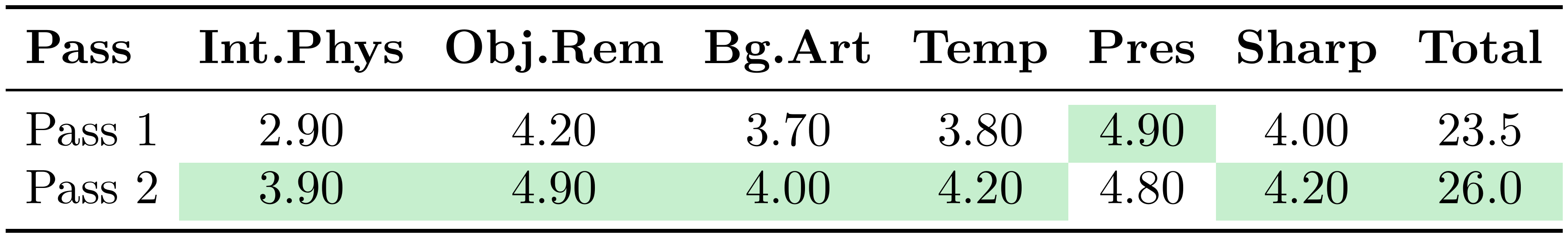 VOID optionally performs a second refinement pass when the VLM determines that the object-interaction removal requires substantial reconfiguration of scene elements to produce a physically plausible outcome. Among the 75 real-world test videos, the VLM flagged 10 cases as requiring refinement. Table 6 compares Pass 1 and Pass 2 results on these samples using the VLM judge.