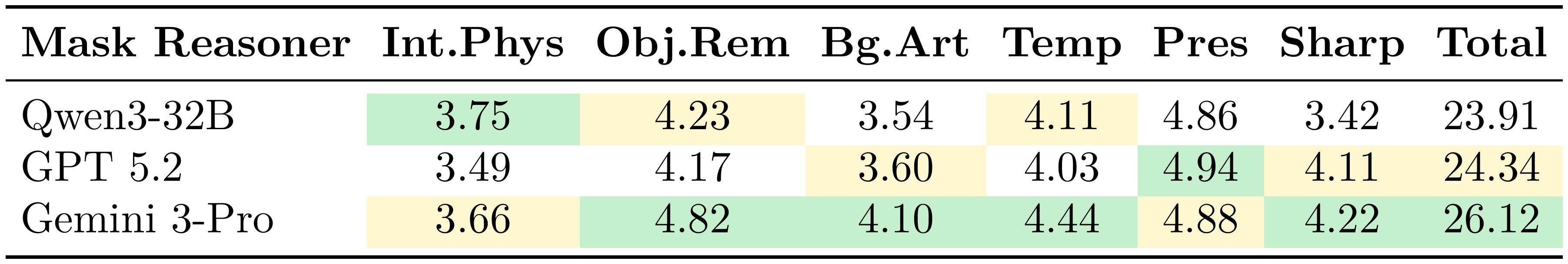 Section Summary: The researchers tested three AI vision-language models—Qwen3-32B, GPT 5.2, and Gemini 3-Pro—to see how well they create "masks" from simple user clicks, which help edit videos by guiding what gets removed or changed. These masks are used in a process to fill in video gaps, and the quality of the final edited videos was scored by another AI judge on aspects like realistic interactions, clean object removal, smooth backgrounds, consistent motion over time, preserved scenery, and sharp details. Overall, Gemini 3-Pro stood out as the best, especially for making interactions feel natural and backgrounds look right.