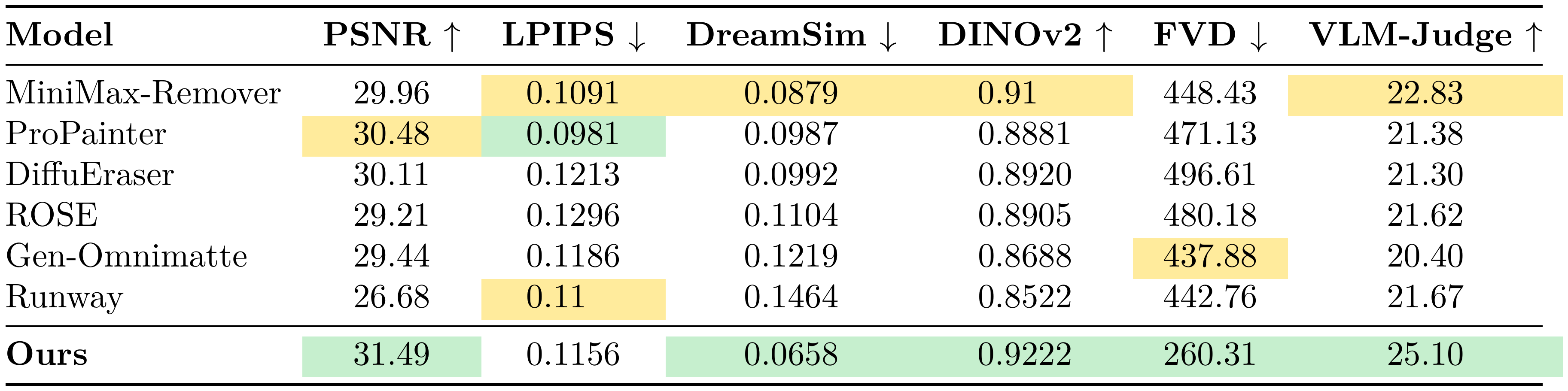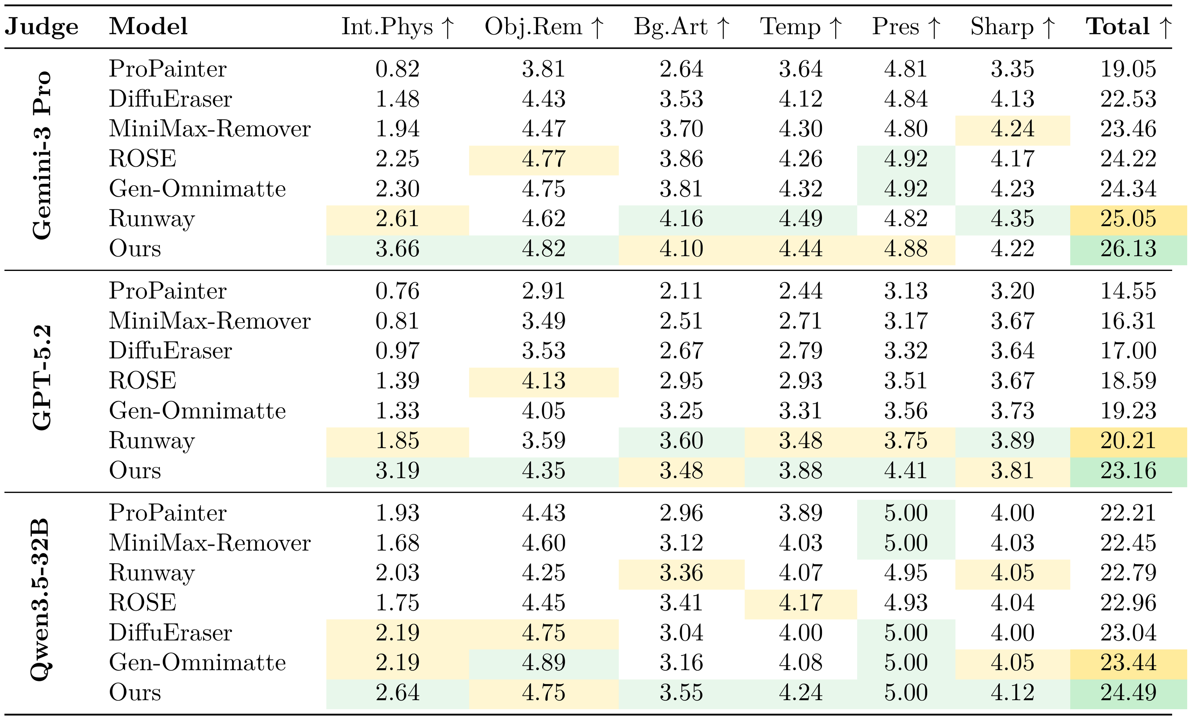 Table 5 reports Gemini 3 VLM-judge scores measuring the quality of the resulting inpainted videos across six dimensions. The judge evaluates interaction physics, object removal, background artifacts, temporal consistency, preservation of the scene, and sharpness.