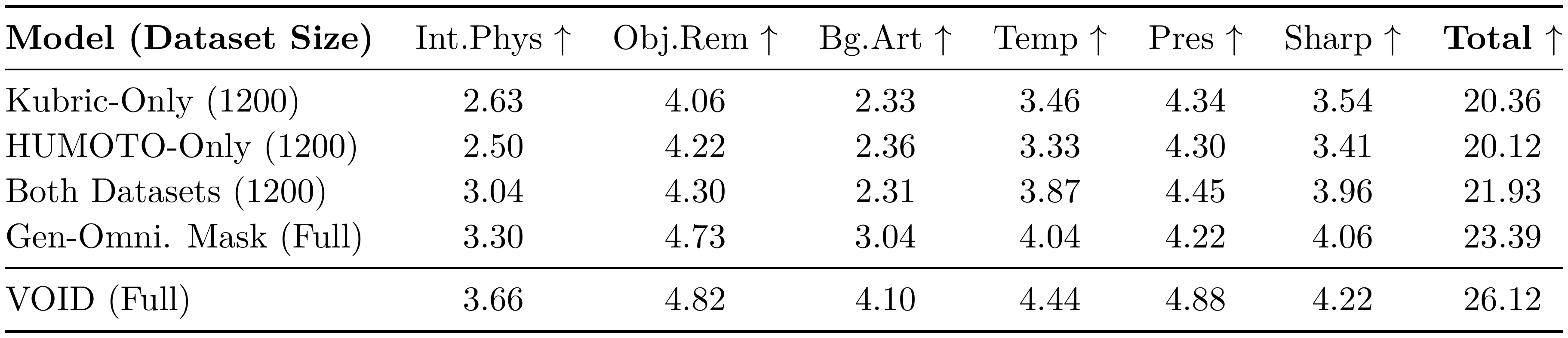 Table 4 presents ablations on our training data and quadmask strategy. To best capture model robustness and generalization, all variants are evaluated on the same 75 real-world test cases using Gemini 3 Pro as a VLM judge. See the appendix for a further ablation on VOID's second pass.