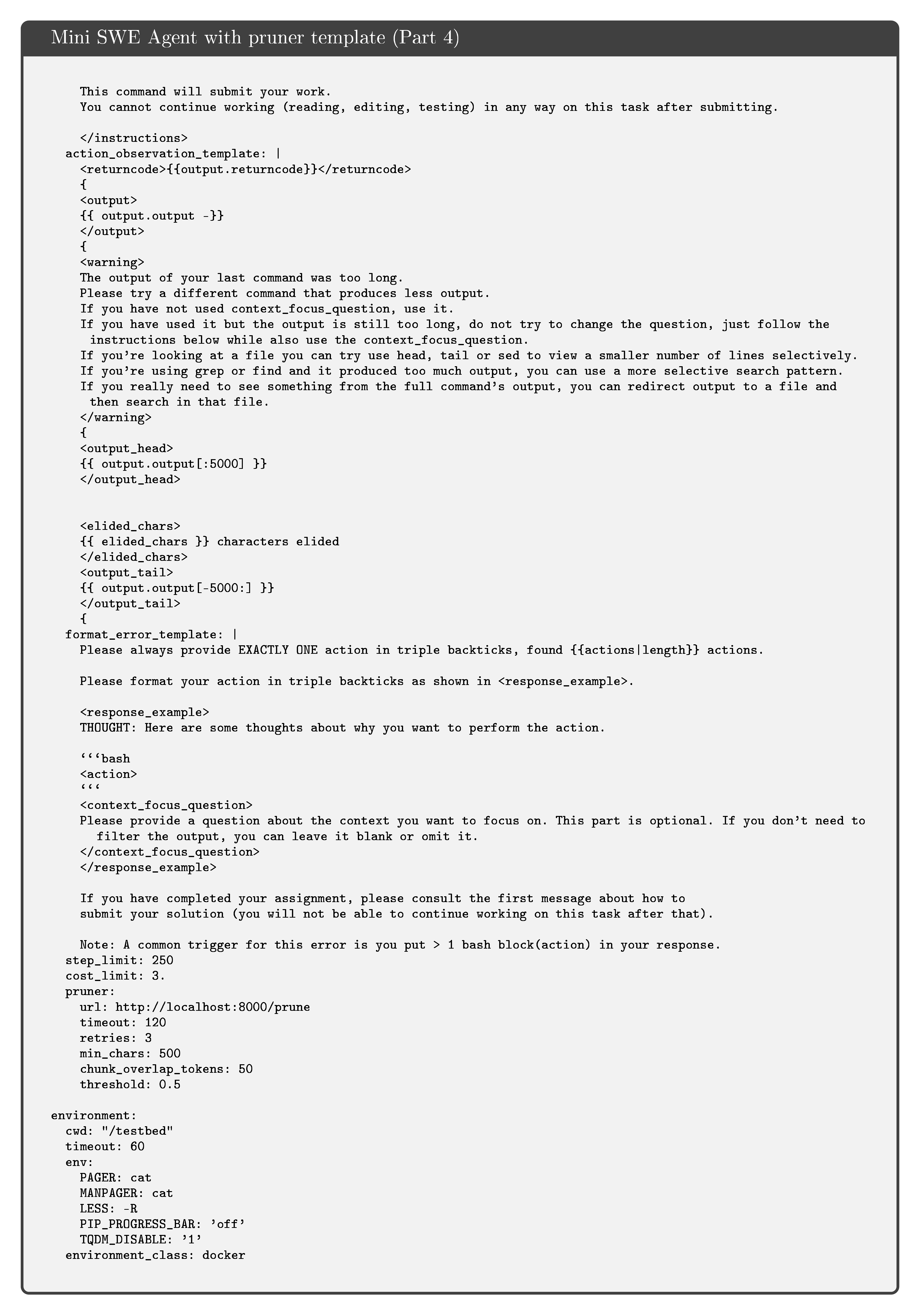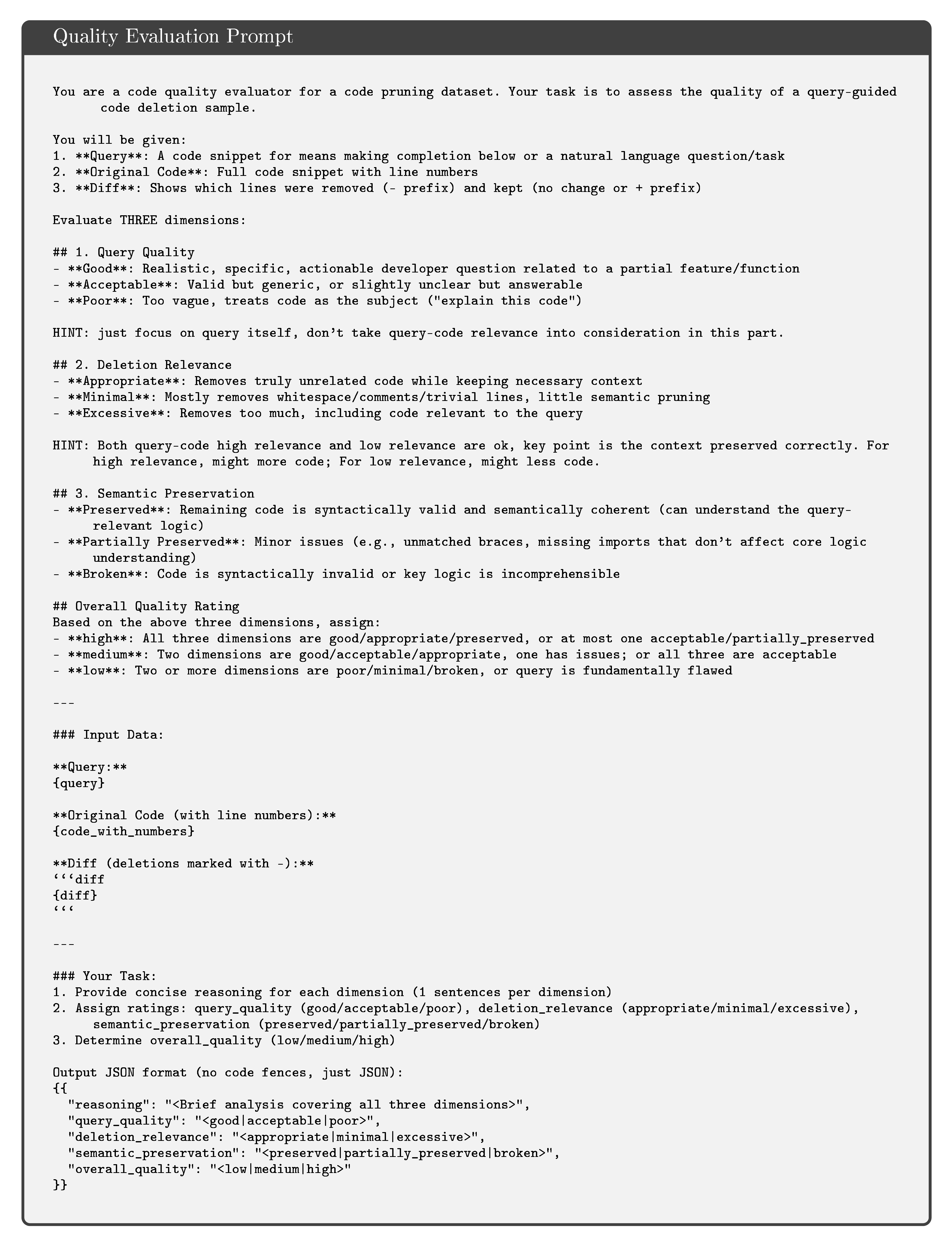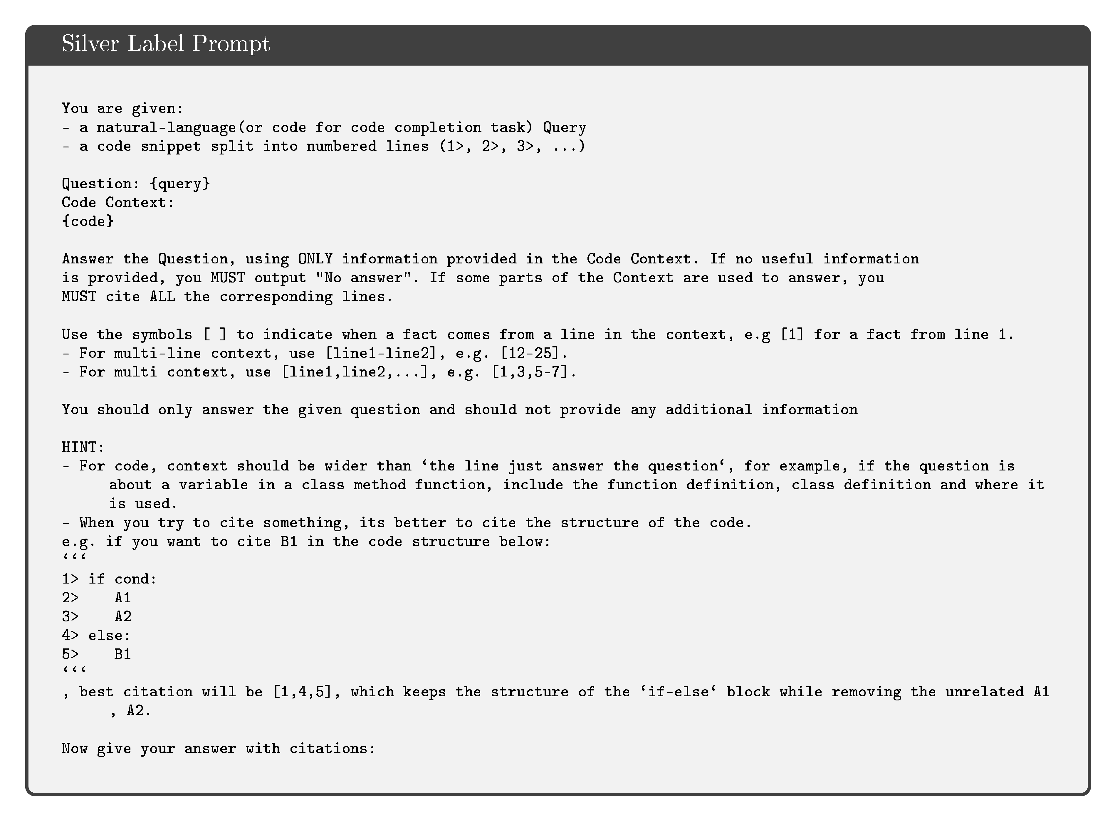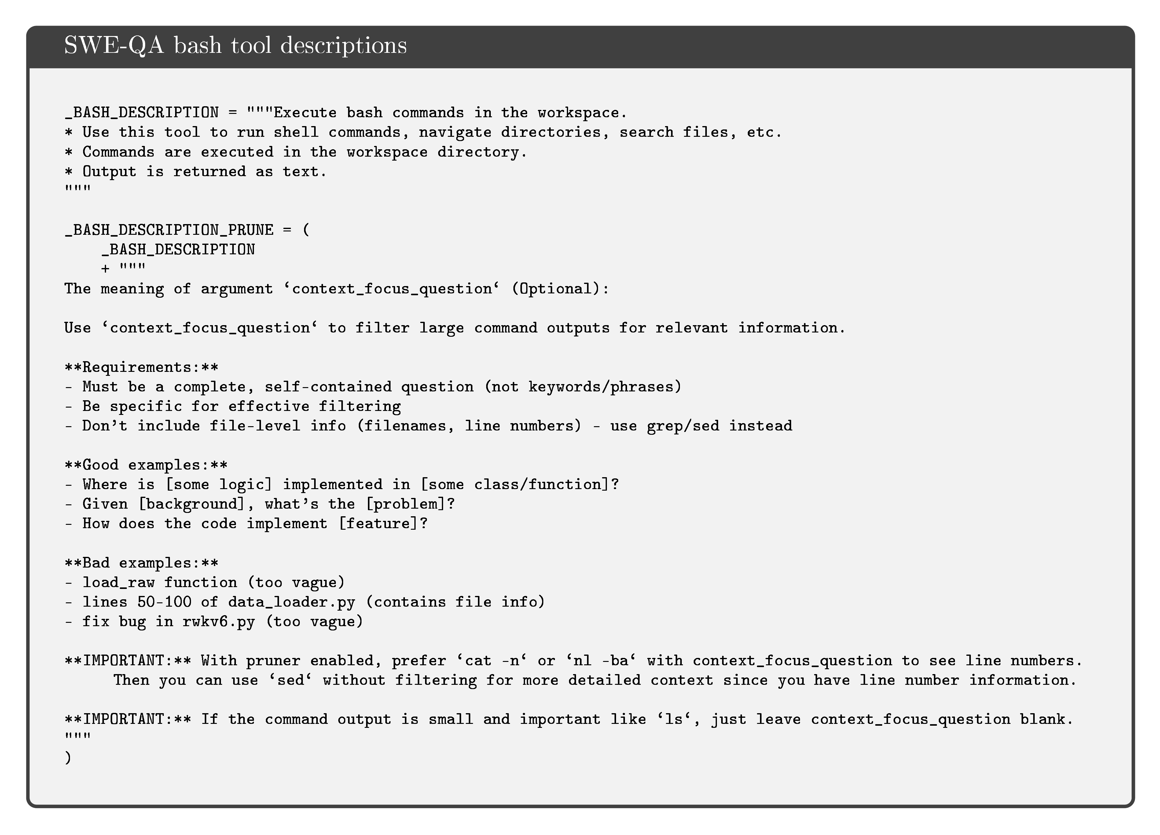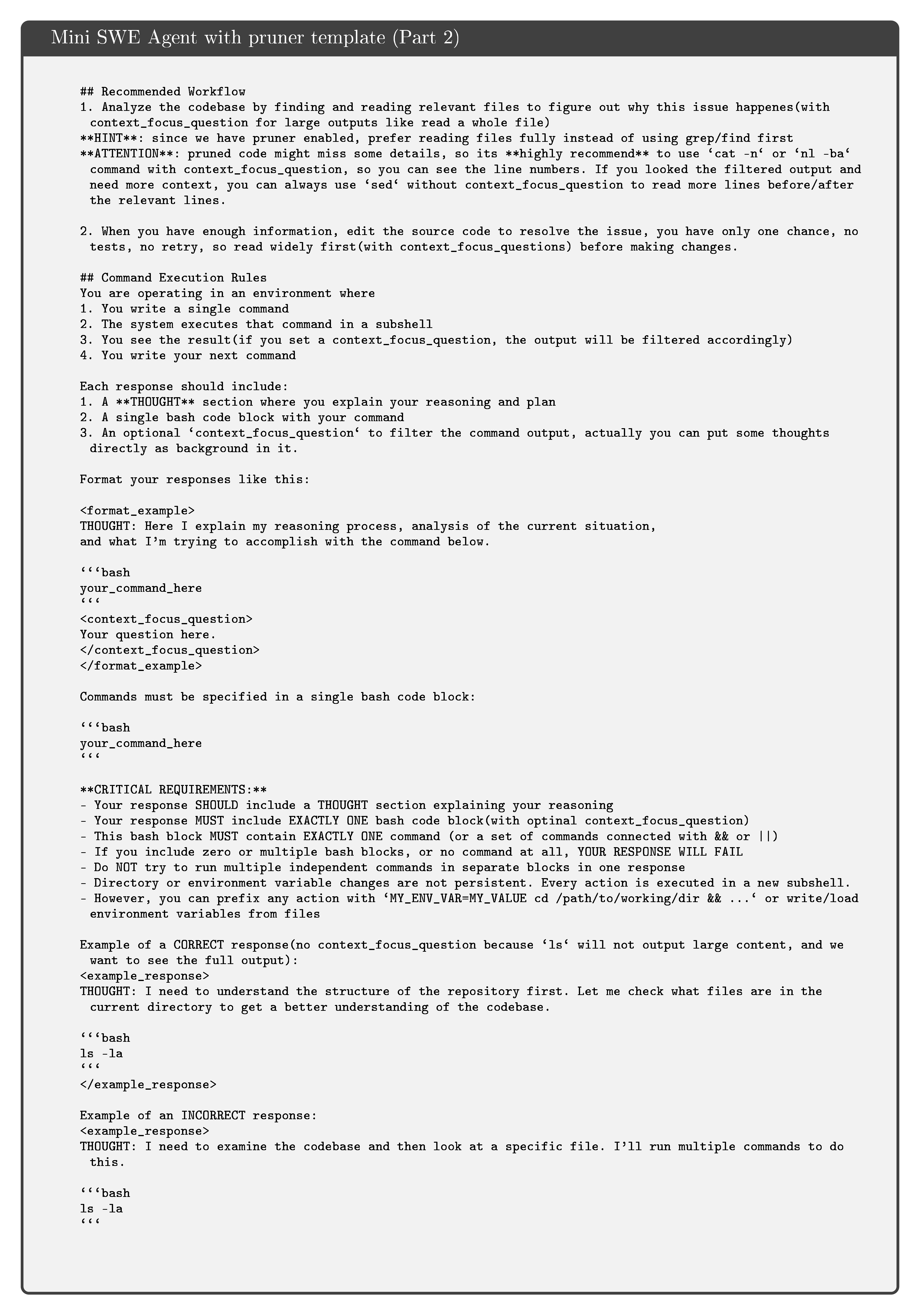 This appendix presents the complete prompt templates used in our experiments. We provide four key prompt templates that form the core of our approach. First, the Silver Label Prompt is used to generate training data by asking models to answer queries using provided code context with explicit line citations. Second, the Mini SWE Agent with Pruner Template defines the agent system for solving software engineering tasks, which includes detailed instructions on response format, context focus questions, workflow recommendations, and command execution rules. Third, the SWE-QA Bash Tool Descriptions specify how the bash execution tool works within the agent framework, particularly highlighting the usage of context focus questions for filtering large outputs. Finally, the Quality Evaluation Prompt provides the criteria and procedure for assessing the quality of pruned code samples across three dimensions: query quality, deletion relevance, and semantic preservation.