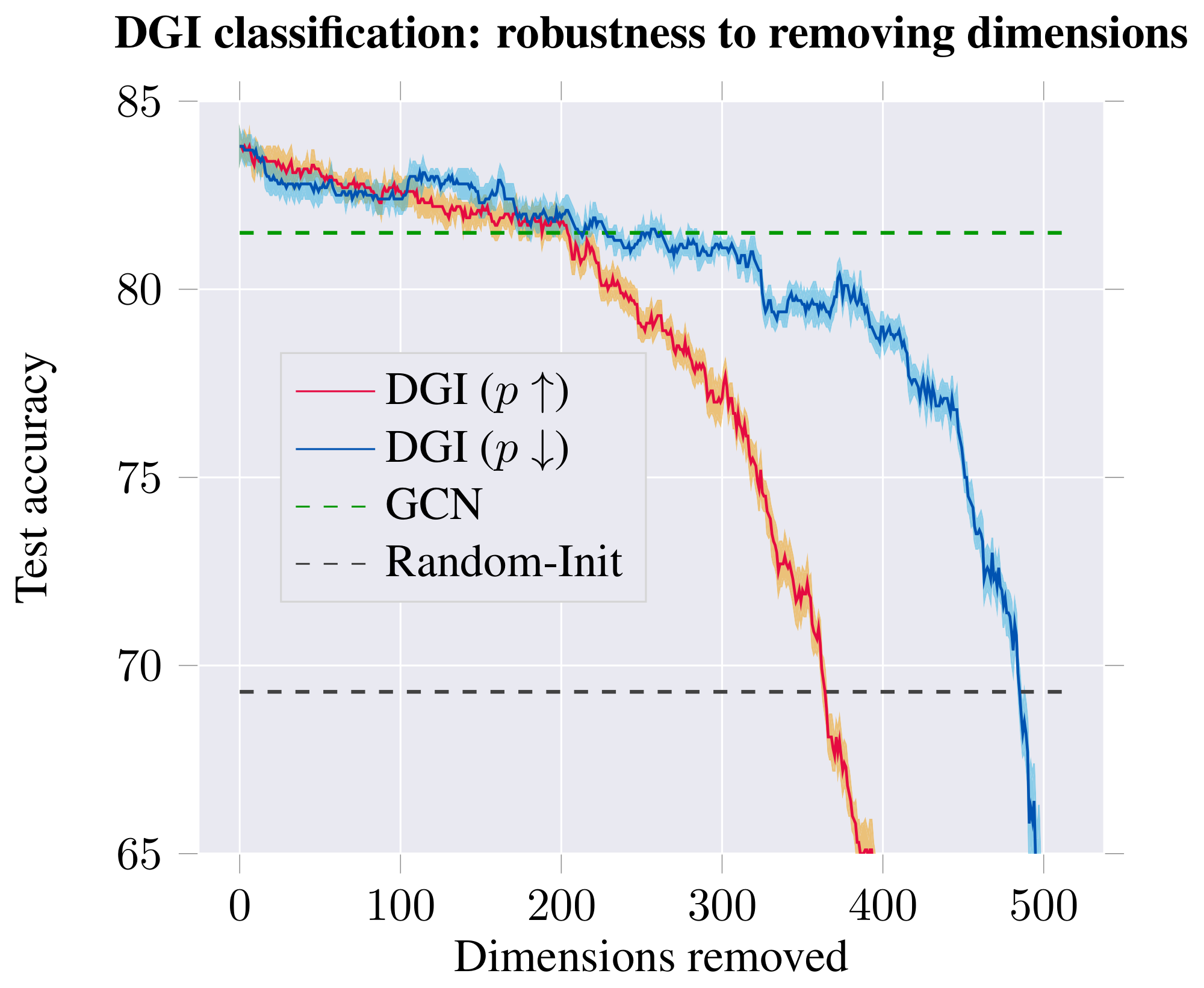 Figure 6: Classification performance (in terms of test accuracy of logistic regression; left) and discriminator performance (in terms of number of poorly discriminated positive/negative examples; right) on the learnt DGI embeddings, after removing a certain number of dimensions from the embedding—either starting with most distinguishing ($p\uparrow$) or least distinguishing ($p\downarrow$). ::::