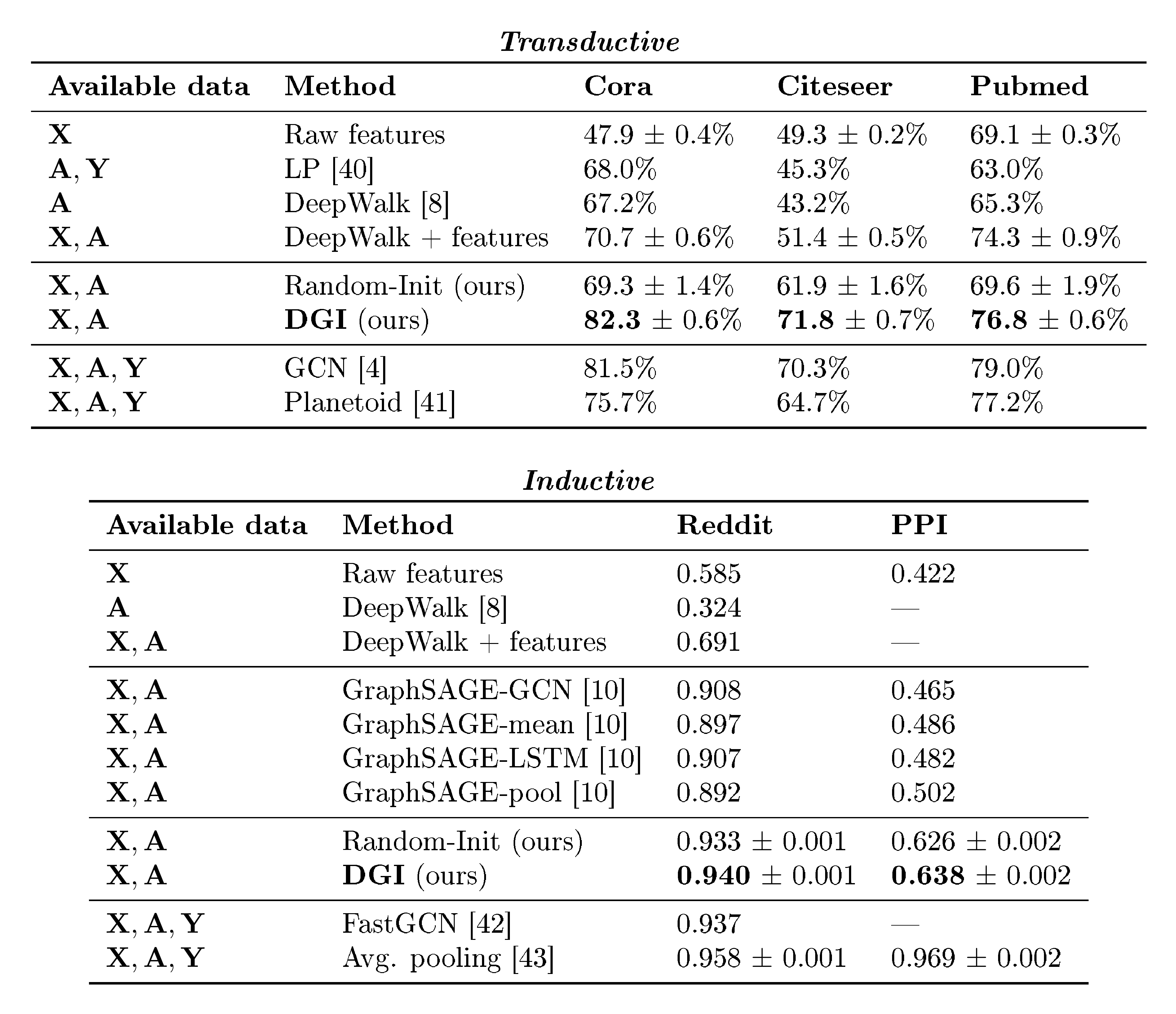 Table 2: Summary of results in terms of classification accuracies (on transductive tasks) or micro-averaged F$_1$ scores (on inductive tasks). In the first column, we highlight the kind of data available to each method during training (${\bf X}$ : features, ${\bf A}$ : adjacency matrix, ${\bf Y}$ : labels). "GCN" corresponds to a two-layer DGI encoder trained in a supervised manner.