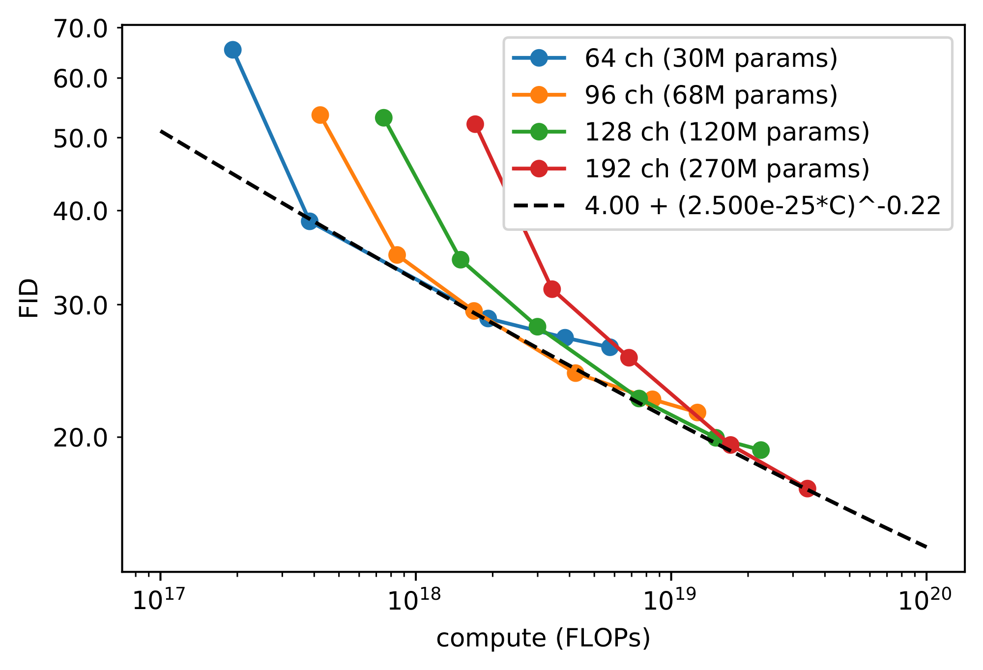 Figure 10 shows how FID and NLL improve relative to theoretical training compute.[^3] The FID curve looks approximately linear on a log-log plot, suggesting that FID scales according to a power law (plotted as the black dashed line). The NLL curve does not fit a power law as cleanly, suggesting that validation NLL scales in a less-favorable manner than FID. This could be caused by a variety of factors, such as 1) an unexpectedly high irreducible loss ([15]) for this type of diffusion model, or 2) the model overfitting to the training distribution. We also note that these models do not achieve optimal log-likelihoods in general because they were trained with our $L_{\text{hybrid}}$ objective and not directly with $L_{\text{vlb}}$ to keep both good log-likelihoods and sample quality.
