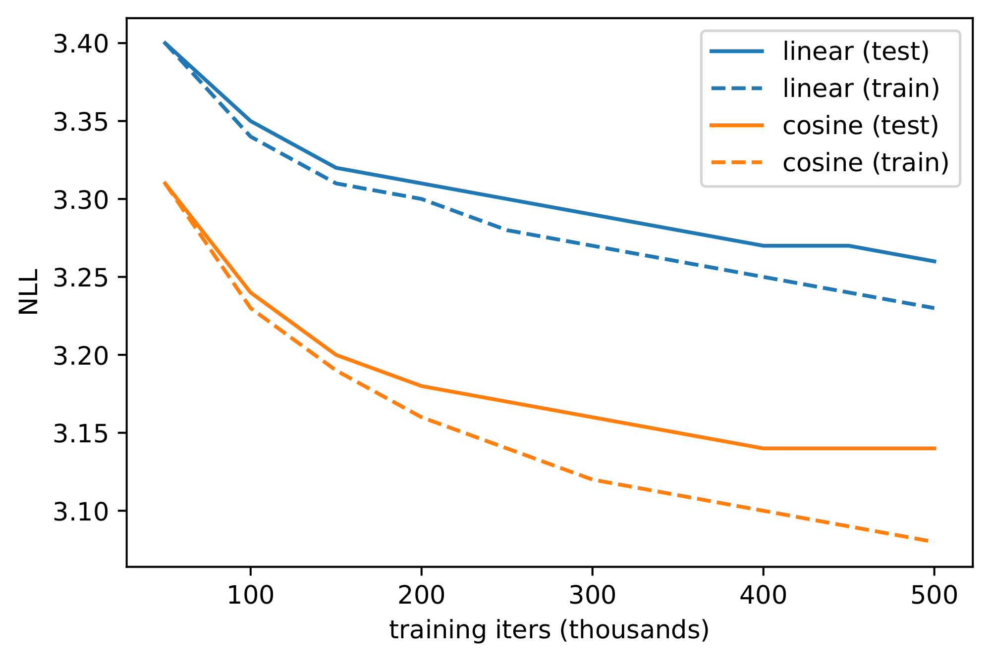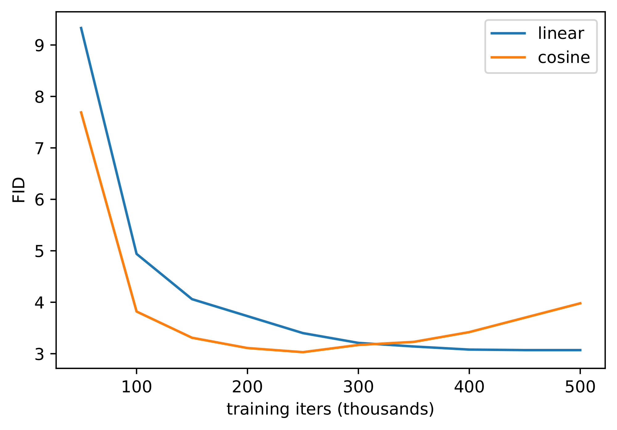 Figure 16: FID (top) and NLL (bottom) over the course of training for two CIFAR-10 models, both with dropout 0.1. The model trained with the linear schedule learns more slowly, but does not overfit as quickly. When too much overfitting occurs, we observed overfitting artifacts similar to those from [41], which is reflected by increasing FID. ::::
