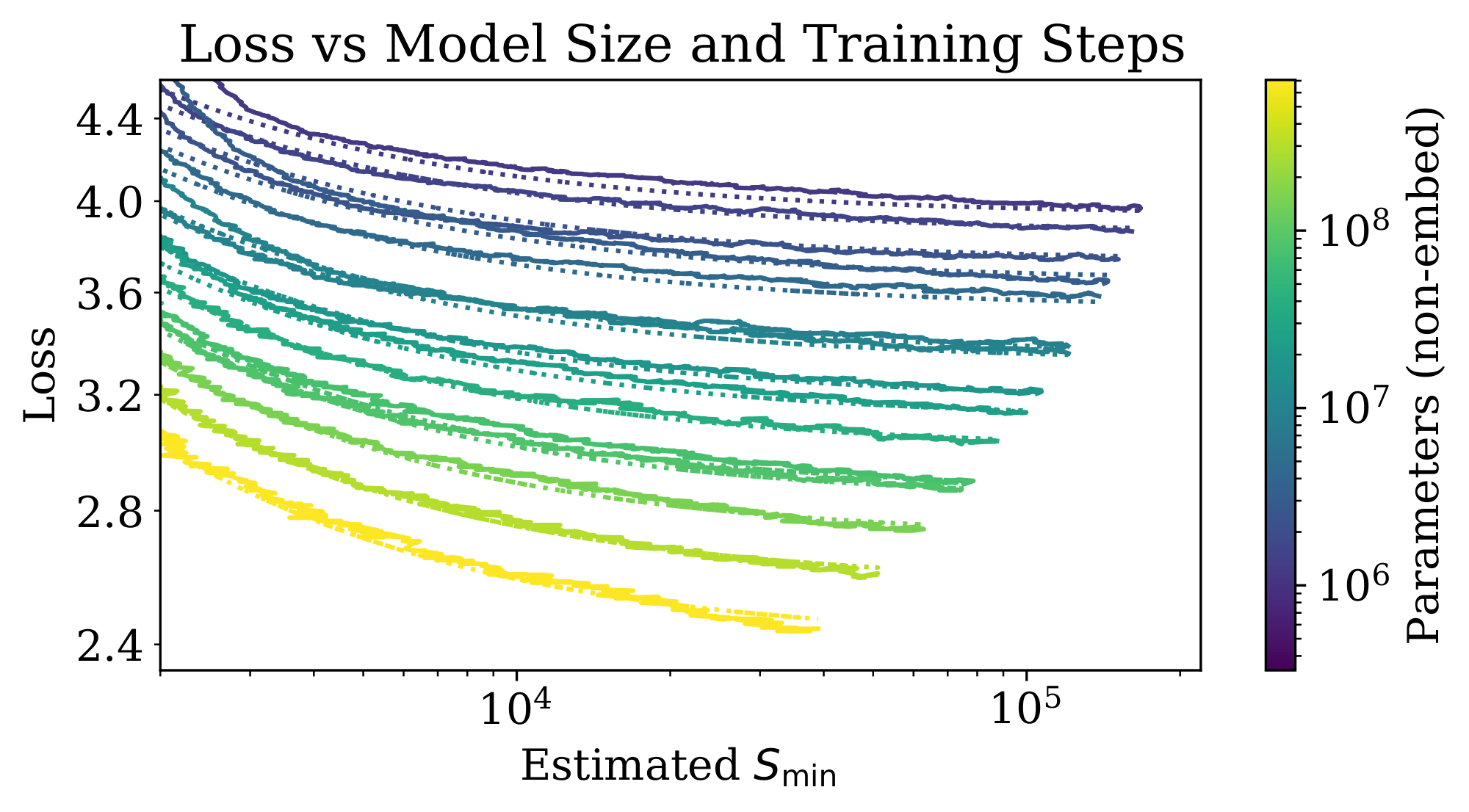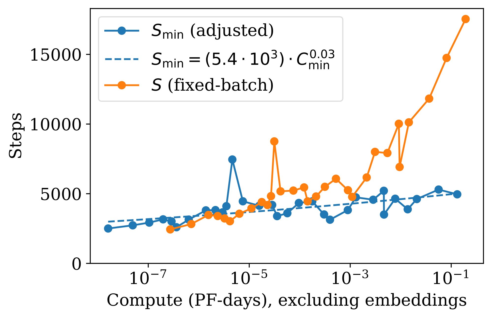 where $S_c \approx 2.1 \times 10^3$ and $\alpha_S \approx 0.76$, and $S_{\rm min}(S)$ is the minimum possible number of optimization steps (parameter updates) estimated using Equation 13.