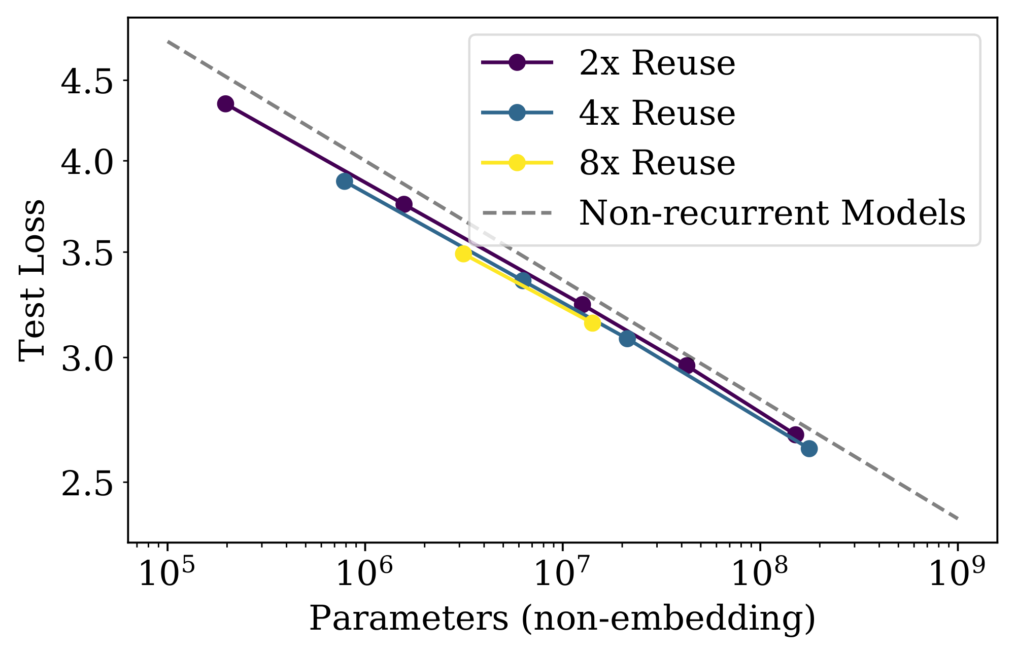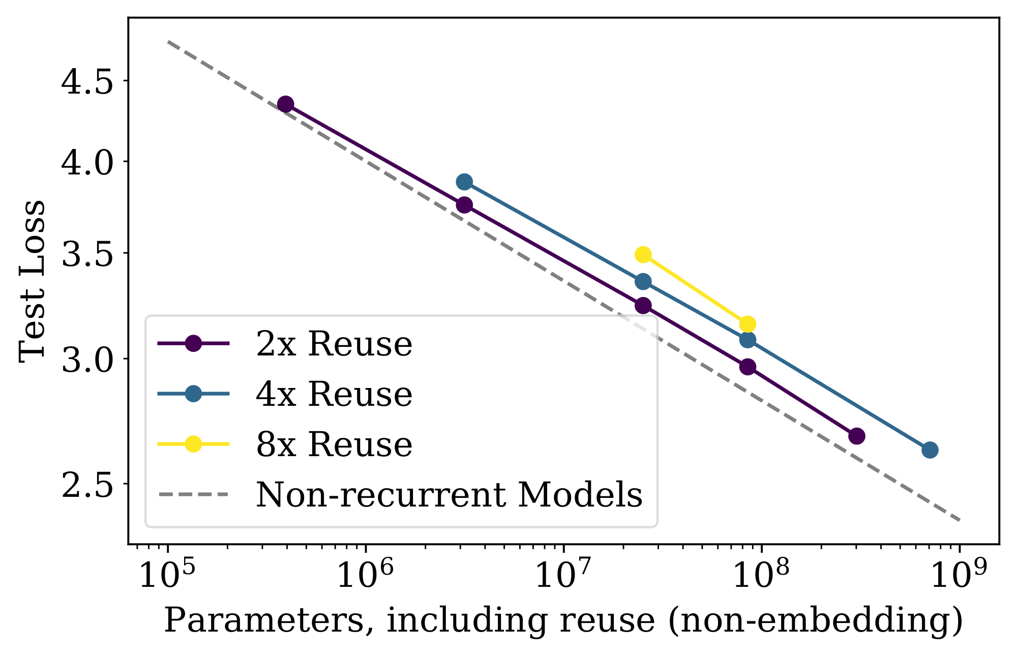 Figure 17: We compare recurrent Transformers [11], which re-use parameters, to standard Transformers. Recurrent Transformers perform slightly better when comparing models with equal parameter count, but slightly worse when accounting for reuse and comparing per FLOP. ::::