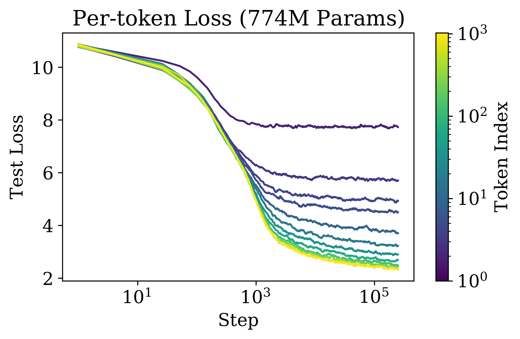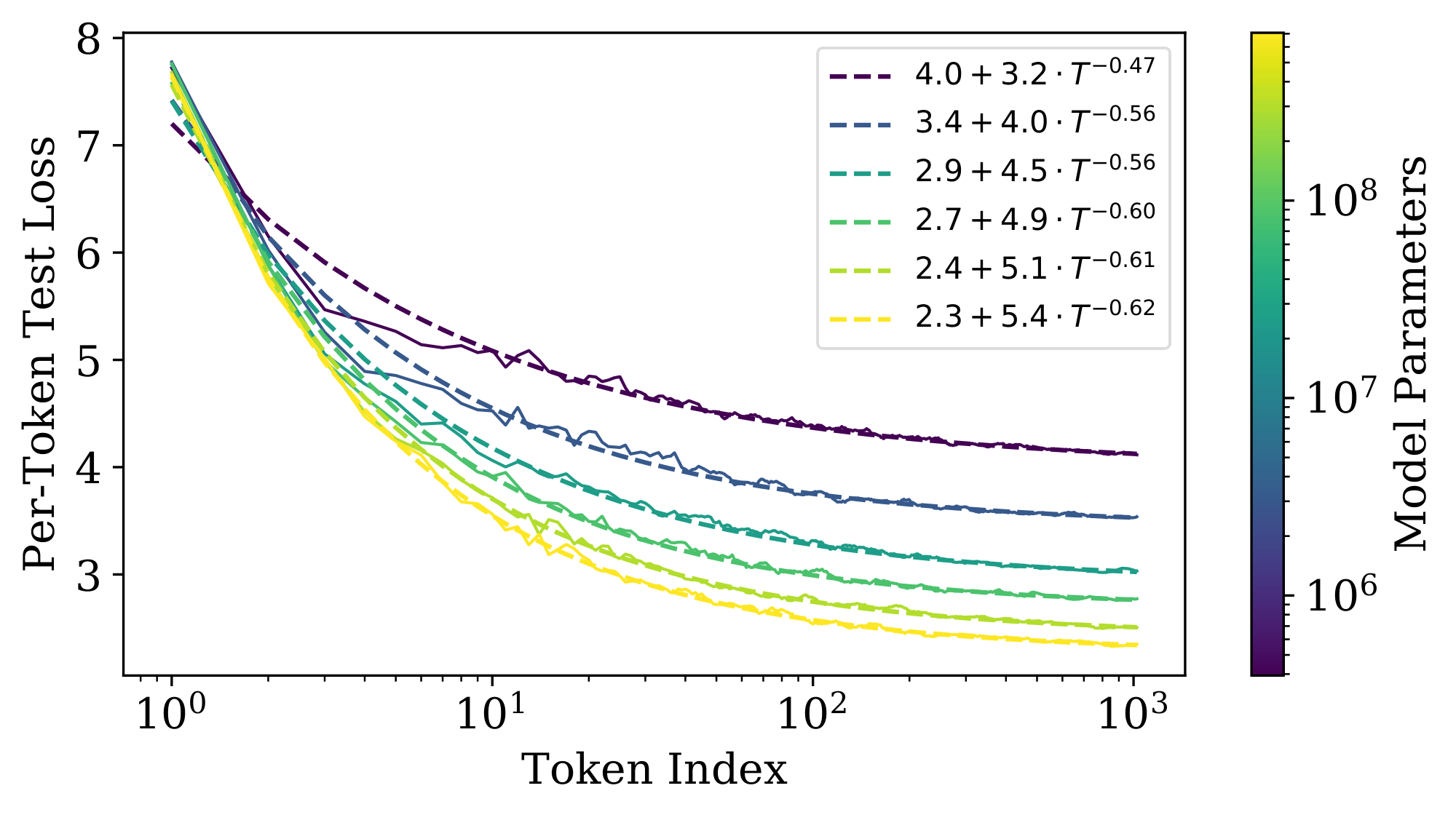 Fixing model size, it appears that the loss scales as a power-law as a function of position $T$ in the context, see Figure 20. This may be a consequence of underlying power-law correlations in language [48, 49, 50], or a more general feature of the model architecture and optimization. It provides some suggestion for the potential benefits (or lack thereof) from training on larger contexts. Not only do larger models converge to better performance at $T=1024$, but they also improve more quickly at early tokens, suggesting that larger models are more efficient at detecting patterns with less contextual information. In the right-hand plot we show how per-token performance varies for a fixed model as a function of the training step. The model begins by learning short-range information, and only learns longer-range correlations later in training.