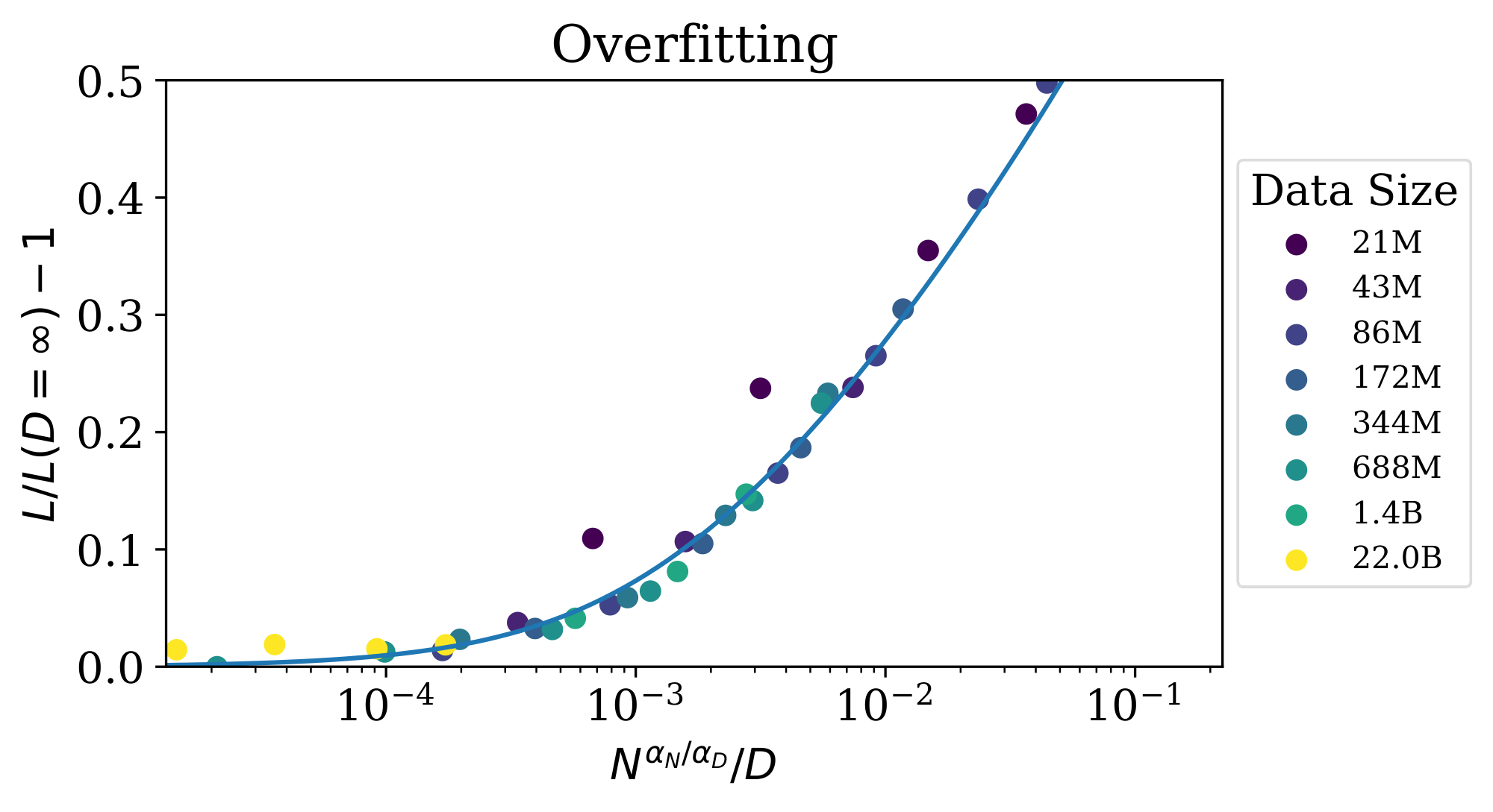 Equation 1 and 2 together suggest that as we increase the model size, we should increase the dataset size sublinearly according to $D \propto N^{\frac{\alpha_N}{\alpha_D}} \sim N^{0.74}$. In fact, we find that there is a single equation combining Equation 1 and 2 that governs the simultaneous dependence on $N$ and $D$ and governs the degree of overfitting: