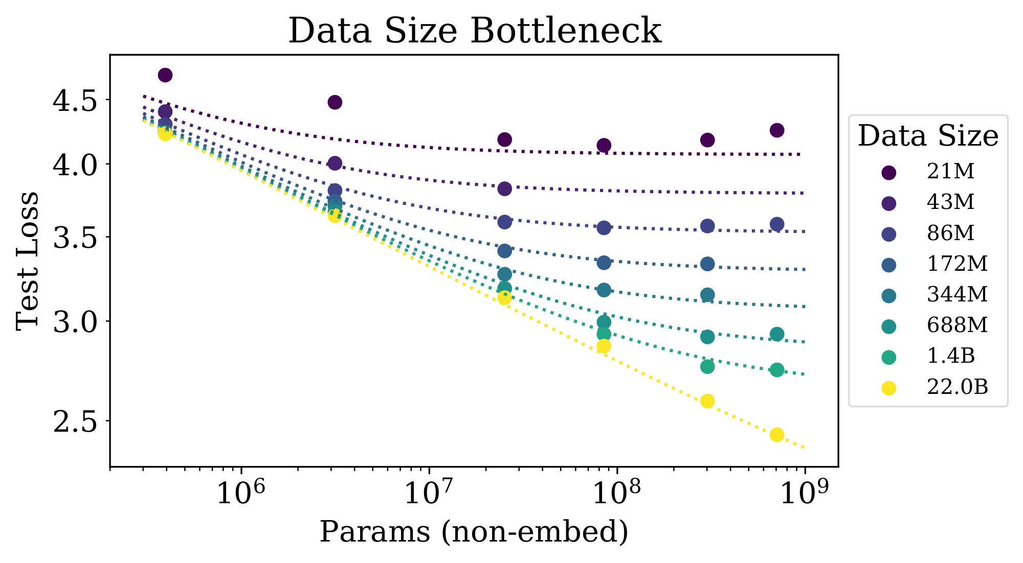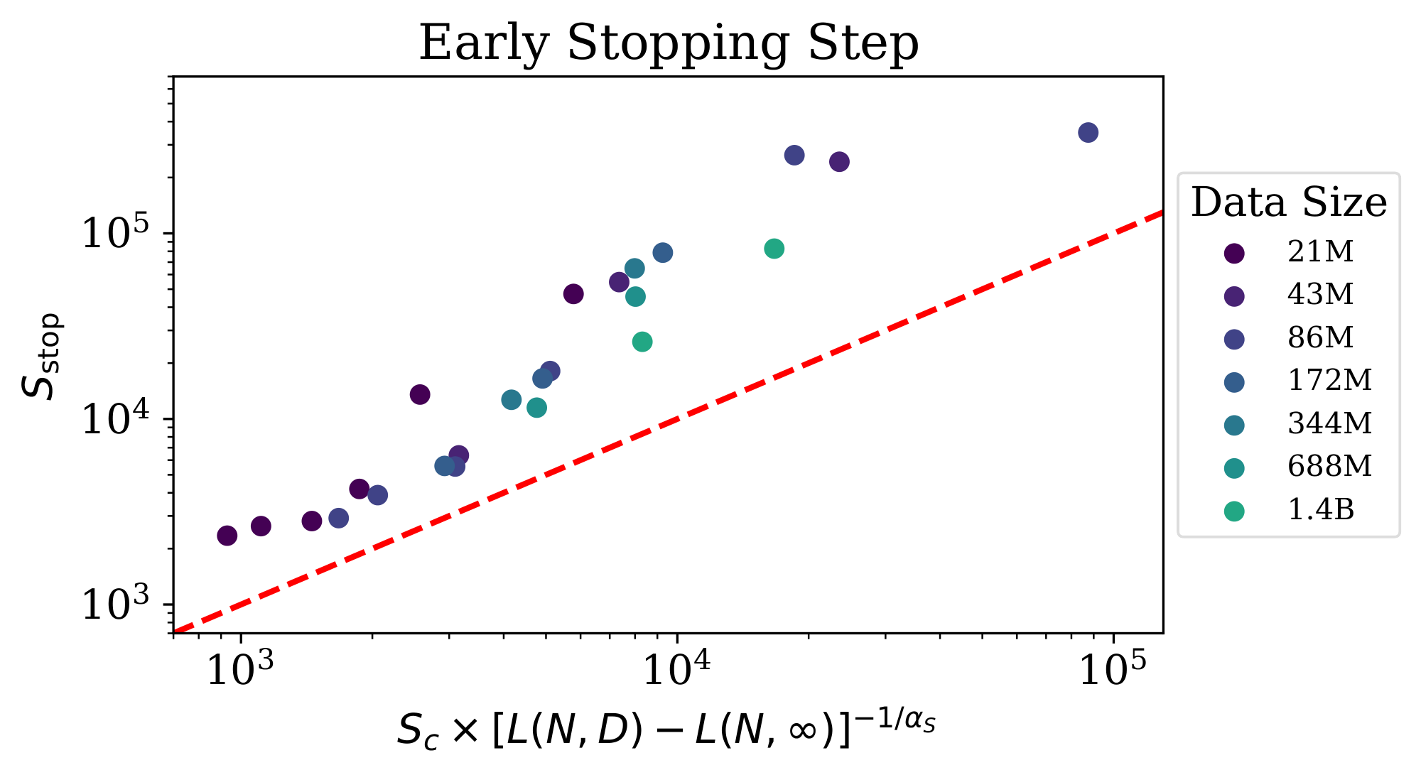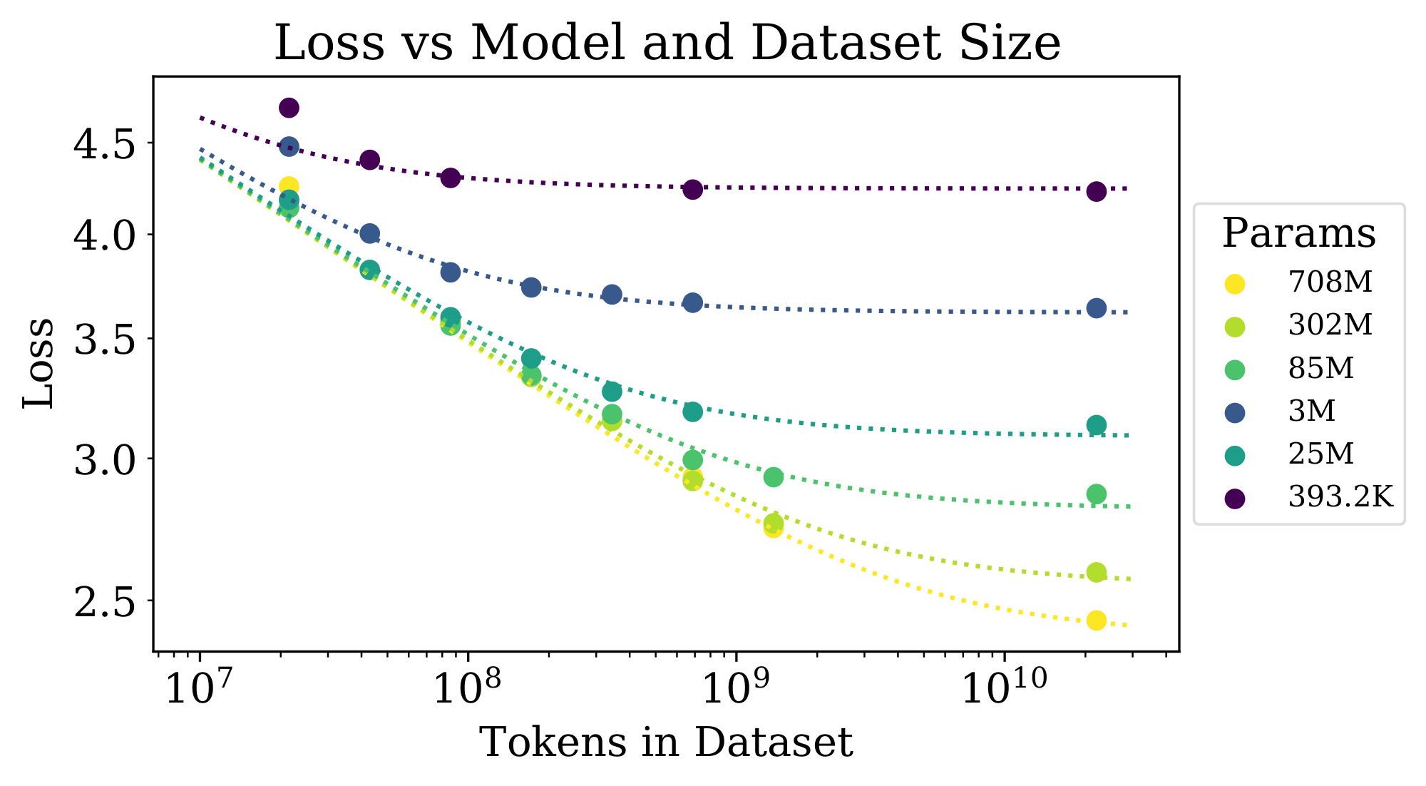 $ L(D) = \left(D_{\mathrm{c}}/D\right)^{\alpha_D}; \alpha_D \sim 0.095, \quad D_{\mathrm{c}} \sim 5.4 \times 10^{13} \text{(tokens)}\tag{2} $