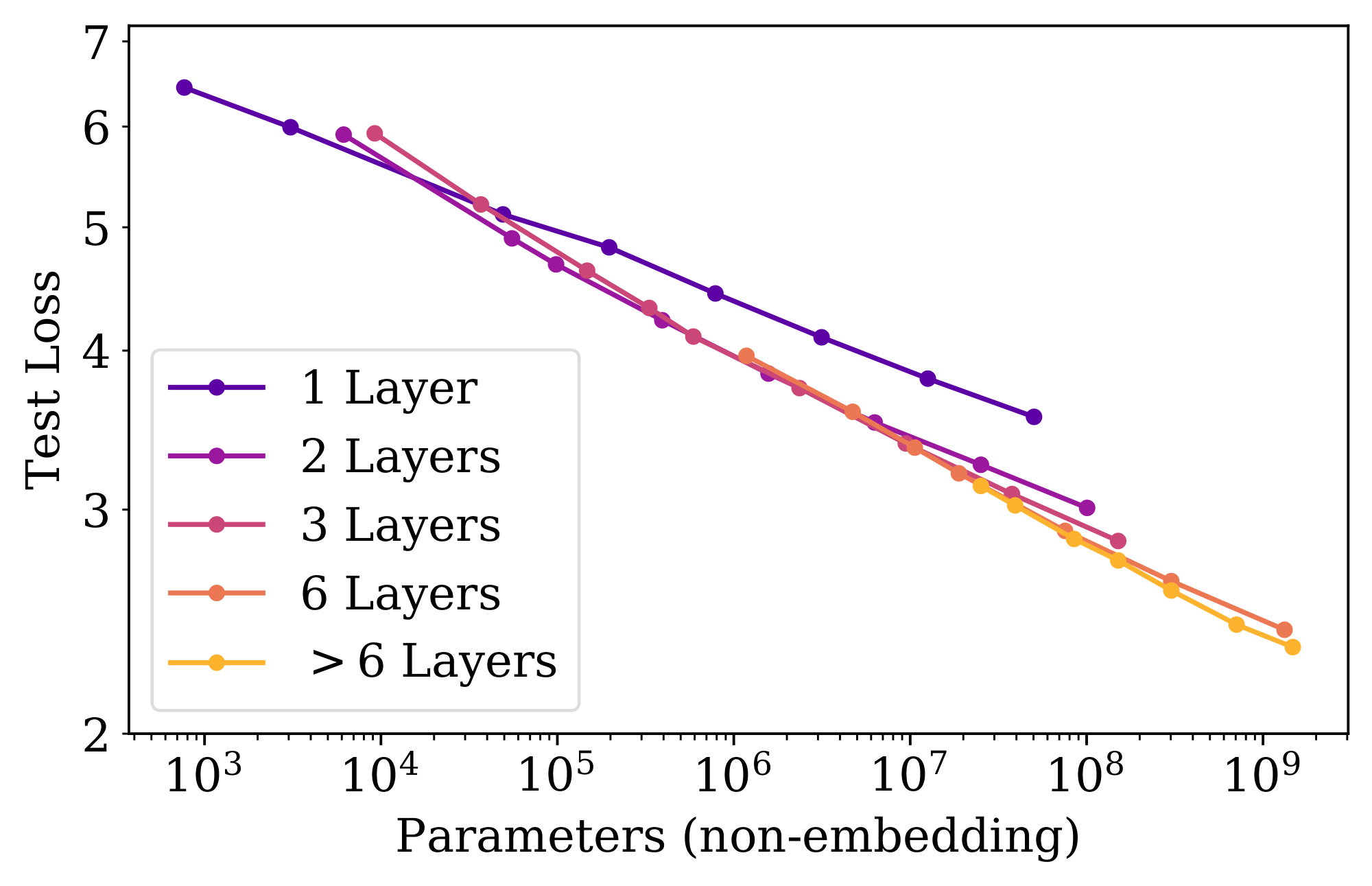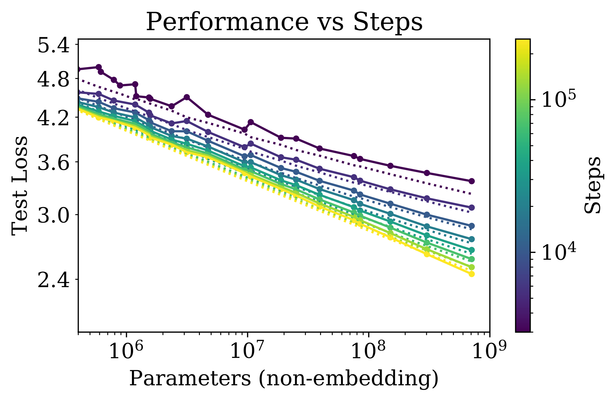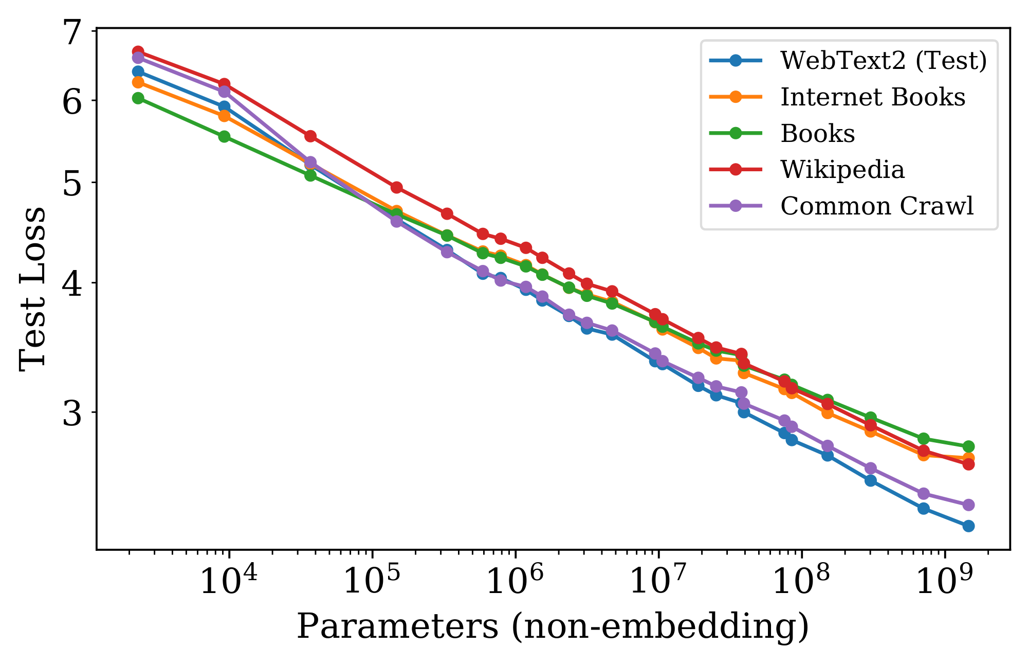 As shown in Figure 1, we find a steady trend with non-embedding parameter count $N$, which can be fit to the first term of Equation 5, so that