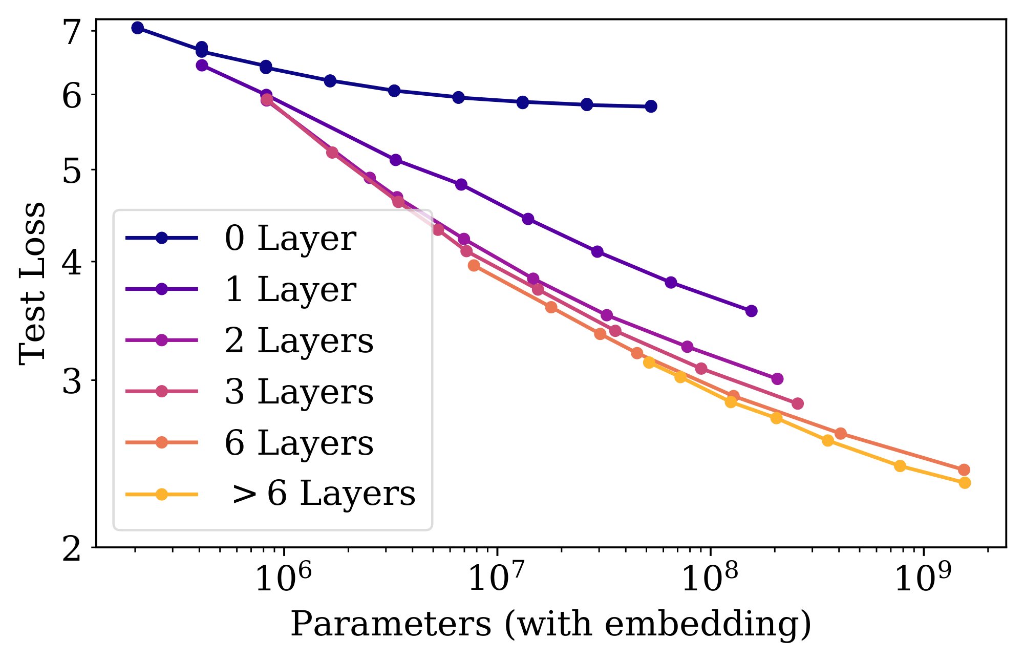 Figure 6: Left: When we include embedding parameters, performance appears to depend strongly on the number of layers in addition to the number of parameters. Right: When we exclude embedding parameters, the performance of models with different depths converge to a single trend. Only models with fewer than 2 layers or with extreme depth-to-width ratios deviate significantly from the trend. ::::