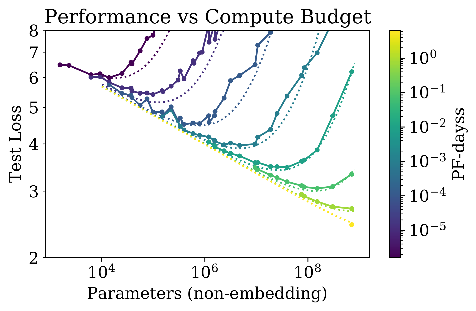 The test loss of a Transformer trained to autoregressively model language can be predicted using a power-law when performance is limited by only either the number of non-embedding parameters $N$, the dataset size $D$, or the optimally allocated compute budget $C_{\rm min}$ (see Figure 1):